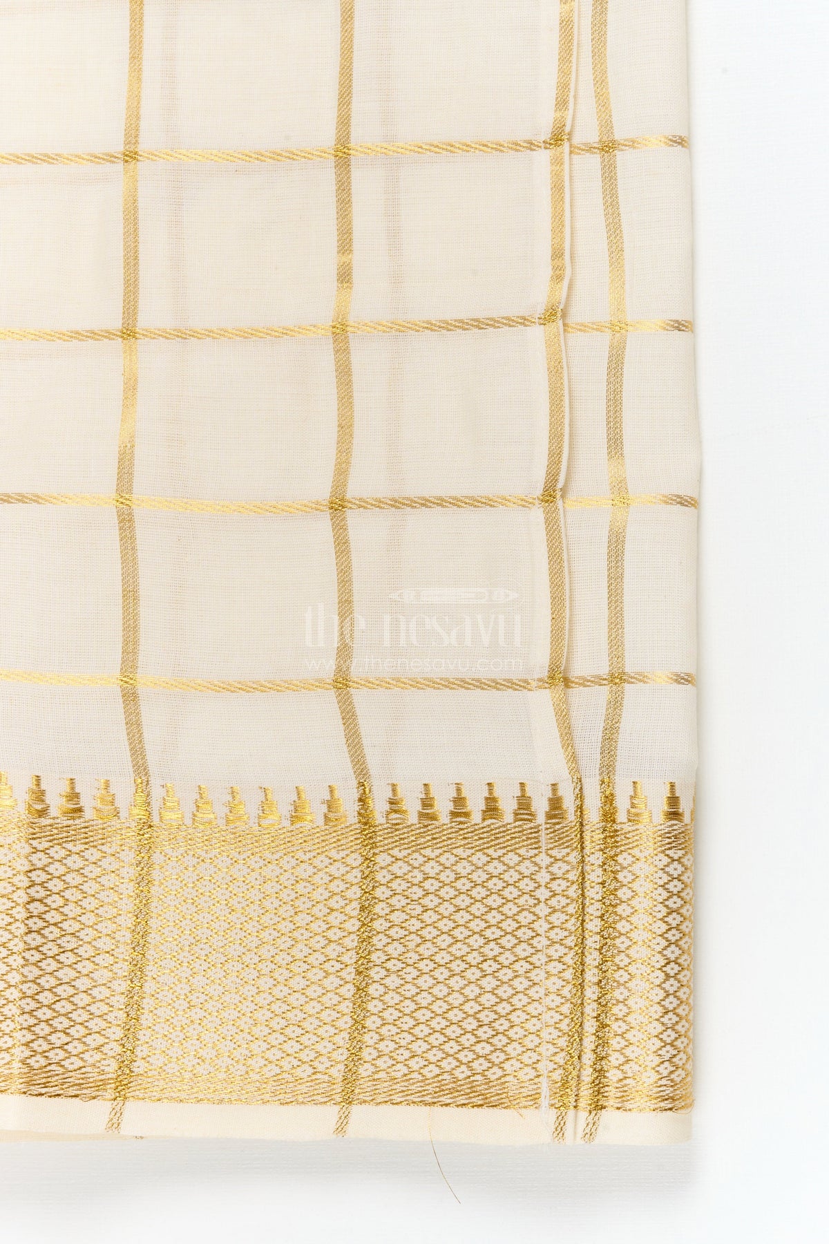 - Features gold-threaded checked design with a rich zari border