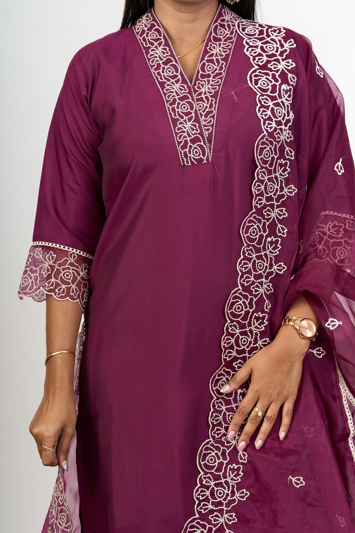 Step into sophistication with this elegant purple kurta set, designed with intricate white floral embroidery that exudes timeless beauty. Made from premium chiffon fabric, the kurta features delicate embellishments along the neckline and hem, while the matching dupatta boasts fine floral embroidery borders for a regal finish. Paired with a comfortable straight pant, this set is perfect for festive gatherings, weddings, or special events. The lightweight chiffon ensures breathability and comfort, making it easy to wear for long hours while maintaining a stunning appearance.