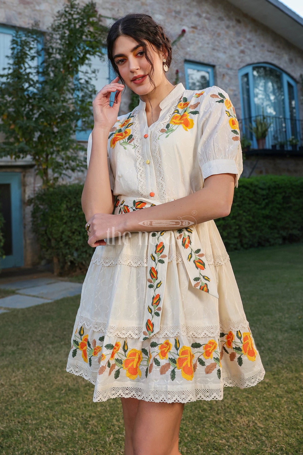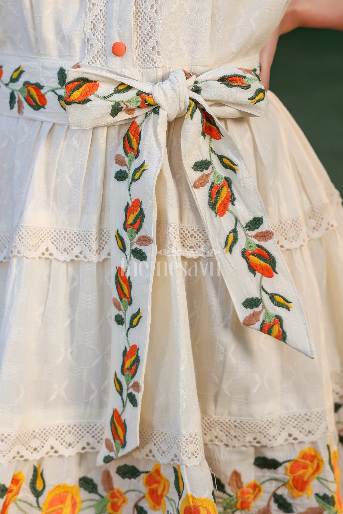 Radiate elegance in this women’s designer dress, a perfect blend of classic charm and modern sophistication. Crafted from soft cotton, this ivory dress is adorned with vibrant floral embroidery that exudes grace and femininity. The lace detailing along the hem adds a delicate touch, while the belted waist ensures a flattering silhouette. Perfect for garden parties or festive events, this dress offers both style and comfort. Team it with minimalist accessories and nude heels for an effortlessly chic look that’s bound to leave an impression.