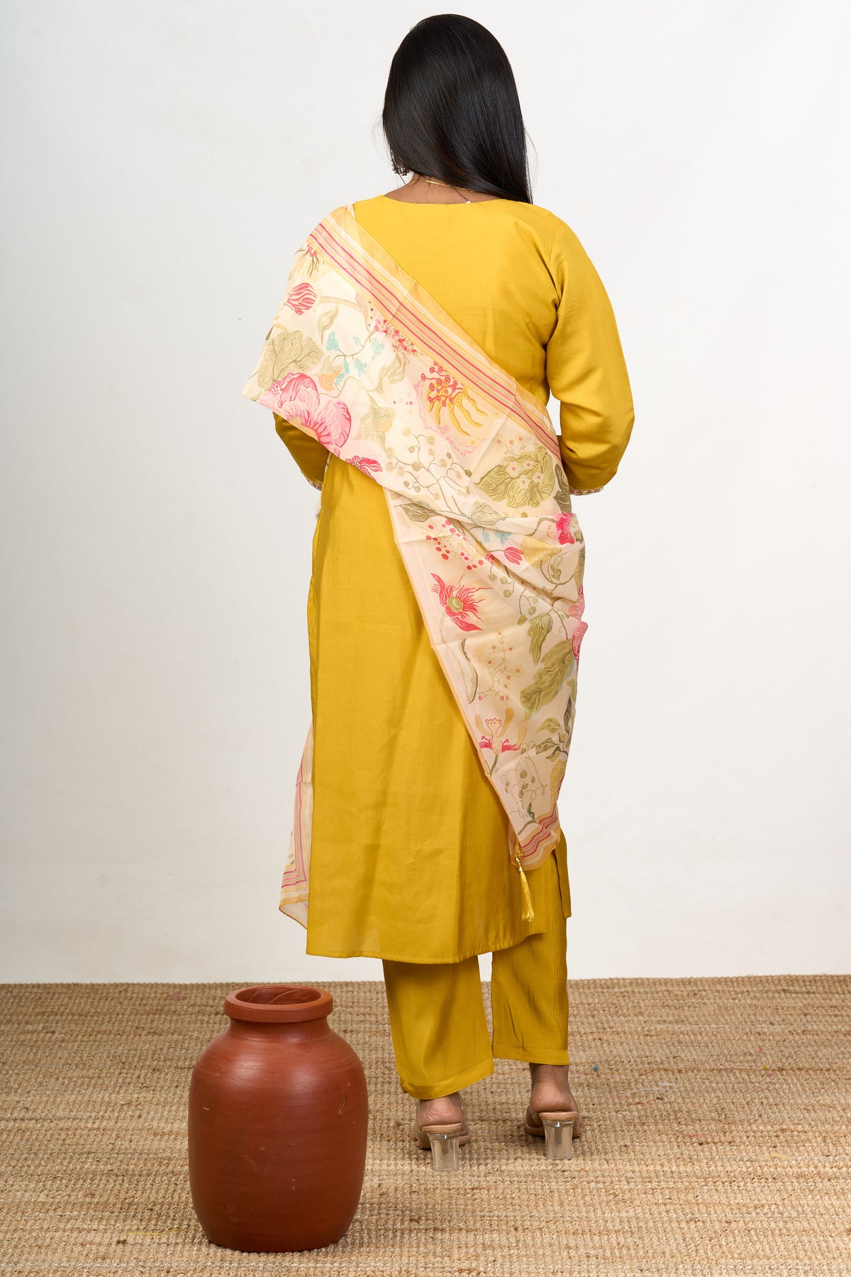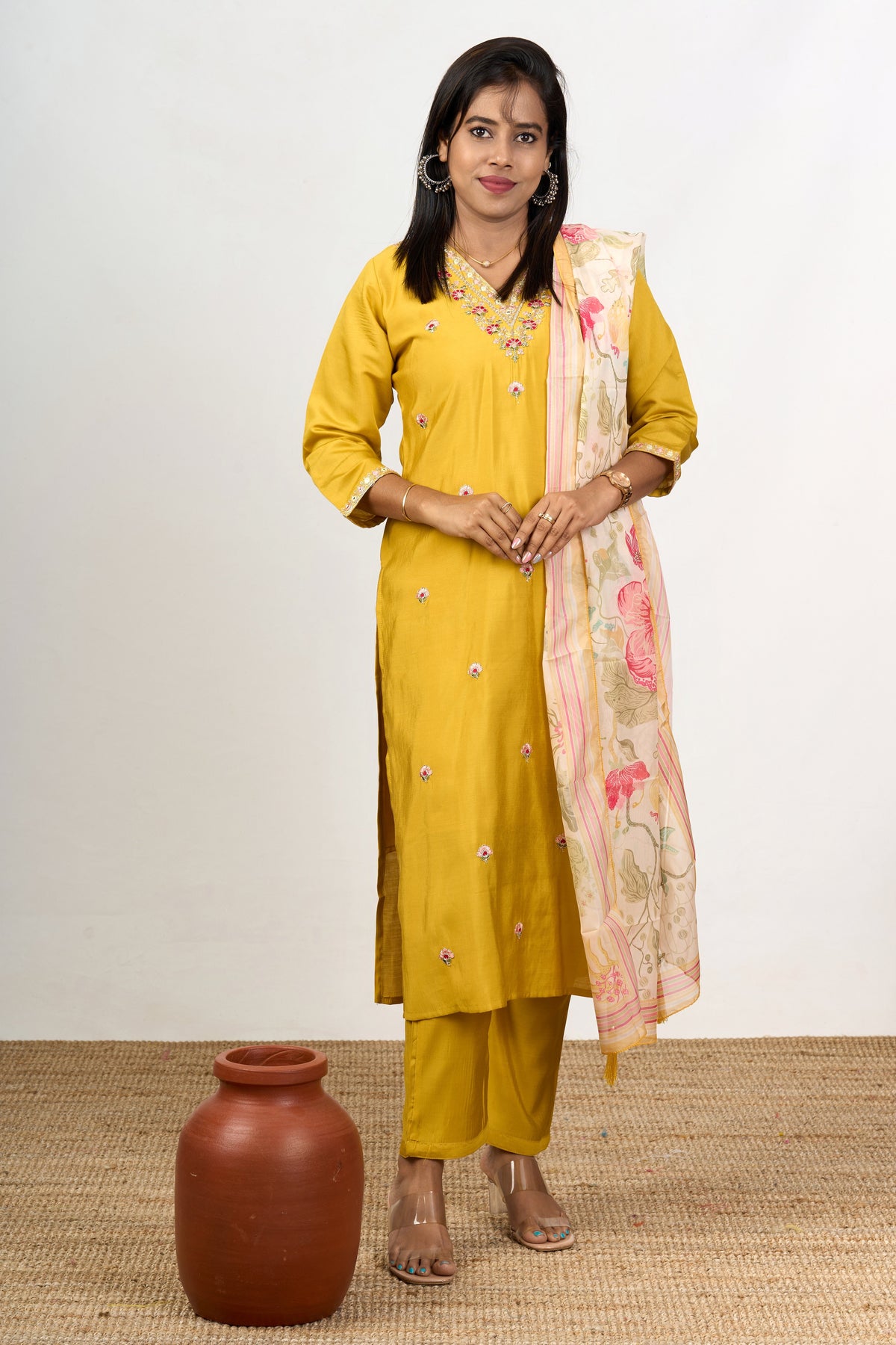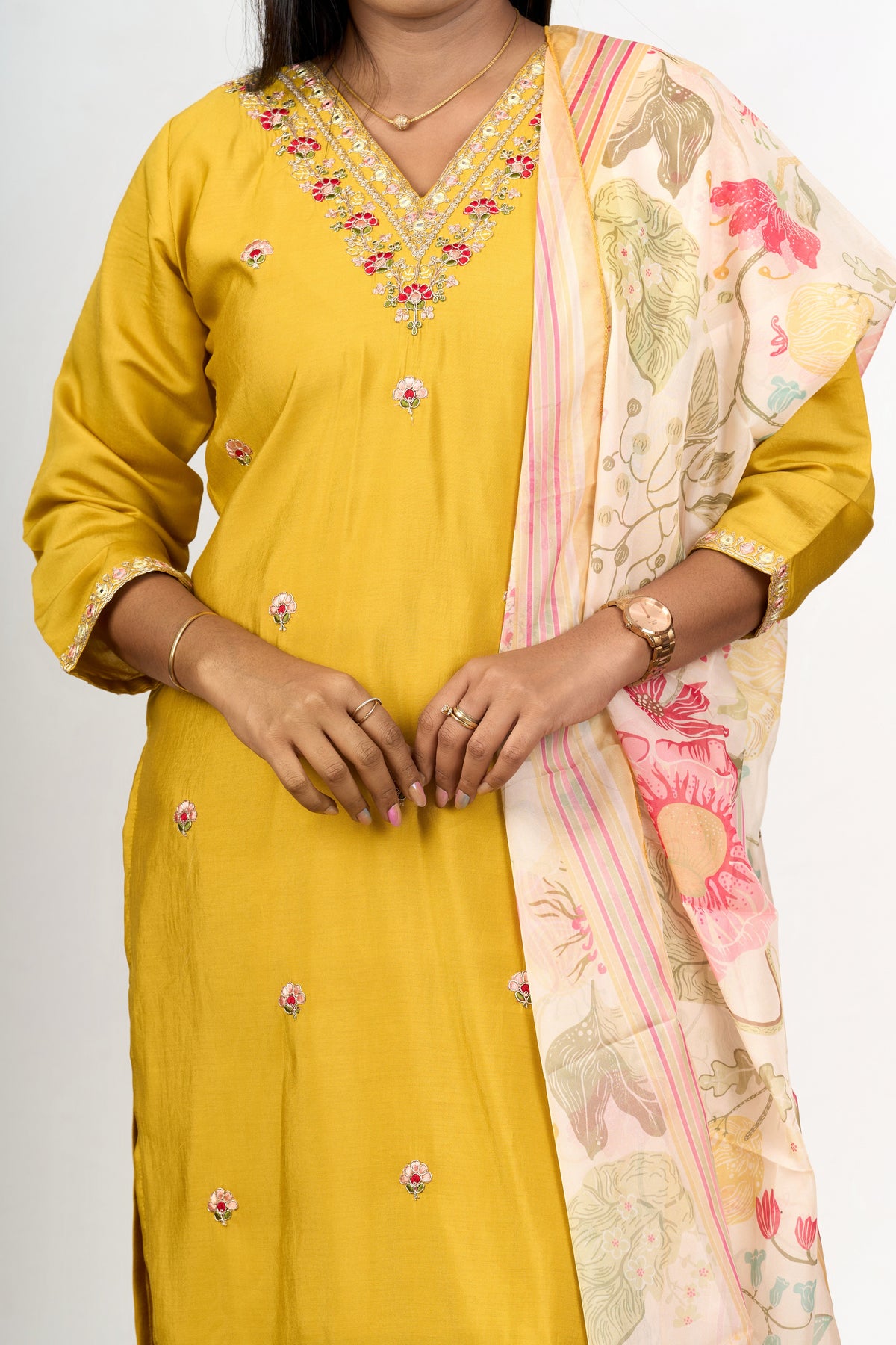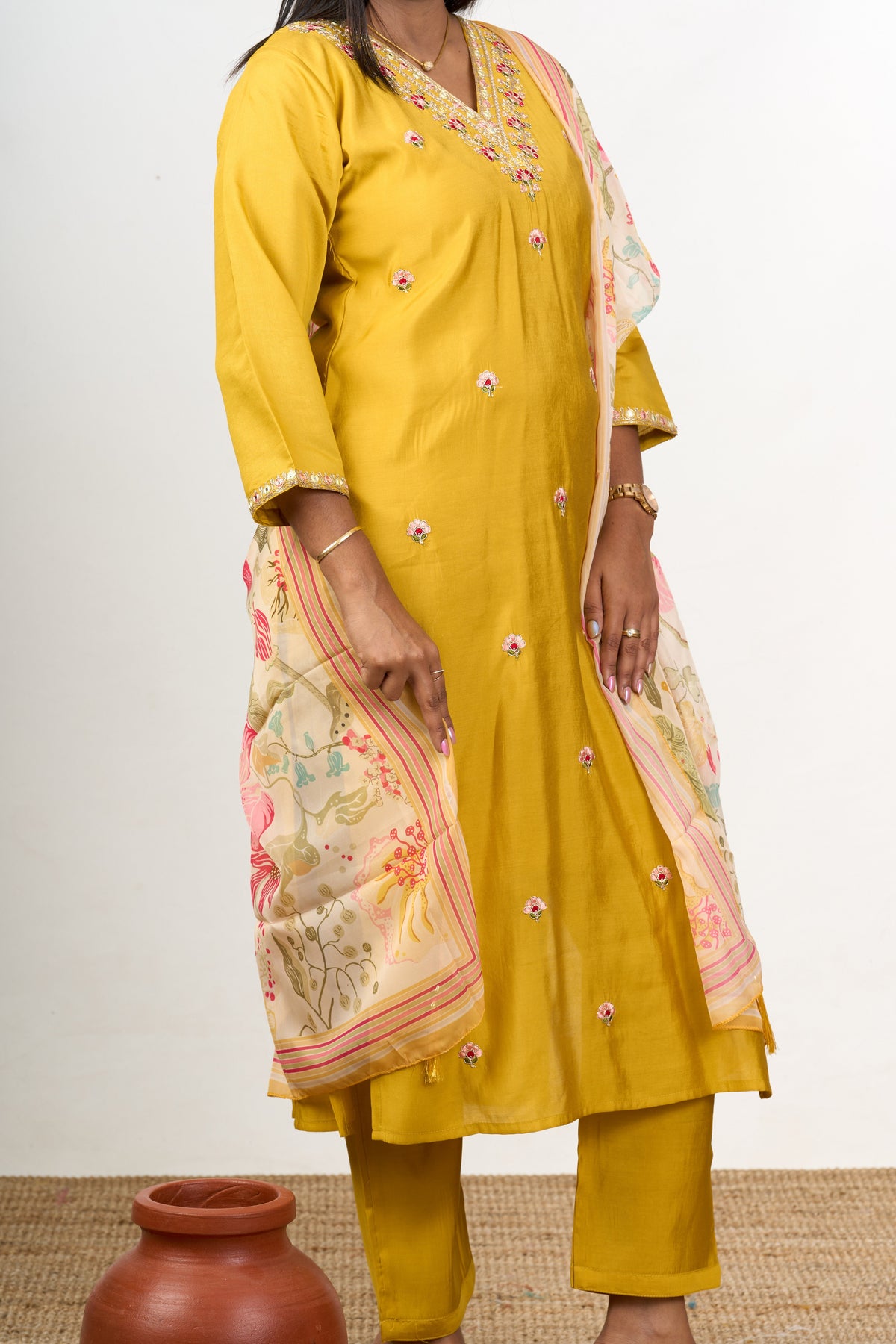 Elevate your ethnic wardrobe with this radiant kurti pant set with dupatta, crafted in a mustard yellow blend silk fabric. The straight kurti is adorned with dainty floral embroidery that enhances its elegance, complemented by tailored pants for a sleek silhouette. The set includes a lightweight printed dupatta featuring intricate floral patterns, adding a soft contrast to the vibrant kurti. Designed to offer both style and comfort, this ensemble is perfect for festive events like Diwali or family gatherings, ensuring you stand out with effortless grace. The breathable silk blend fabric makes it ideal for extended wear, offering unmatched ease and sophistication.