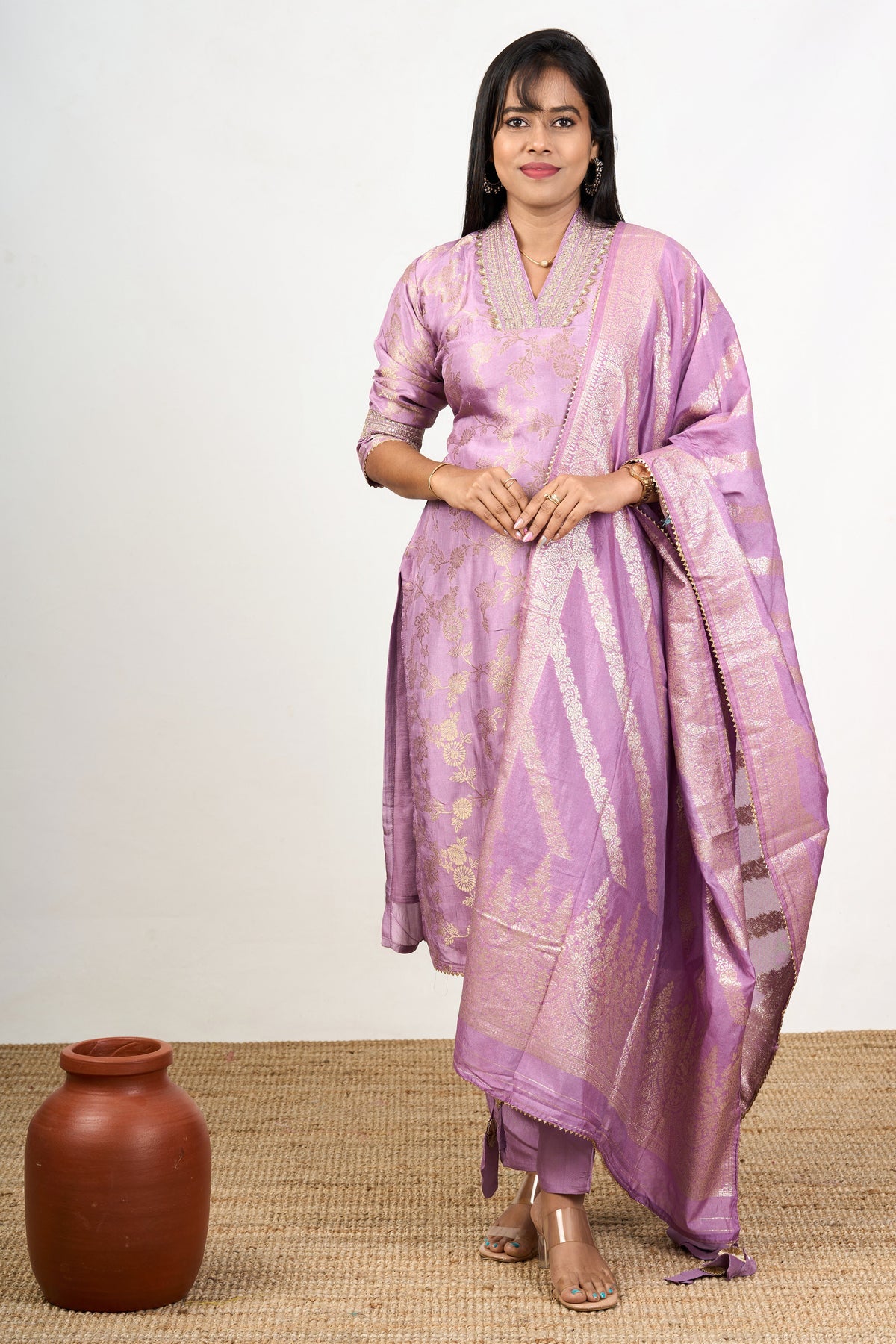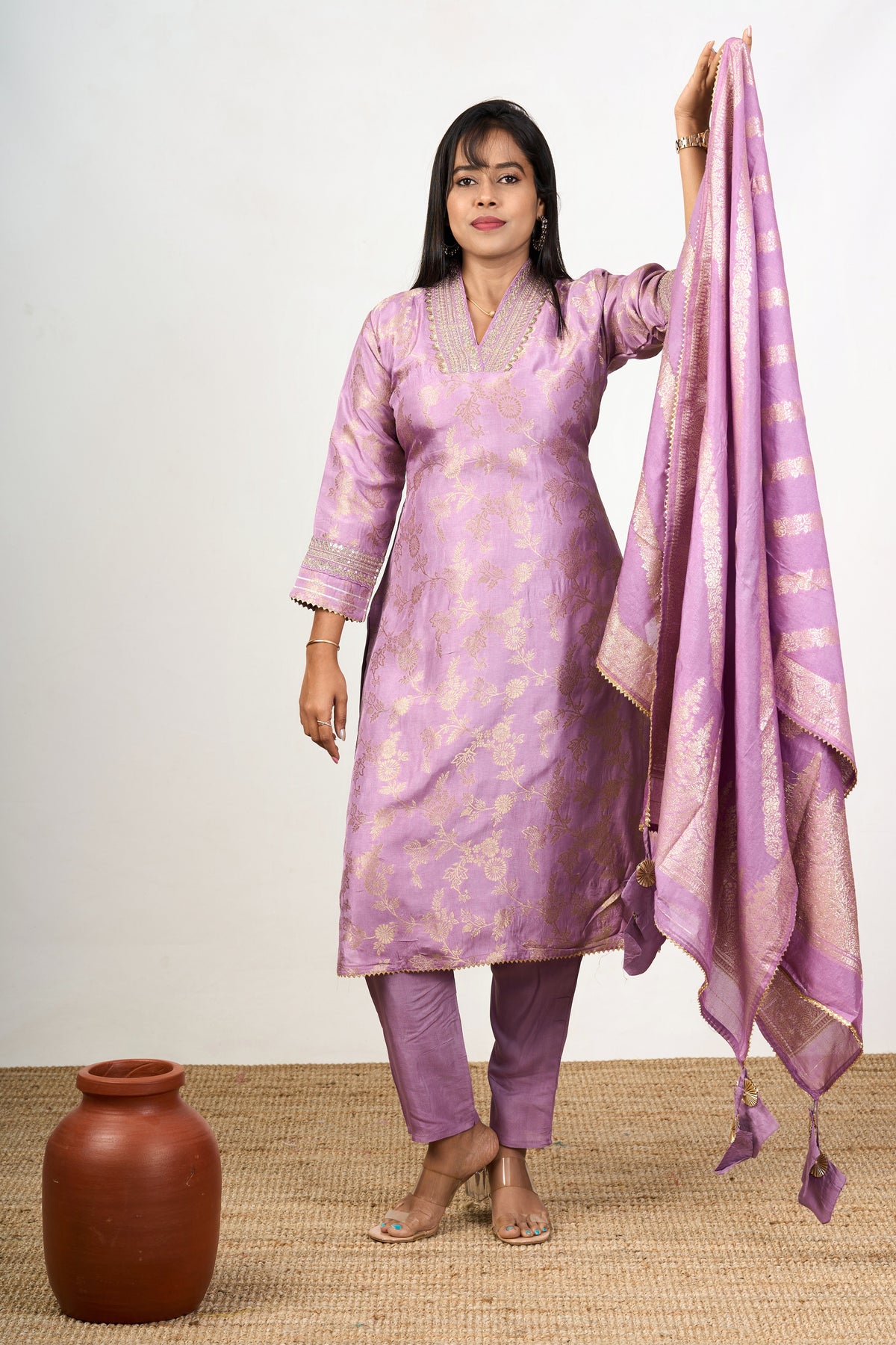 Experience luxury with this unique kurta set, crafted in a stunning lavender art silk fabric adorned with intricate gold motifs. The kurta features a richly embroidered neckline and tailored pants for a refined silhouette. The set is completed with a soft dupatta detailed with complementary gold patterns, adding a regal touch. Perfect for festive occasions such as Durga Puja or formal gatherings, this outfit blends elegance and tradition effortlessly. The lightweight art silk ensures comfort, while the luxurious design ensures you stand out in style.