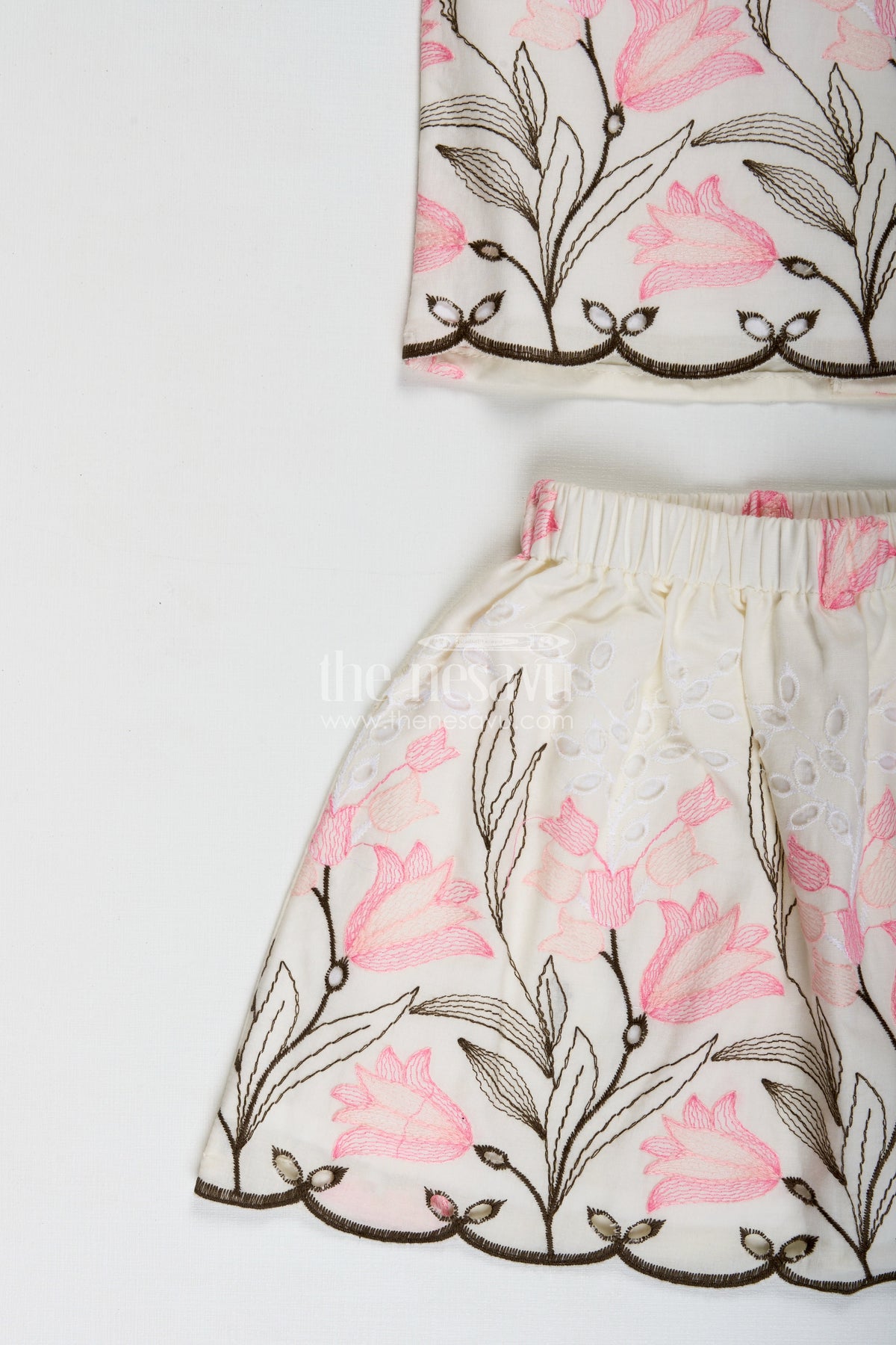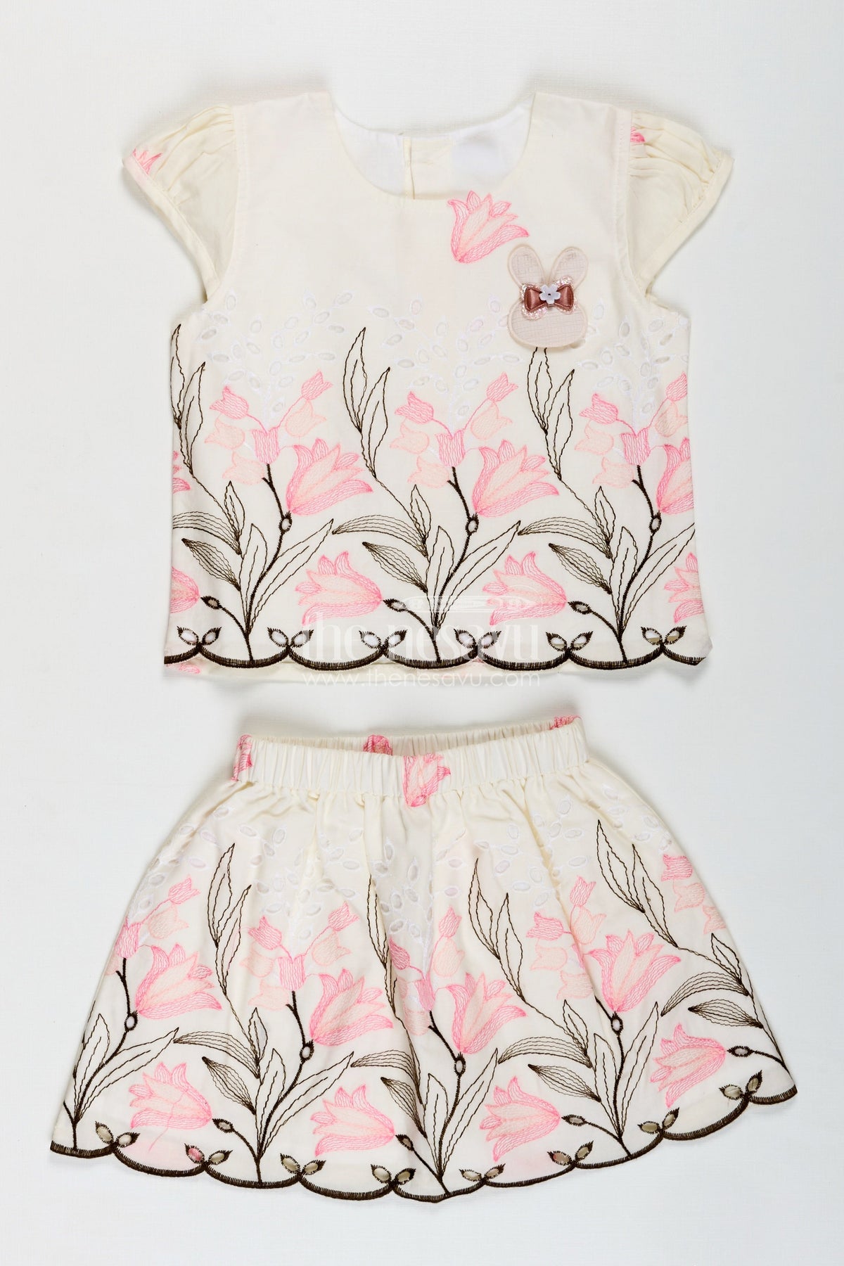 Baby Girl Casual Set for Comfortable Play is designed for the little adventurer who loves both comfort and cuteness. This two-piece set features a cream cotton top and skirt, both beautifully decorated with intricate thread embroidery of pastel floral motifs in blue, peach, and soft pink tones. The top comes with adorable cap sleeves and a playful bunny patch detail, adding a whimsical touch. The skirt has a soft elastic waistband for a snug yet gentle fit, allowing your baby girl to move freely during active play. Crafted from breathable cotton with decorative scalloped hems, this outfit is as practical as it is charming, making it a go-to choice for daily fun.