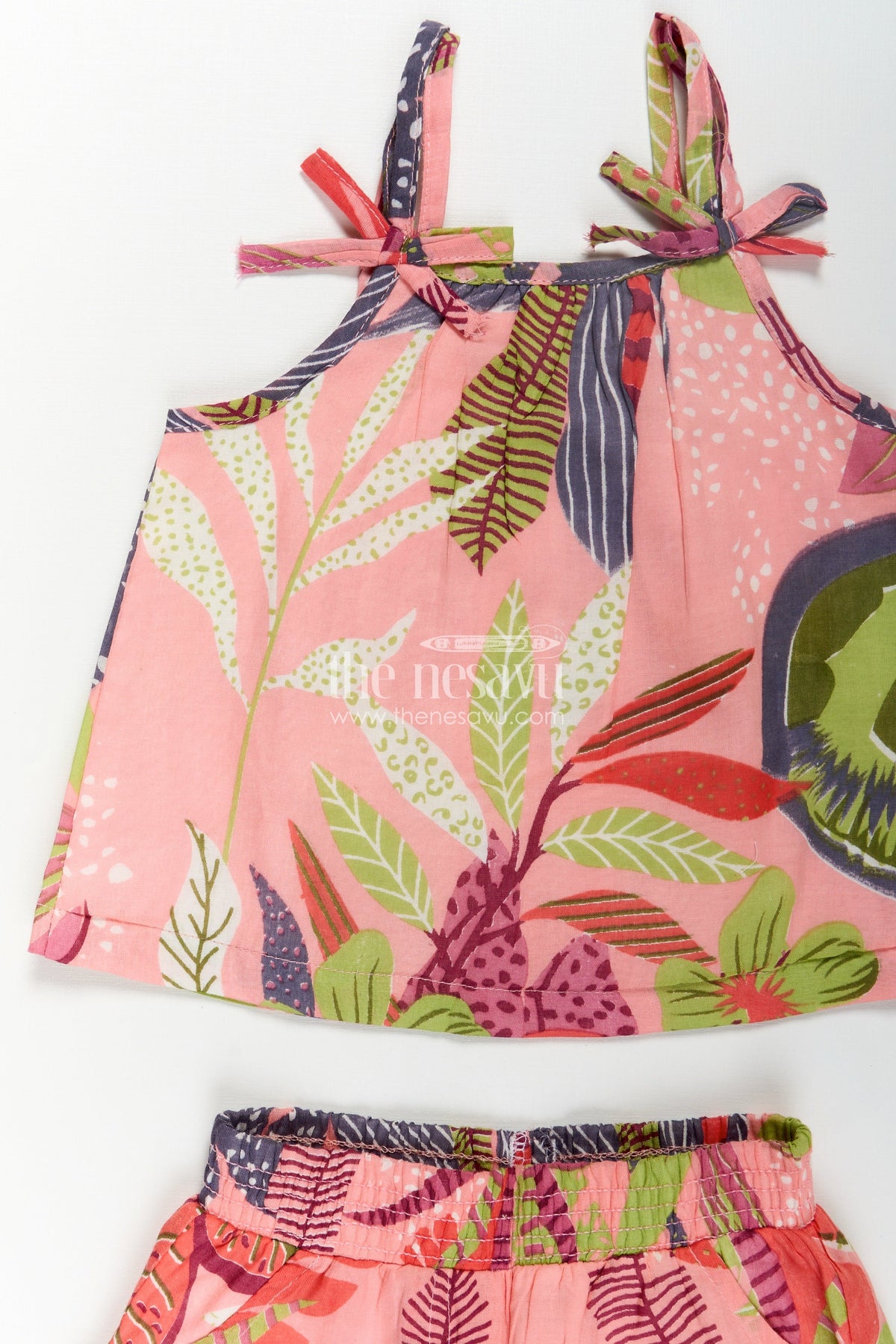Celebrate her big milestone with this vibrant first birthday outfit, a cheerful ensemble crafted in soft cotton with lively jungle-themed digital prints. The sleeveless top is beautifully flared and comes with tie-up straps, giving it a festive yet comfortable vibe. Coordinated shorts featuring bold leaf and animal-inspired motifs complete the look. Lightweight and gentle on the skin, this outfit is perfect for your baby girl’s first celebration, ensuring she looks as joyful as the occasion. A playful design that brings both comfort and adorable charm to the special day.