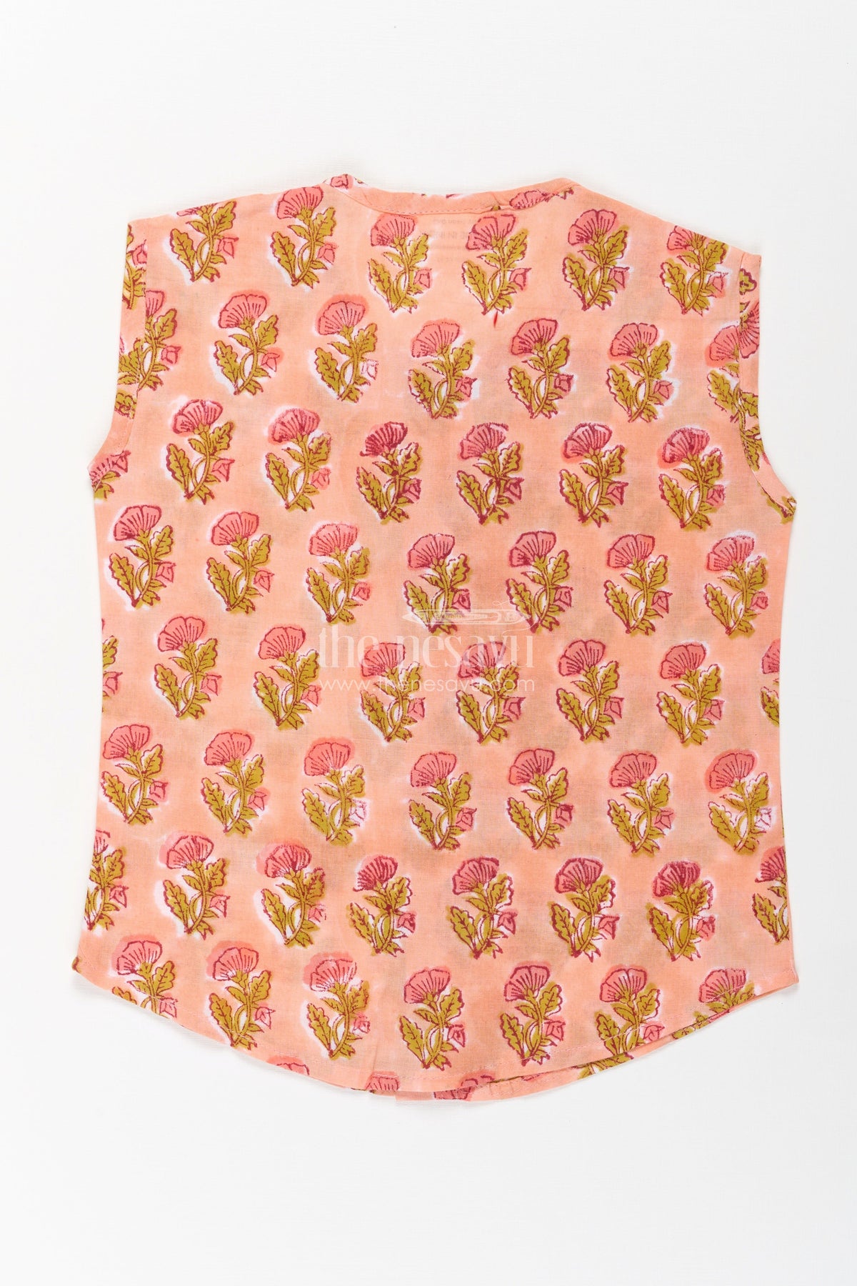 This cotton jablas for newborn offers a delightful blend of comfort and traditional charm. Made from breathable cotton with a digital floral print in soft pink and olive green, this sleeveless jabla is ideal for delicate baby skin. The peach background adds a warm, soothing tone, while the wooden buttons and mandarin collar provide easy wear and a polished finish. Whether for daily lounging or special occasions, this jabla keeps your baby looking cute and feeling comfortable all day long.