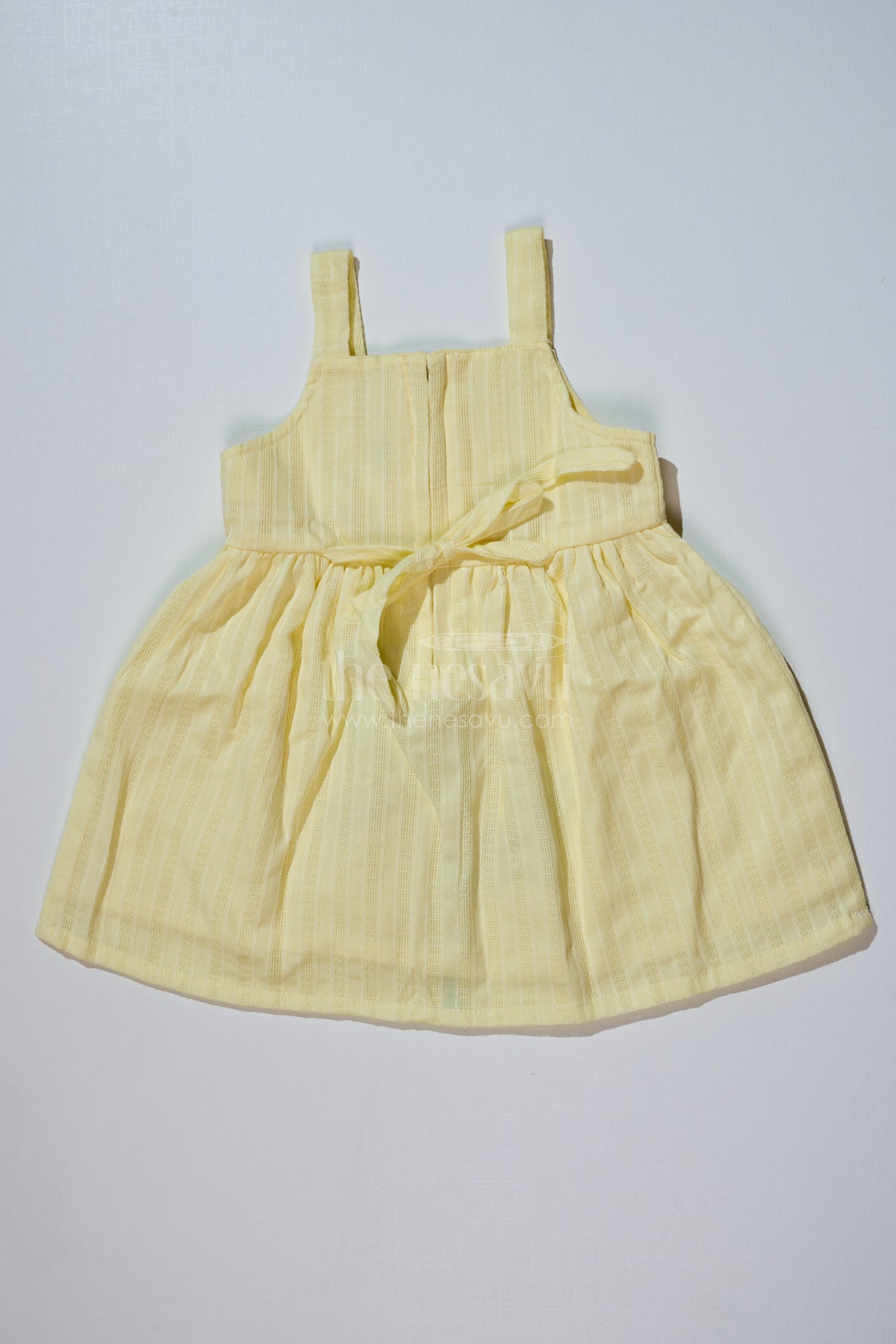 Let your little one shine in this charming cotton dress dress, designed with playful appliqué embroidery that brings a fun garden theme to life. The lemon yellow cotton fabric provides a fresh and summery feel, while the daisy appliqué with buzzing bees and leaves adds a delightful touch. The soft fabric ensures breathability and comfort, making this dress perfect for casual outings, playdates, and outdoor fun. Pair it with cute sneakers or sandals for an effortlessly stylish look.