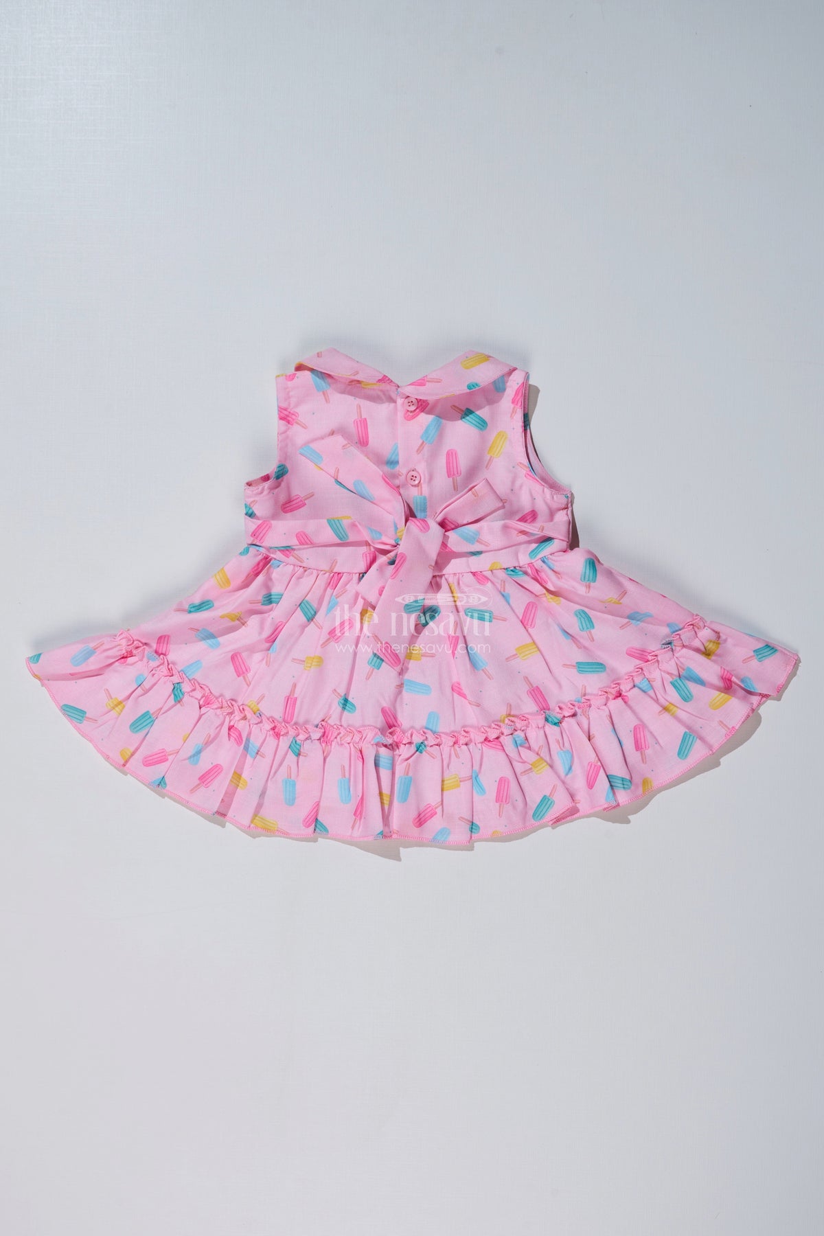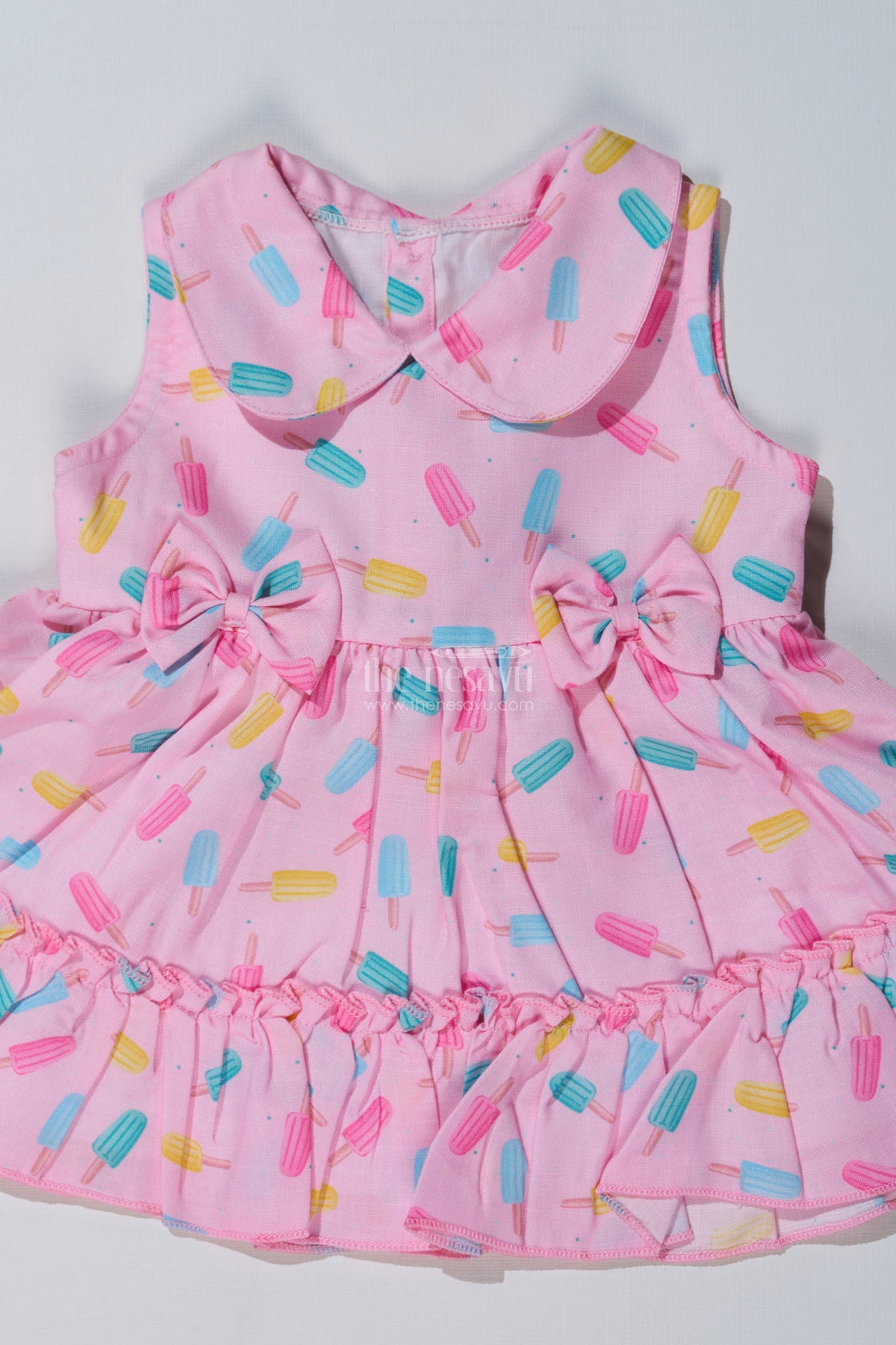 This adorable floral party frock is perfect for little ones who love to dress up in style. Crafted from a soft cotton blend, this dress features a delightful ice cream print that adds a fun and colorful touch. The Peter Pan collar and front bow accents enhance its charming appeal, while the ruffled hem creates a playful, twirl-worthy silhouette. Designed for comfort and elegance, this sleeveless frock is ideal for birthday parties, special occasions, or casual outings. Pair it with cute ballerinas for a picture-perfect look!