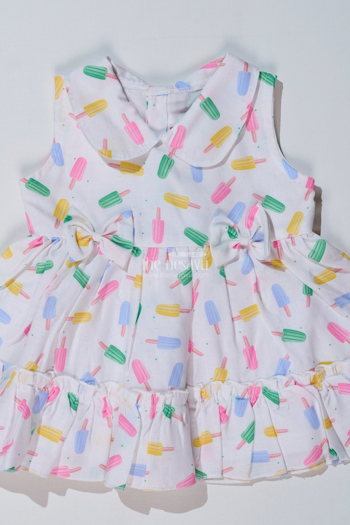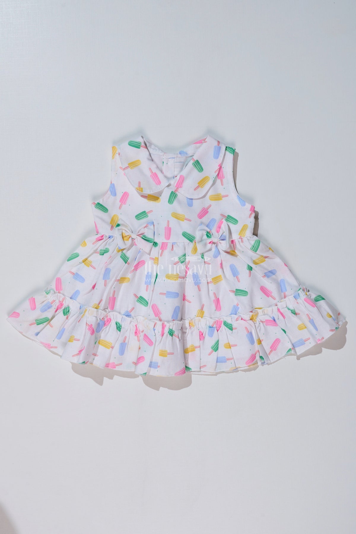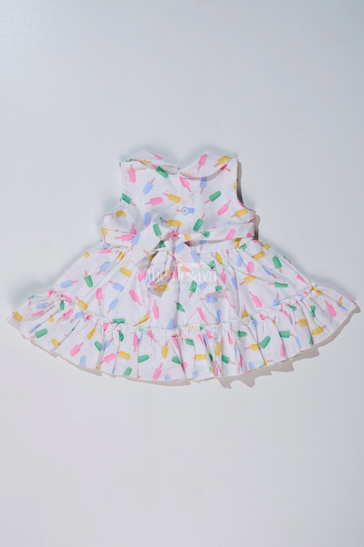 Let your little one enjoy the summer in this lightweight and breathable floral summer frock. Designed with a soft cotton blend fabric, this sleeveless dress features a playful ice cream print in pastel shades, making it a perfect choice for warm-weather outings. The Peter Pan collar adds a classic touch, while the ruffled hem and front bow details bring in extra cuteness. Whether for a day at the park, a family outing, or a casual event, this frock ensures both comfort and style for your little fashionista.