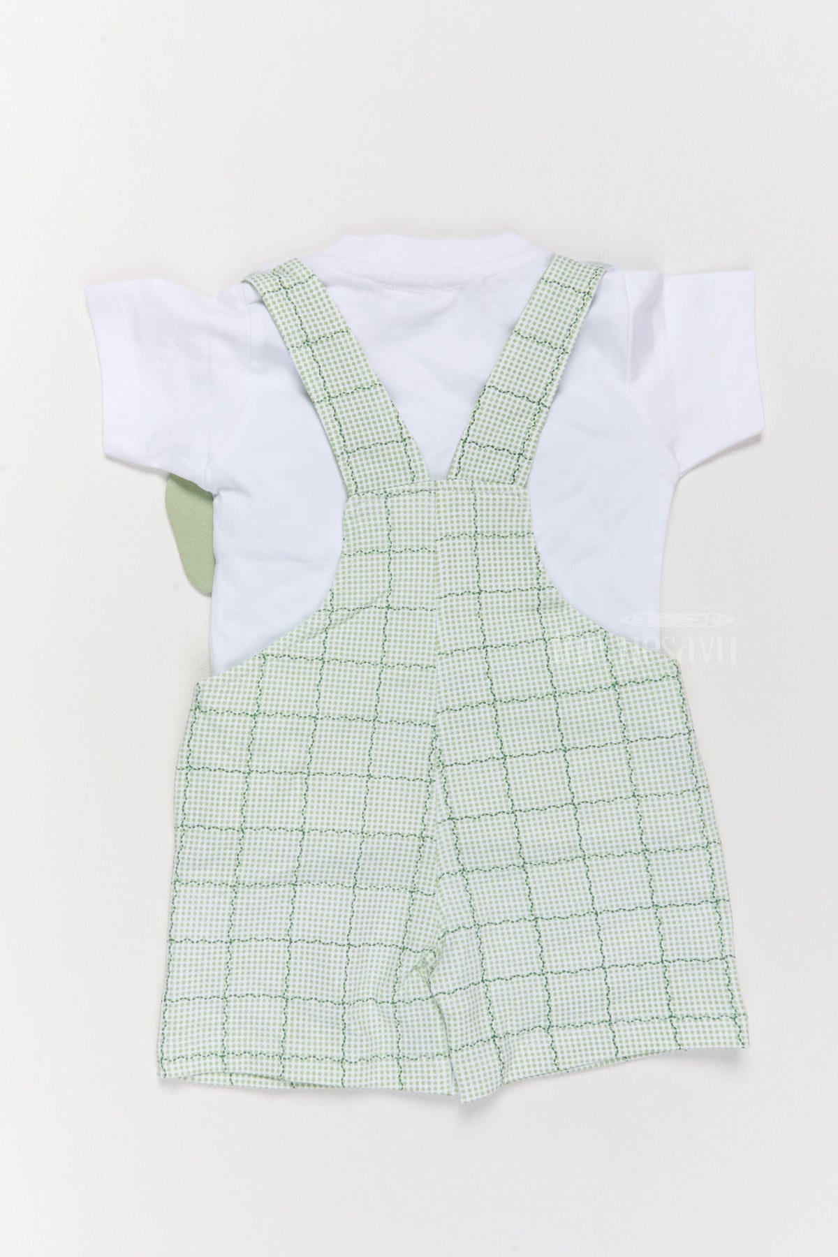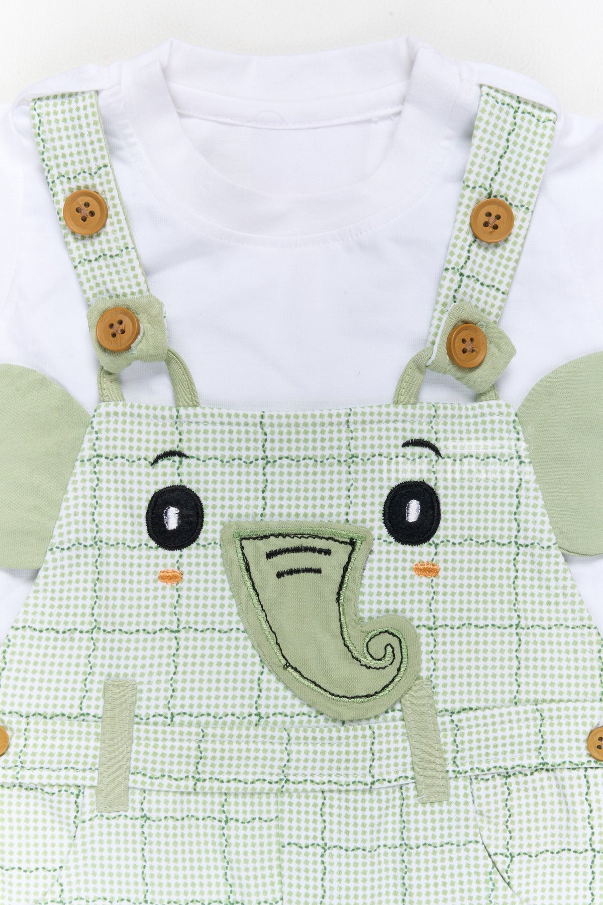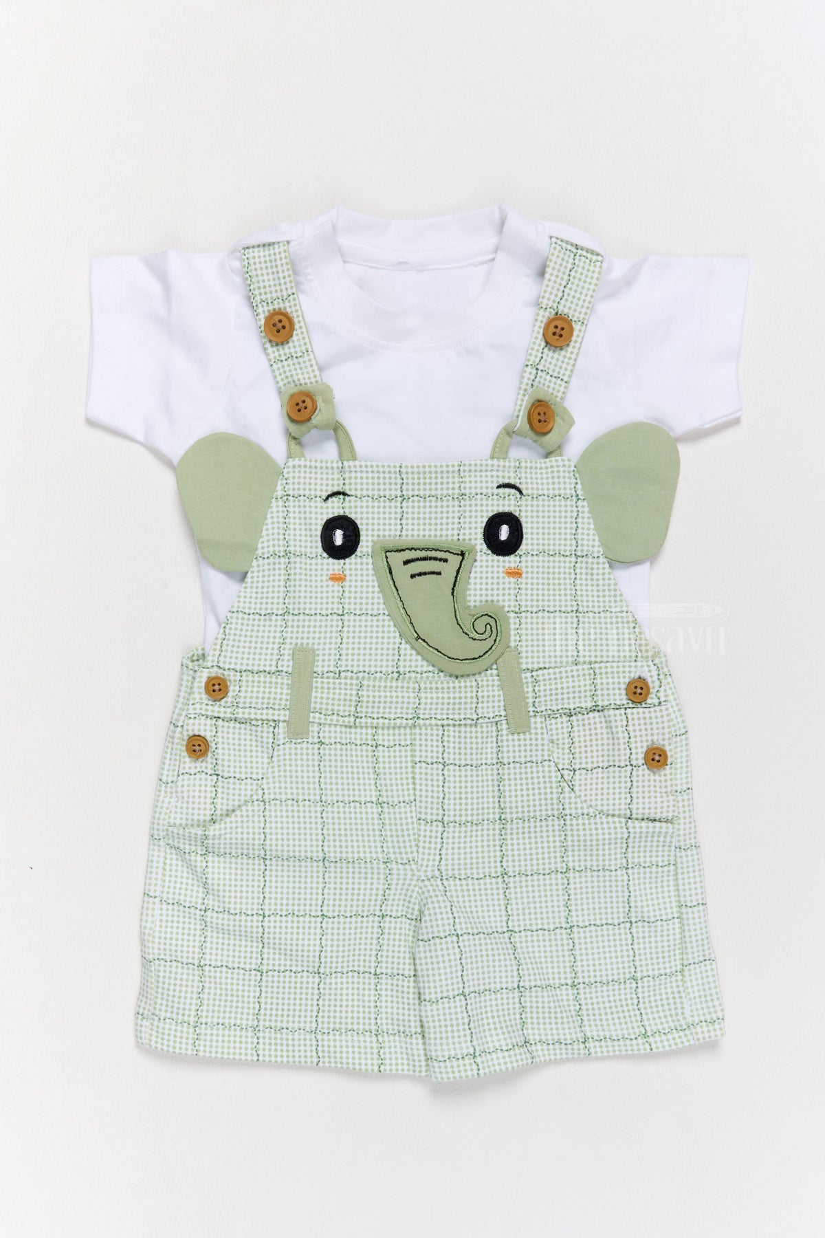This green checked dungaree set is a charming addition to your baby’s wardrobe, ideal as a babydoll casual dress. The dungaree features a cute elephant applique and adjustable shoulder straps, paired with a soft white T-shirt for a complete look. Made from breathable cotton, this outfit is gentle on your baby’s skin, ensuring comfort during playtime or outings. With its playful design and practical fit, this set is a delightful choice for any occasion.
