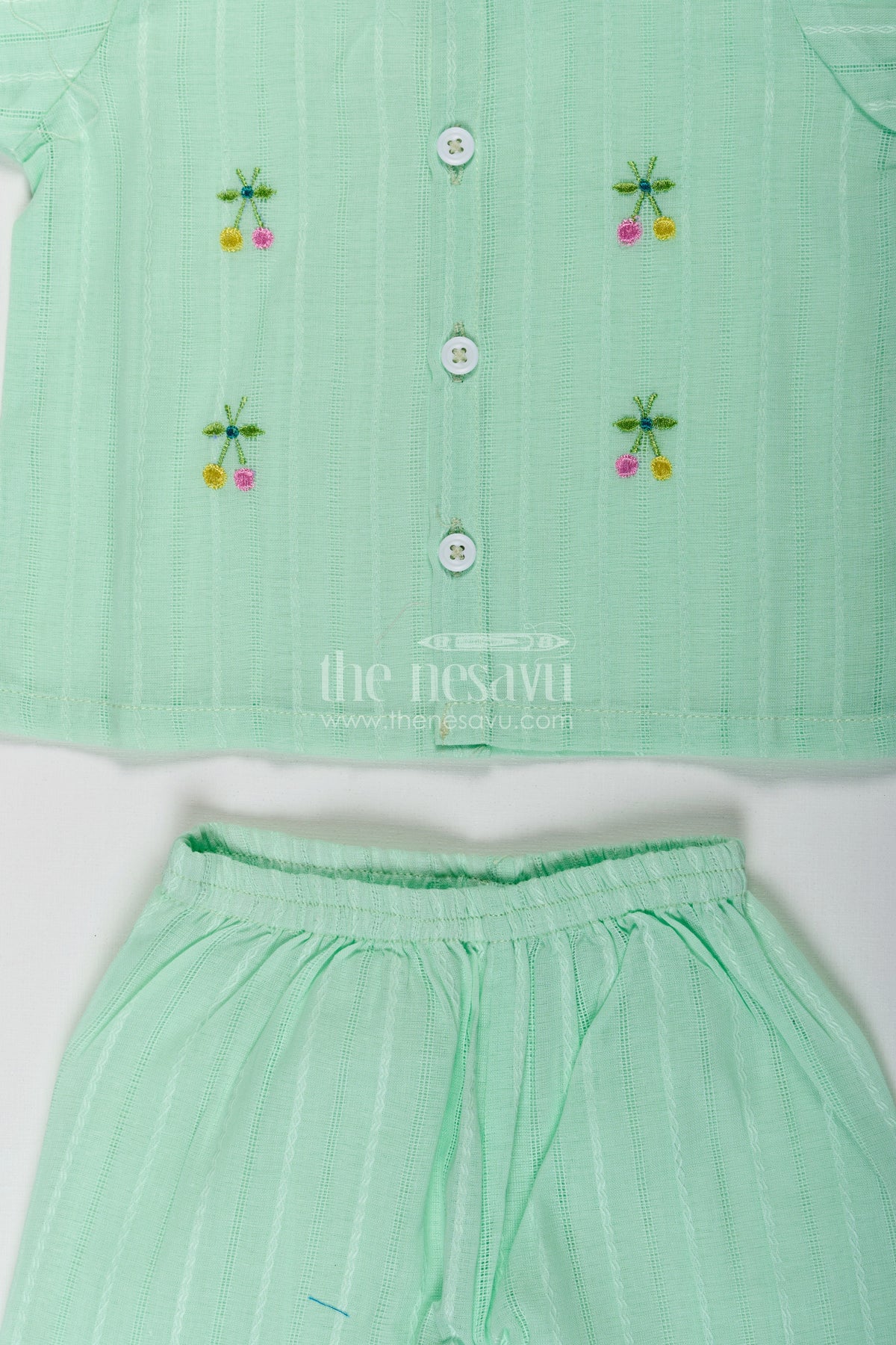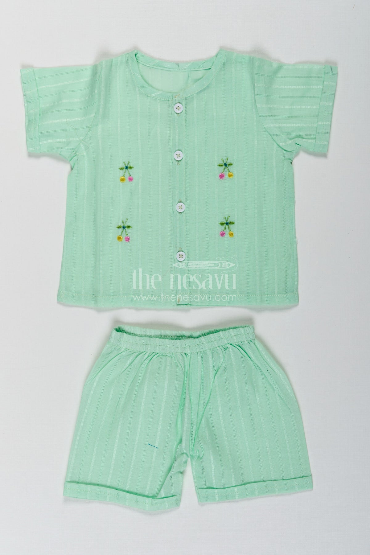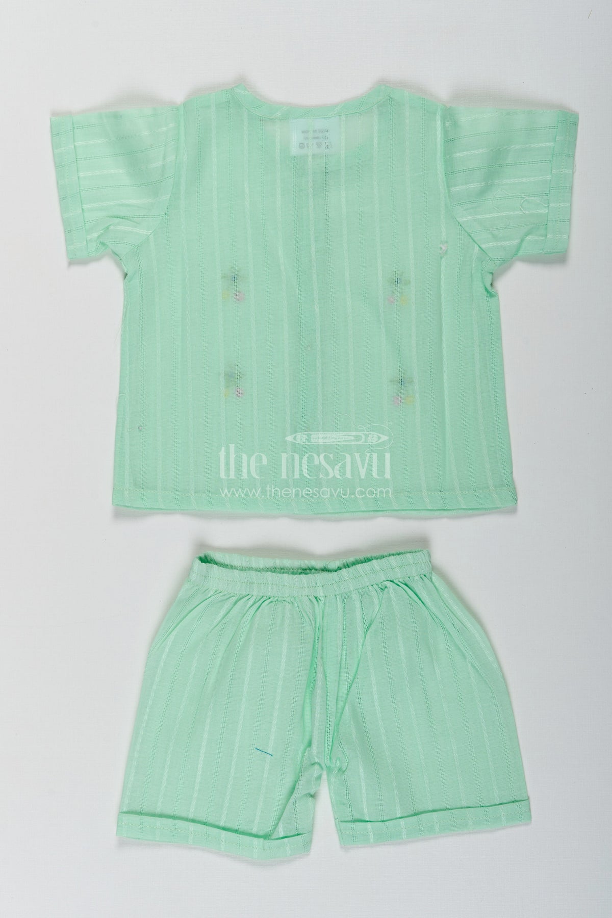 Casual dress cute and comfy, this green baby set is just the right choice for laid-back days with a touch of charm. Made from a breathable cotton fabric, the top features fine thread embroidery scattered across a subtle stripe weave pattern, while the matching shorts ensure ease of movement. The soft green tone keeps the look refreshing and bright—perfect for indoor lounging or a stroll in the park. The simple button-up shirt and elastic-waist shorts combo provides both practicality and playful appeal, making this an essential set for your little one’s everyday adventures.