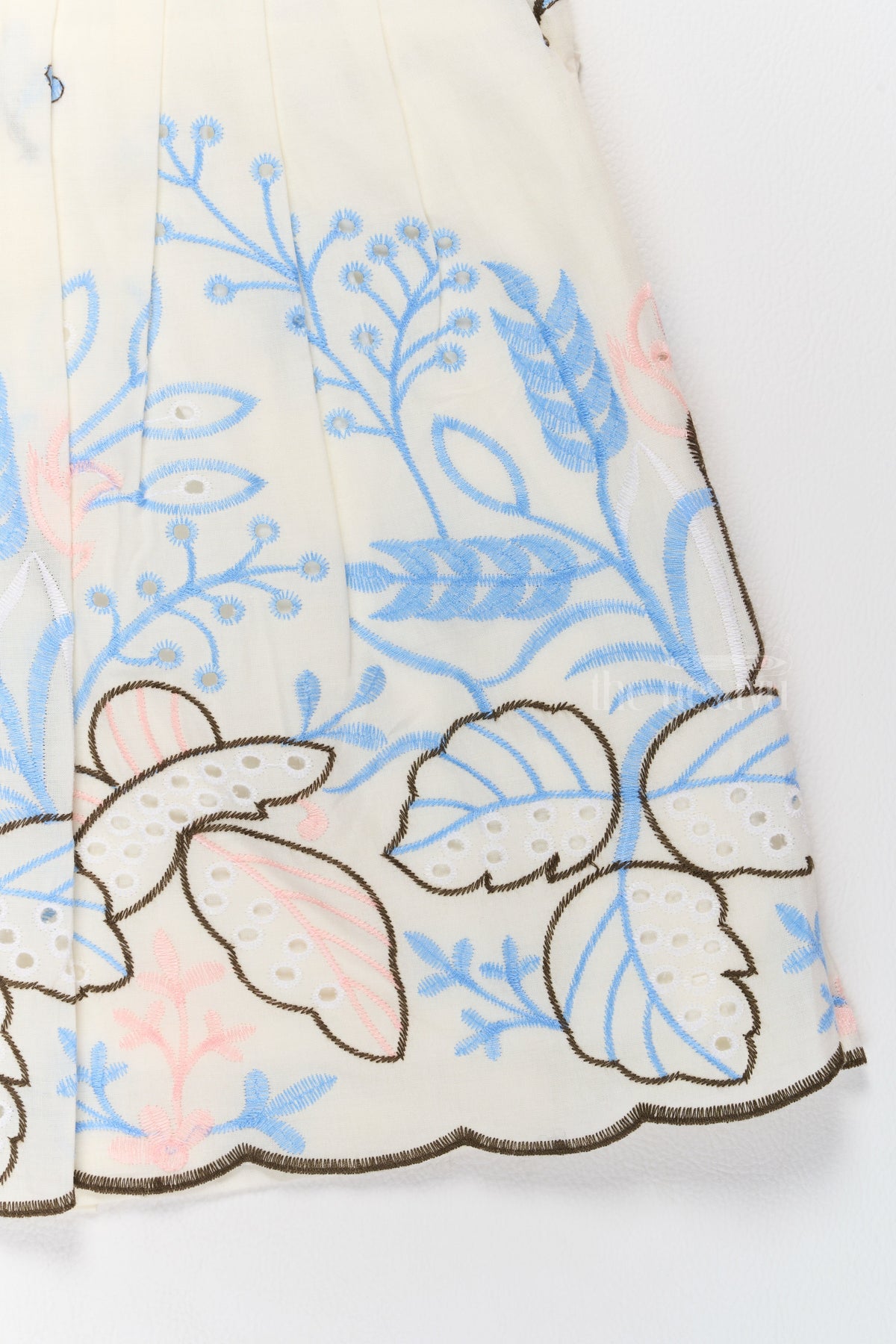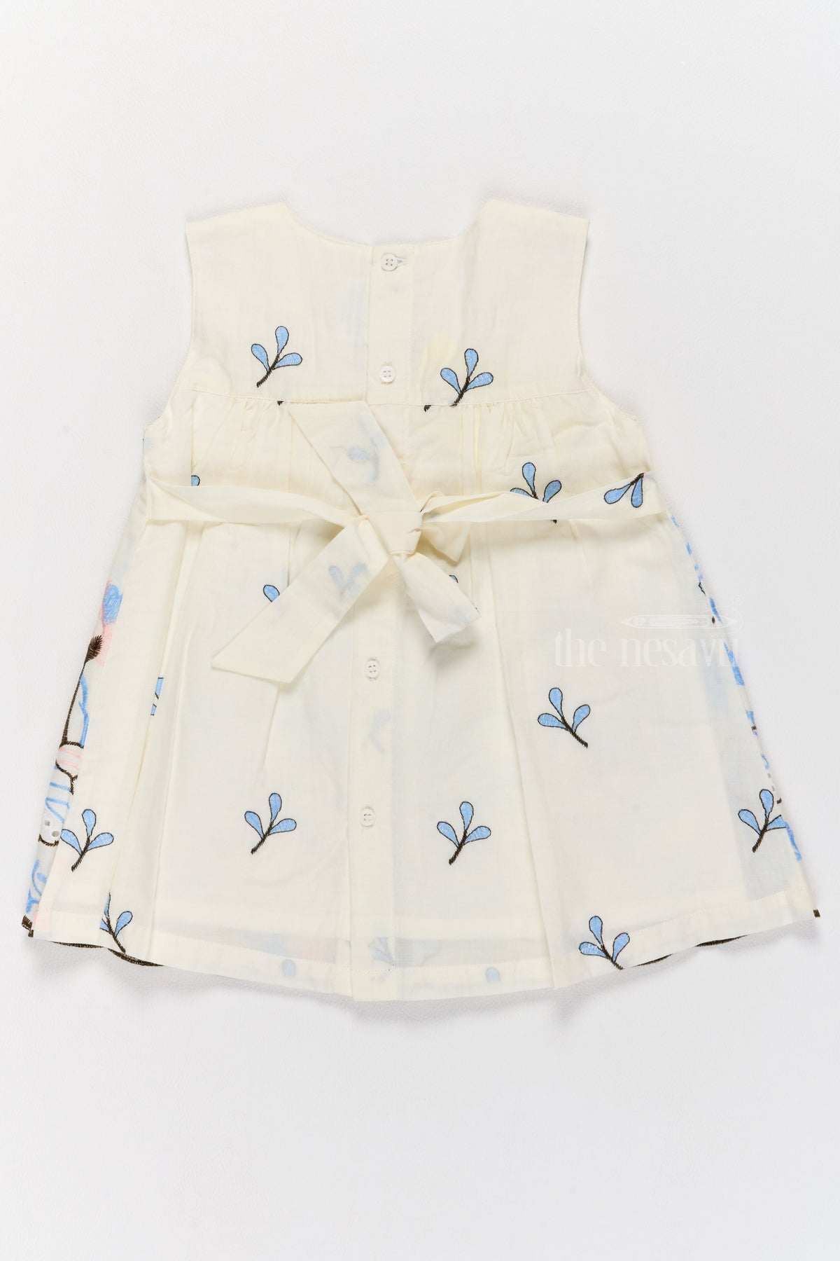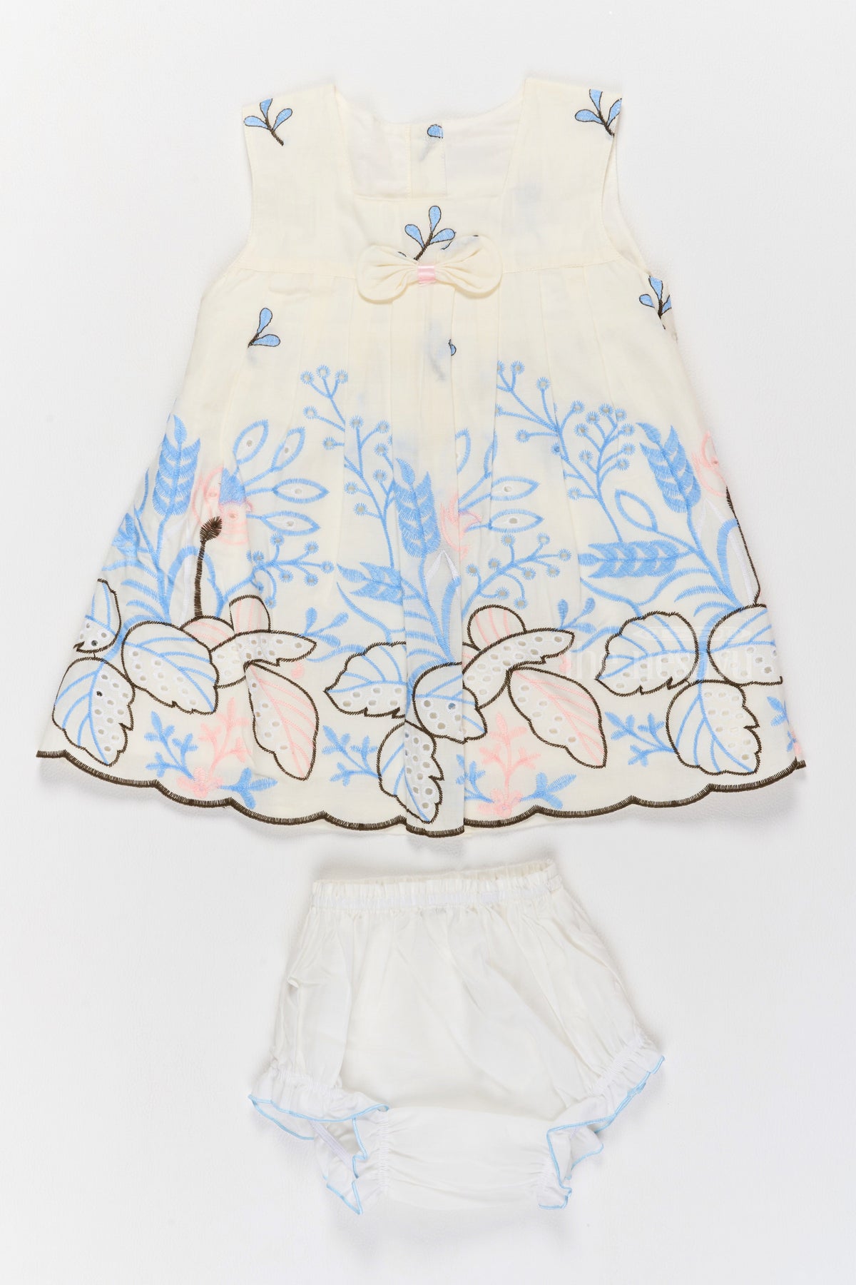 Enhance your little one's style with this daily wear newborn baby girl clothes outfit, perfect for infants aged 12 to 18 months. This dress features beautifully embroidered floral patterns in soft blue hues, adding a delicate and calming charm to the design. The soft white fabric ensures breathability and comfort for your baby's sensitive skin, while the matching bloomer offers a complete look. The cute bow detail on the bodice adds a dash of elegance, making it perfect for casual outings, daily wear, or family gatherings. Carefully crafted with attention to detail, this outfit combines comfort and style to keep your baby looking adorable all day.
