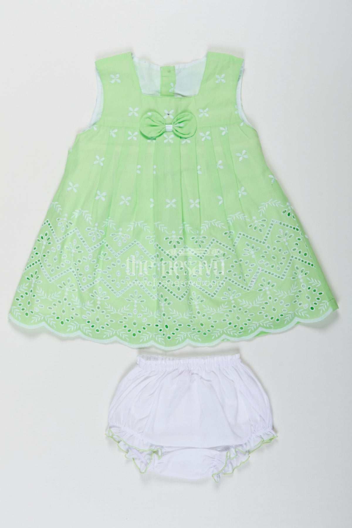 Ethnic Frock for Baby Girls in Green Cotton Hakoba Embroidery with Classic White Bloomers