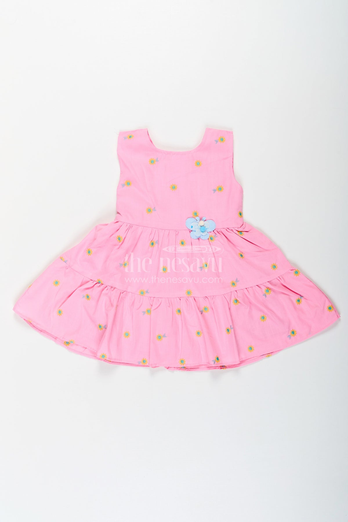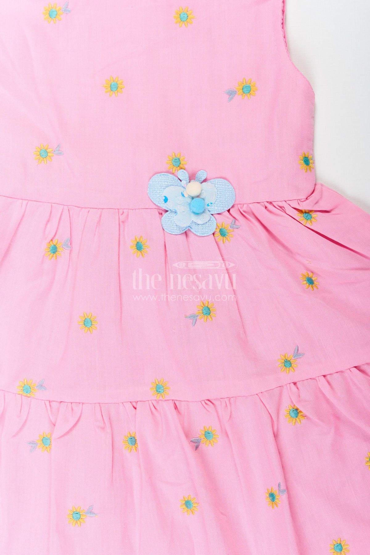 The Nesavu Baby Cotton Frocks Girls Cotton Embroidered Cinderellas Pink Dress with Ruffled Hem and Daisy Motifs Nesavu Girls Cinderellas Pink Dress Daisy Embroidery Ruffled Hem Cotton Fabric | The Nesavu