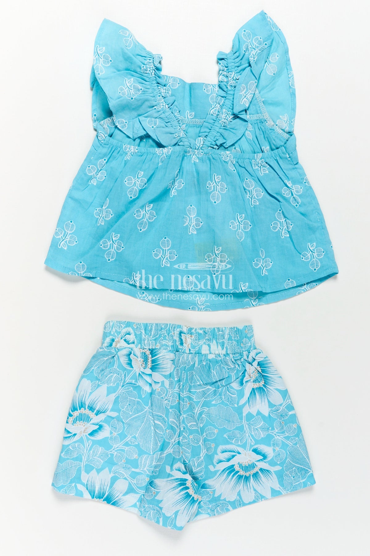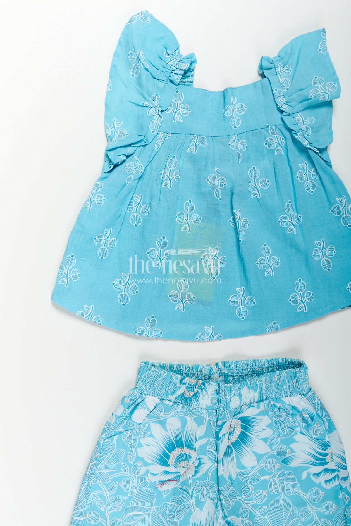 These designer infant clothes bring together elegance and playfulness with a beautifully coordinated cotton set in soft pastel blue. Featuring a refined paisley-inspired digital print, the sleeveless top has dainty tie-up shoulders and a flared shape that allows for easy movement. The matching shorts offer a comfy fit with an elastic waistband and the same detailed print. This outfit is perfect for baby girls who deserve both comfort and flair. Lightweight and breathable, it's ideal for daily wear, family gatherings, or first photoshoots.
