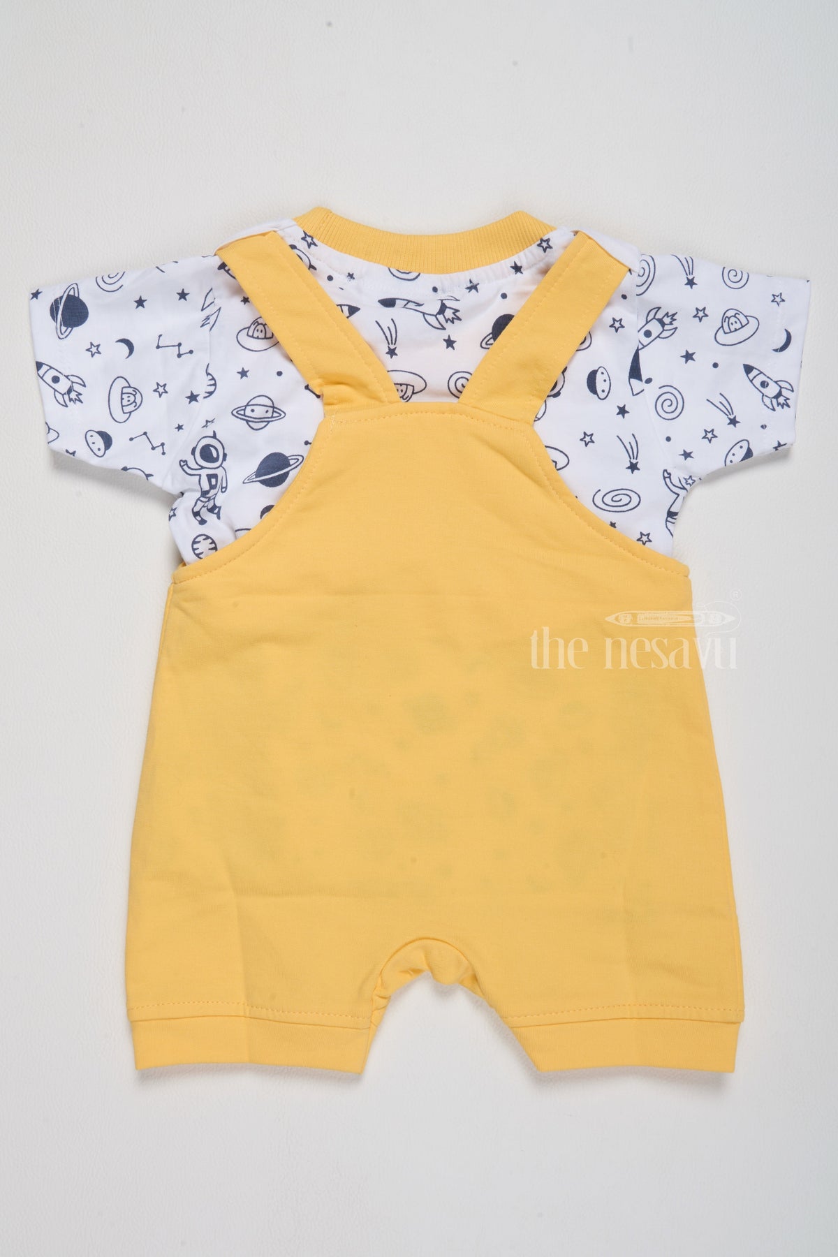 Celebrate Holi in style with this adorable newborn Holi dress featuring a bright yellow dungaree and a playful space-themed T-shirt. The dungaree boasts a unique "Explore More" UFO embroidery, perfect for sparking your baby’s imagination. Paired with a celestial-printed white T-shirt, this outfit is crafted from soft, breathable cotton to ensure maximum comfort. With its buttoned straps for easy dressing and vibrant colors, this set is ideal for festive celebrations or casual outings. Add this cheerful outfit to your newborn’s festive wardrobe and let them shine with joy and comfort.