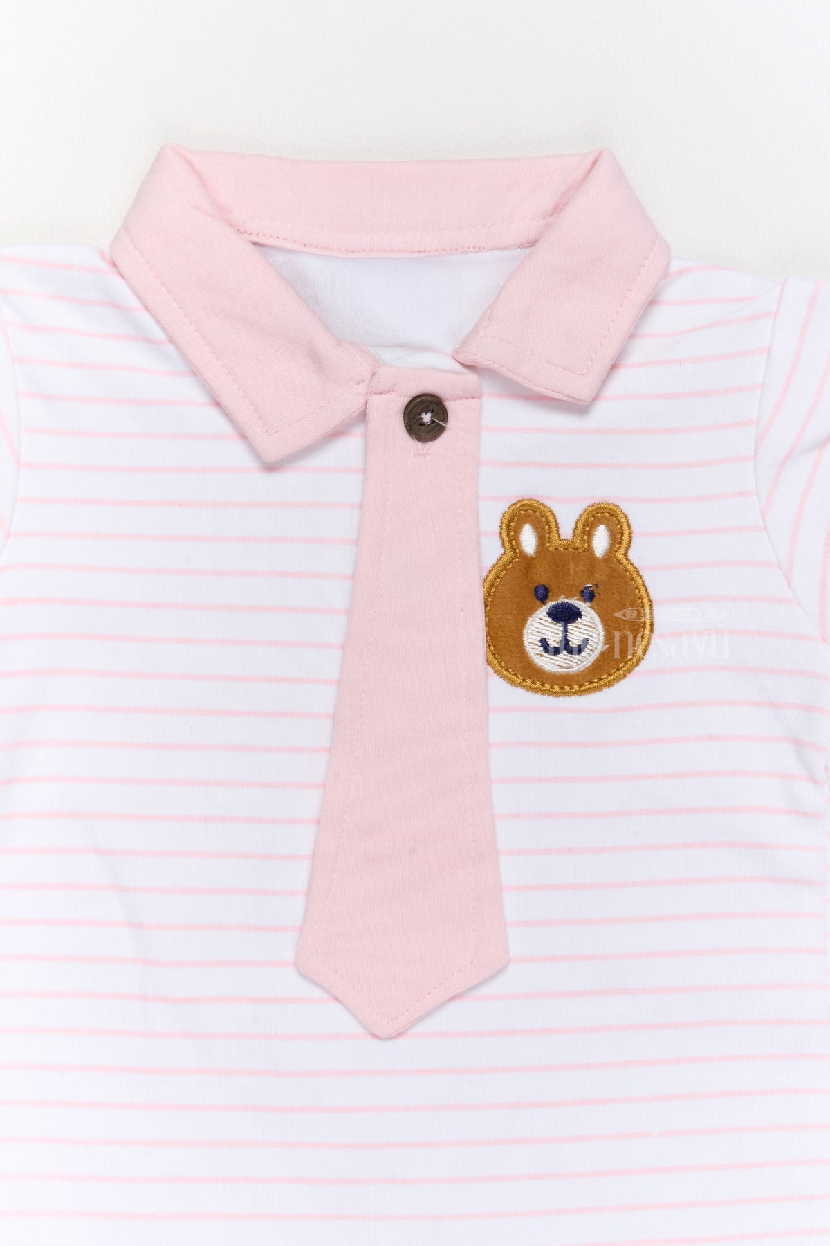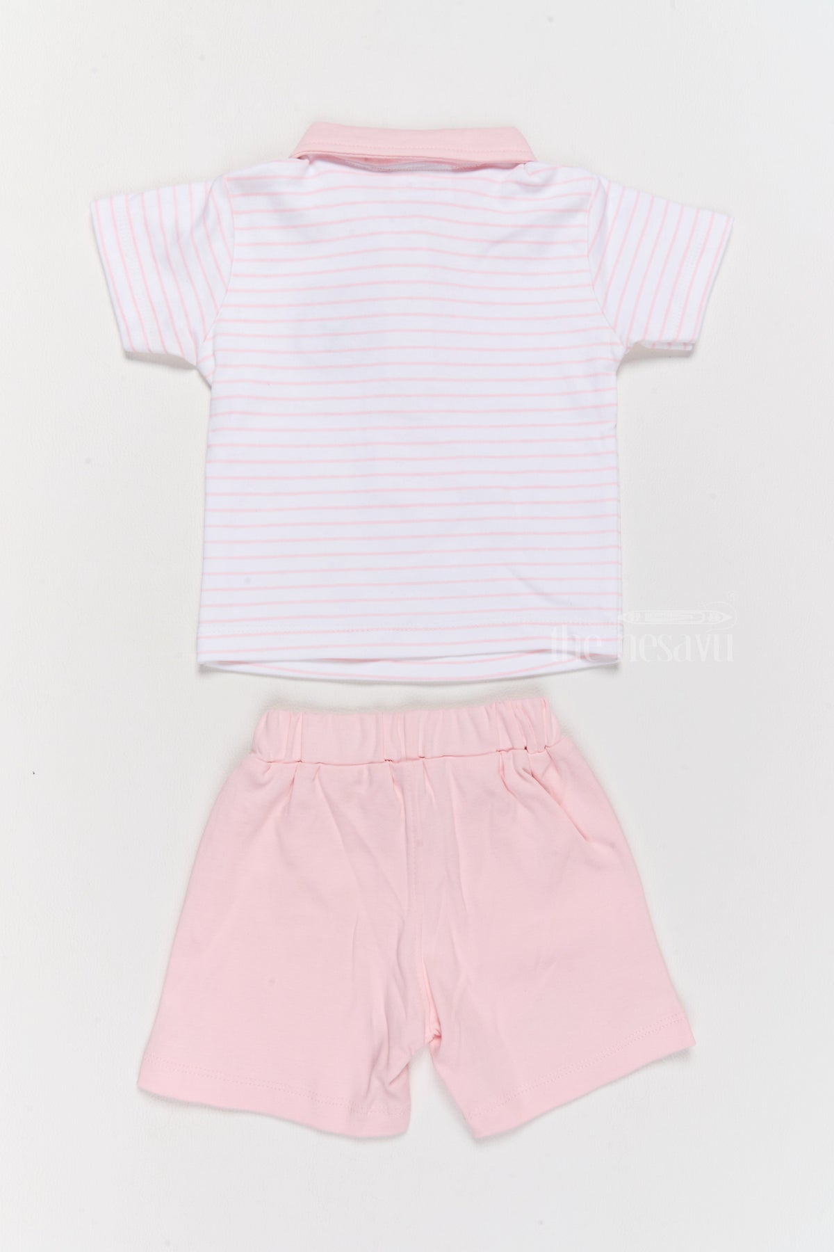 Brighten up your baby’s wardrobe with this delightful pink cotton shorts set, designed as stylish and comfortable newborn wear. The striped T-shirt features a mock tie and an adorable bear applique, paired with matching pink shorts for a coordinated look. Made from premium cotton, this outfit ensures breathability and softness, keeping your little one comfortable all day. The elastic waistband on the shorts provides a secure and flexible fit. This playful and practical set is perfect for family outings, casual days, or baby photoshoots.