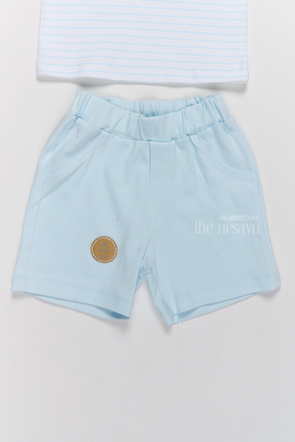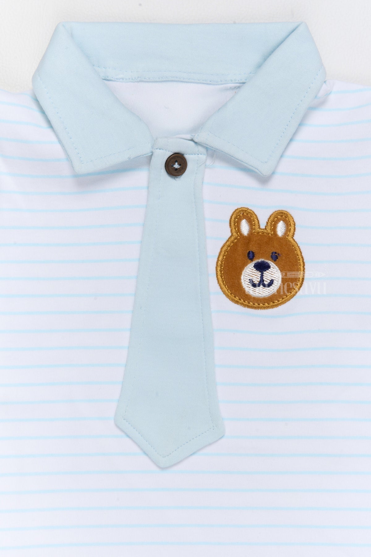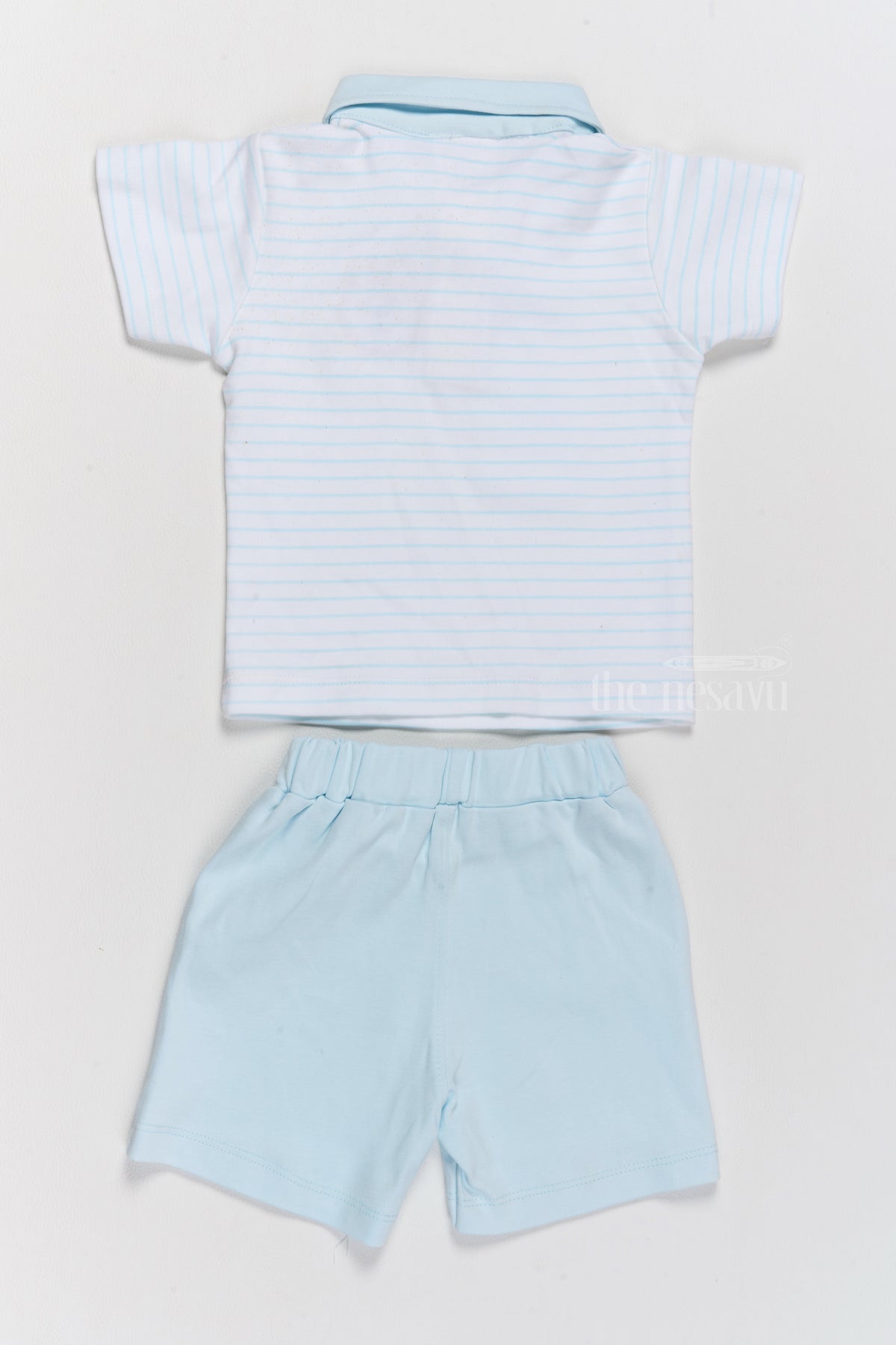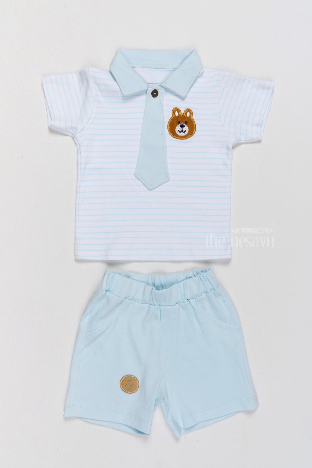 Dress your little one in this adorable blue cotton shorts set, specially designed for newborn winter wear. The outfit features a striped T-shirt with a mock tie and a cute bear applique, paired with matching blue shorts. Made from soft and cozy cotton, this set provides warmth and ensures maximum comfort during cooler days. The elasticized waistband offers a perfect fit, while the lightweight material allows for unrestricted movement. Perfect for everyday wear or special occasions, this outfit is a must-have for your baby’s wardrobe.
