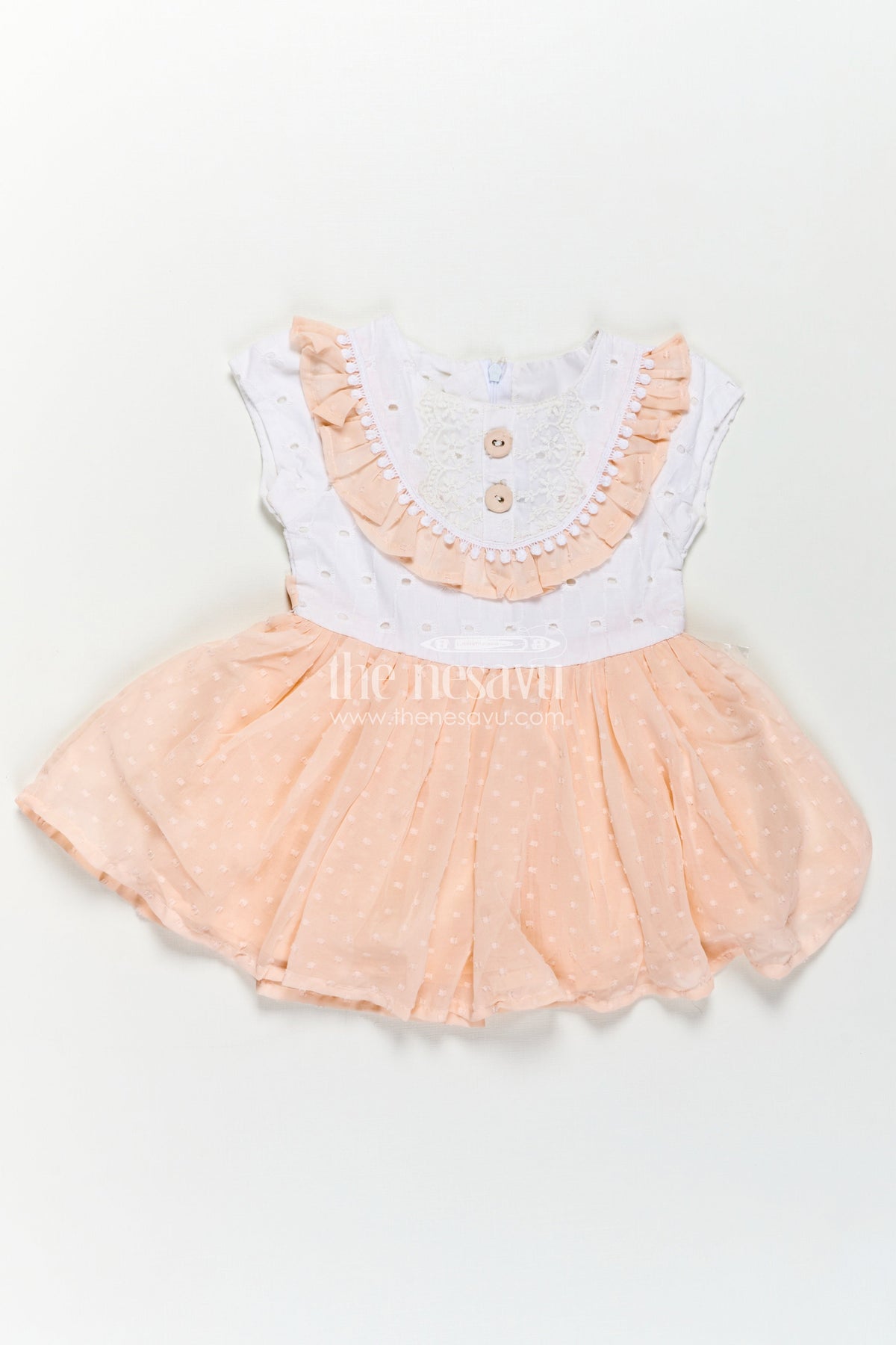 The Nesavu Baby Cotton Frocks Peach Frock Suit for Baby Girls with Hakoba Lace Yoke and Polka Dot Georgette Skirt Nesavu Peach Frock Suit Baby Girls Hakoba Lace Top Polka Dot Georgette Flare | The Nesavu