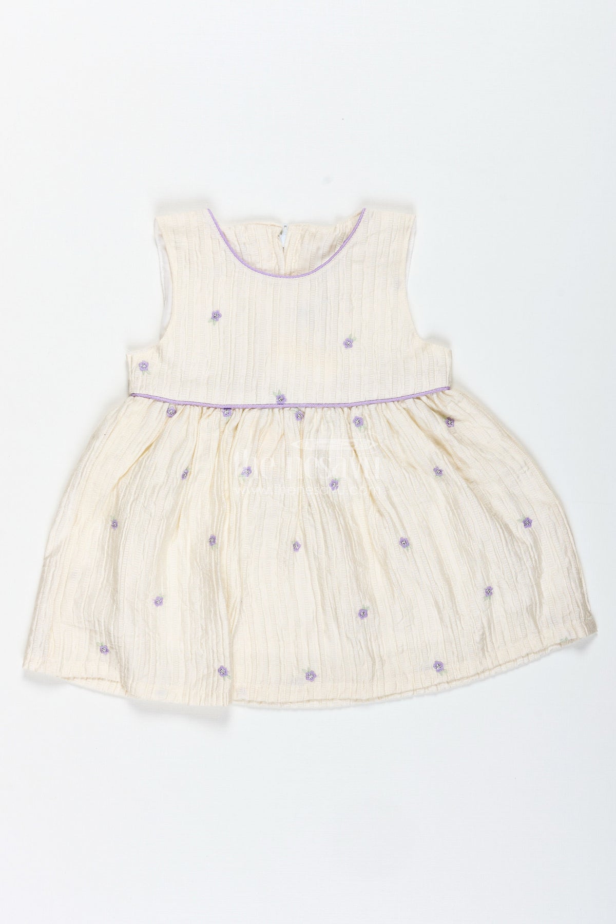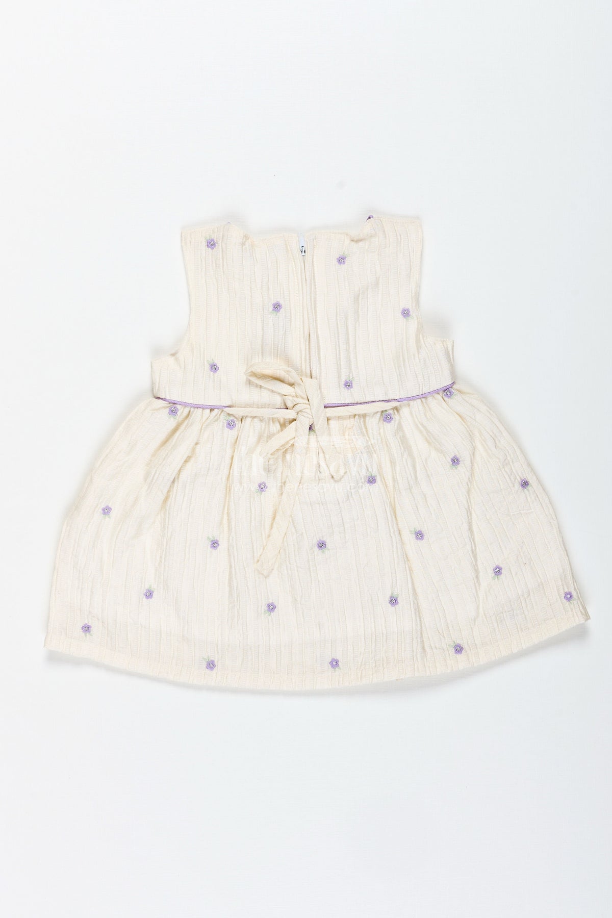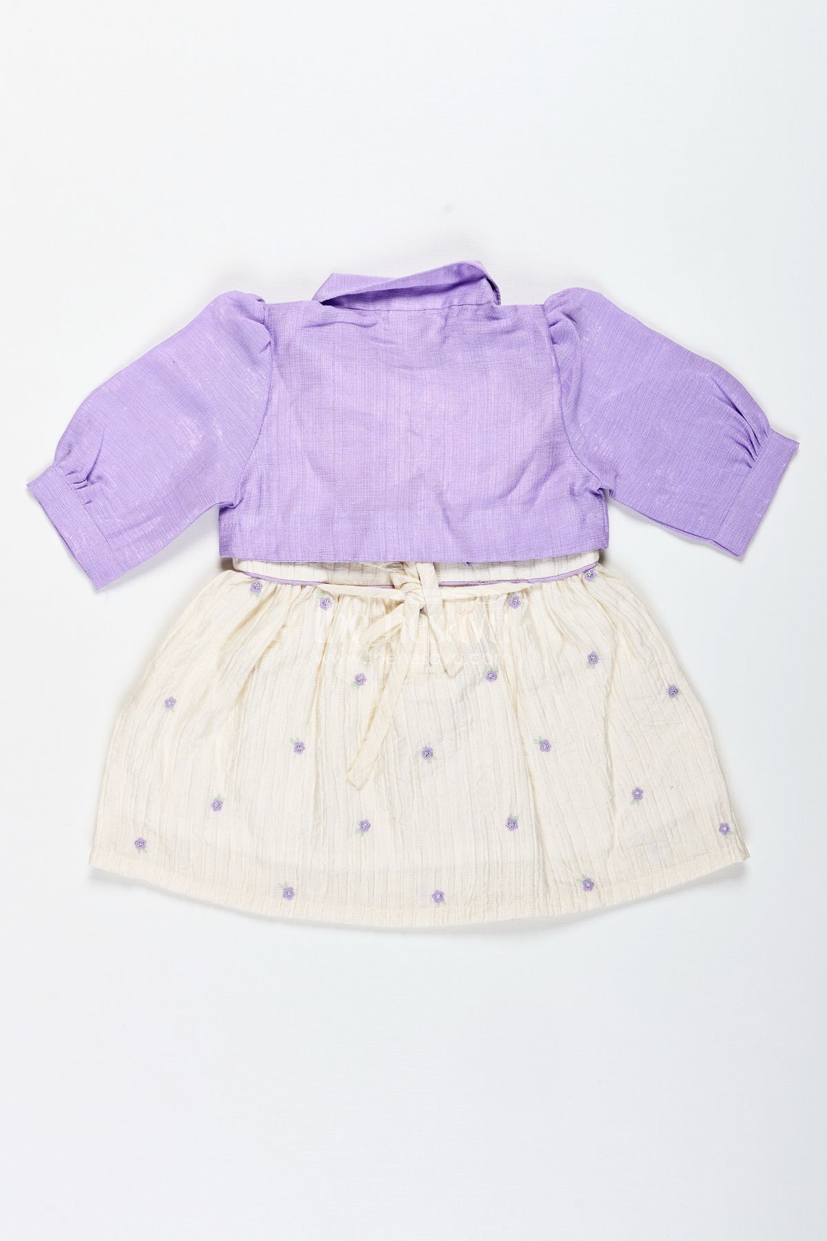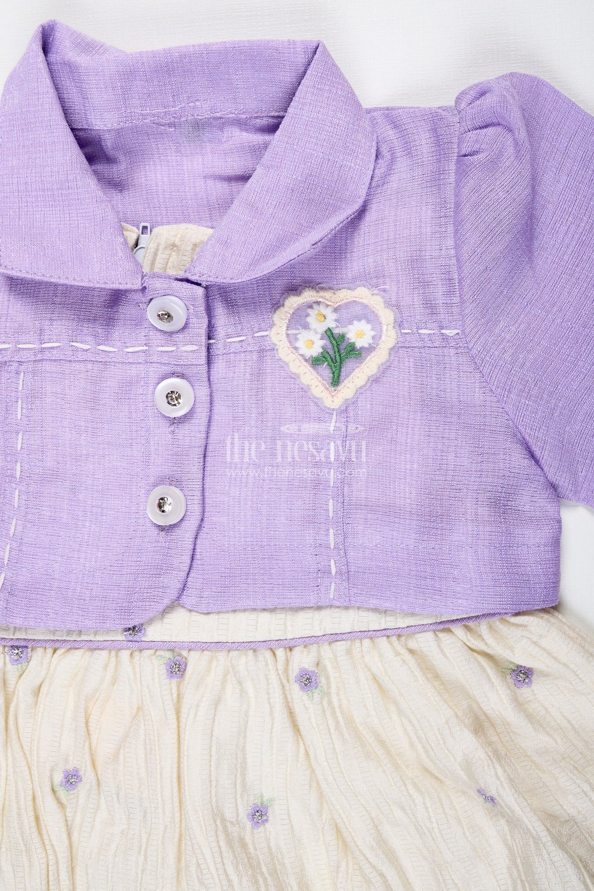 Soft cotton dress with purple shirt for toddler girls is a delightful combination that brings both elegance and playfulness into one perfect outfit. The sleeveless frock in a calming cream shade is beautifully embroidered with delicate purple floral motifs, offering a soft and charming texture. Paired seamlessly with a lilac-colored button-up shirt, this look strikes the ideal balance between everyday wear and a put-together ensemble. The shirt features puffed sleeves, contrast white buttons, and a heart applique that adds a whimsical flair. Ideal for toddlers aged 14 to 18, this set is designed for breathability and ease of movement, making it an excellent choice for all-day wear. Finished with a zip closure at the back and easy-care cotton fabric, this outfit is both parent- and child-friendly for regular dressing needs.