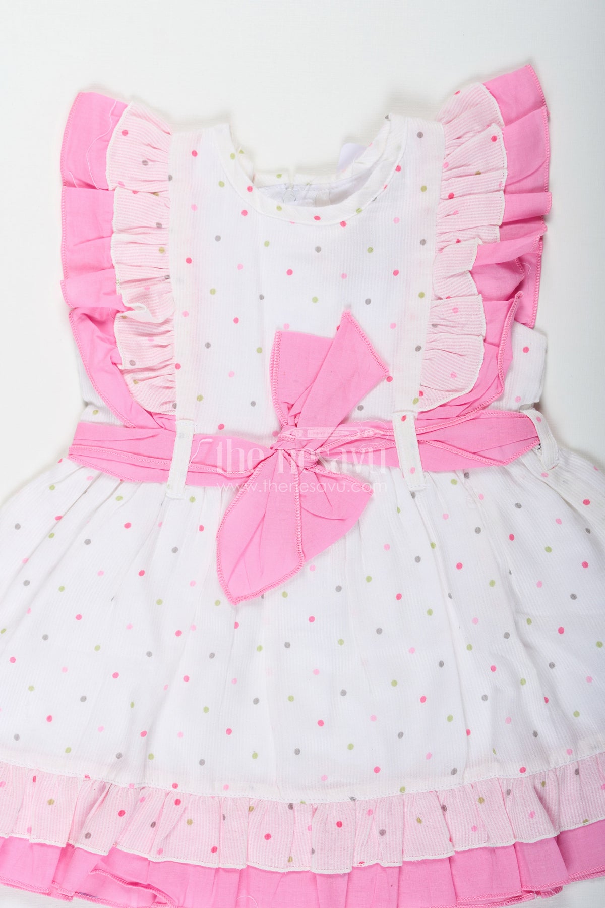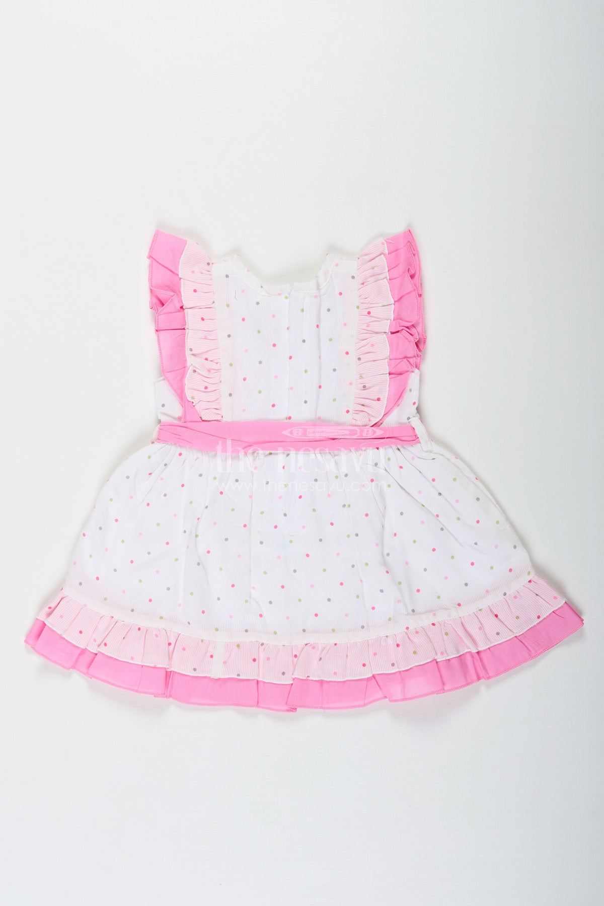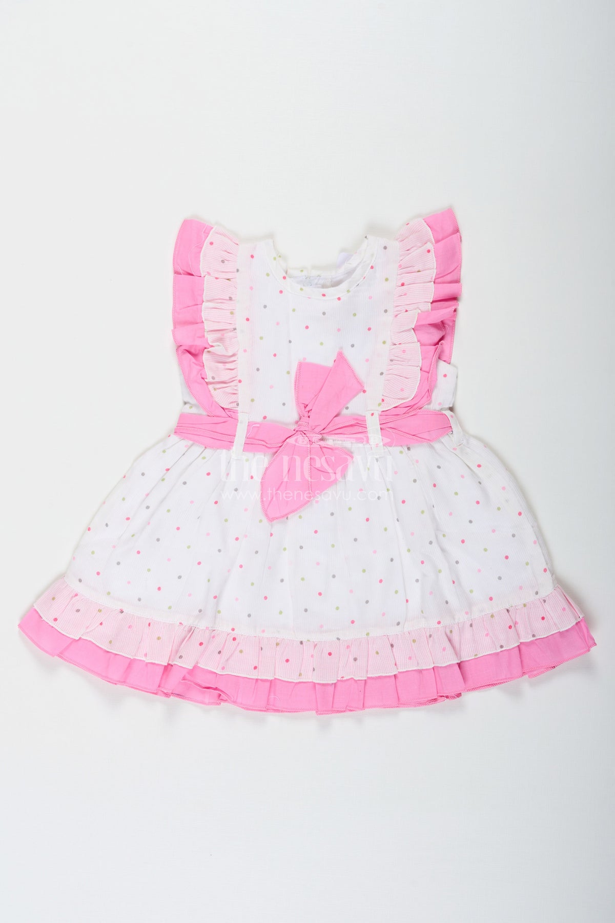 The Nesavu Baby Cotton Frocks Stylish Frocks for Baby Girls in White Cotton Blend with Pink Ruffles and Color Dot Accents Nesavu 12 (3M) / Pink BFJ775B-12 Stylish Baby Girls Frock White Cotton Blend Pink Ruffles Colorful Dot Prints | The Nesavu