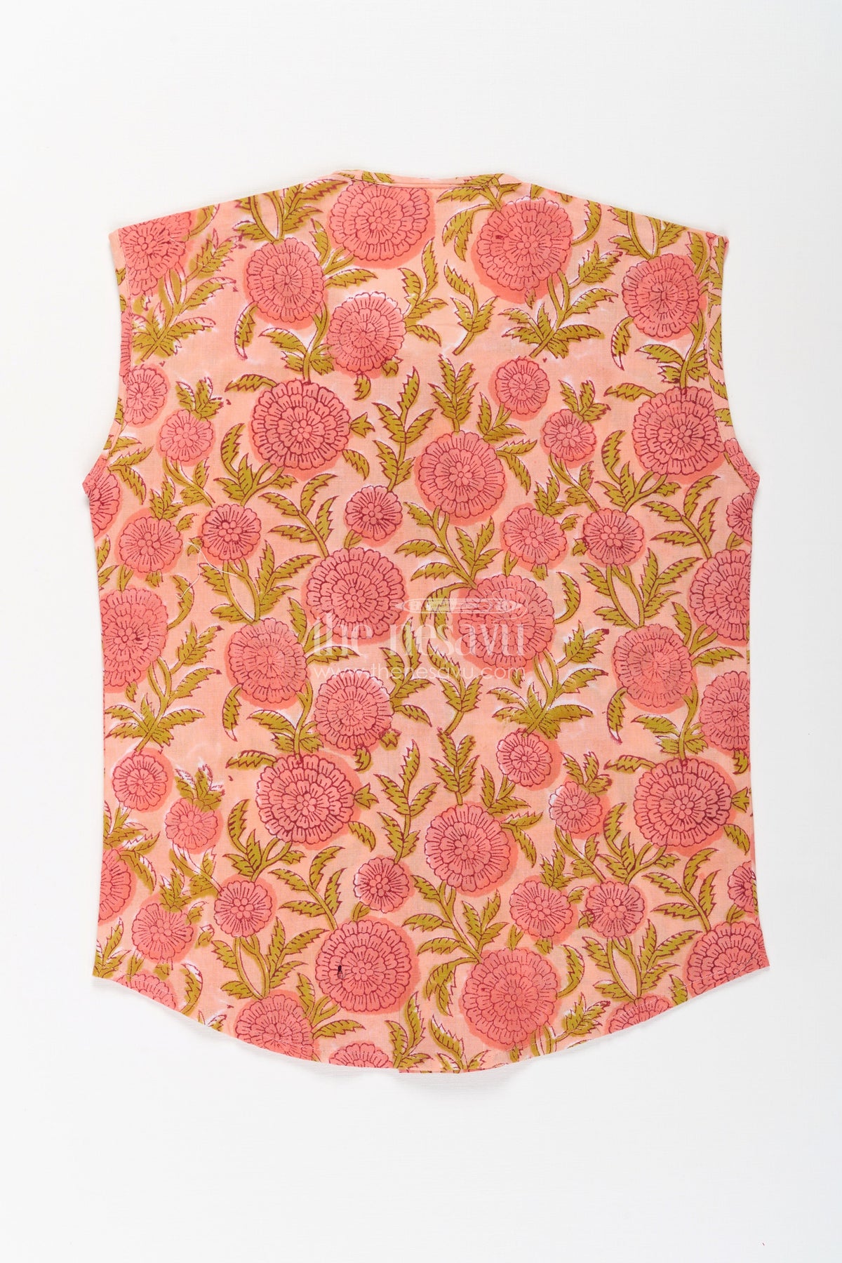 This newborns jhabla online pick is a stylish yet soothing essential for your baby boy’s wardrobe. Made from soft cotton with a breathable feel, the jabla features a large floral digital print in shades of pink and green set against a peach base. The sleeveless design keeps your baby cool and free to move, while the wooden buttons down the front add traditional charm. It’s a delightful choice for daily wear, summer days, or baby gifting - crafted to keep your little one happy and stylish.
