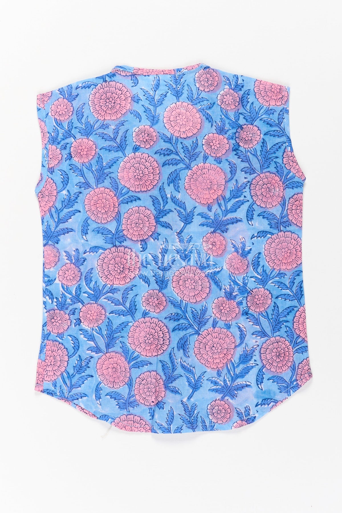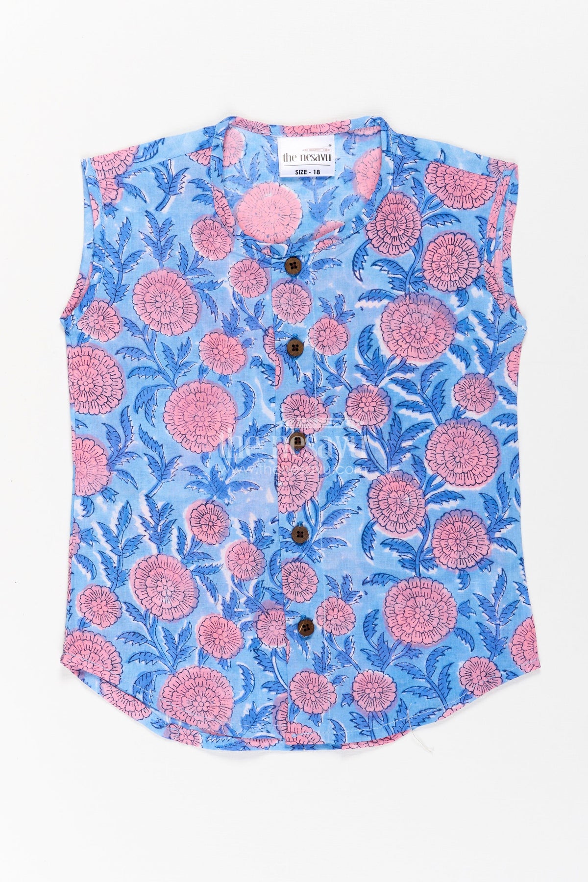 This jhablas for infants piece offers vibrant personality and breathable softness, ideal for your baby's daily outfits. Featuring bold pink florals digitally printed over a cheerful sky blue cotton base, this jabla is both eye-catching and gentle on the skin. The sleeveless silhouette allows full range of motion, while the wooden button front adds ease and charm. Whether for playful moments or relaxed afternoons, this jabla top is the perfect blend of comfort, convenience, and cuteness.