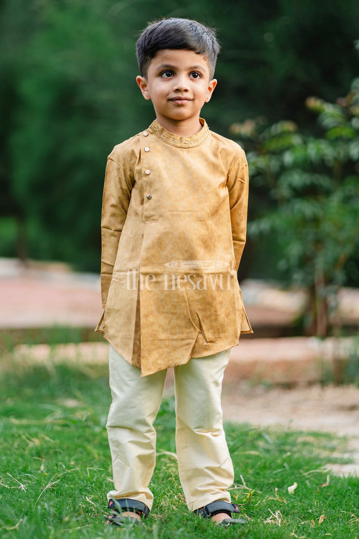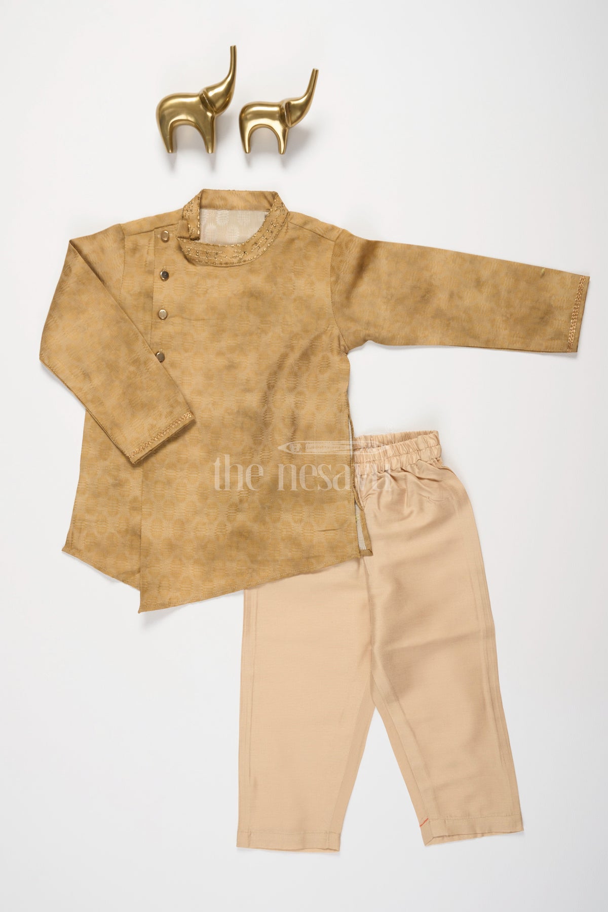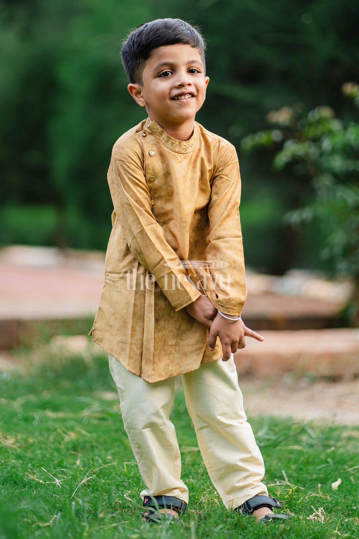 This traditional kurta set in olive green is perfect for special occasions or festive celebrations. The kurta is crafted from soft, hand-dyed fabric with subtle tonal variations, adding depth to the design. The asymmetrical front button placket is highlighted with metallic buttons, while the mandarin collar is adorned with intricate embroidery. Paired with comfortable white pajamas, this set offers a chic, ethnic look with a modern twist. The kurta's soft texture and clean silhouette make it a versatile outfit that ensures both comfort and style for your little one.