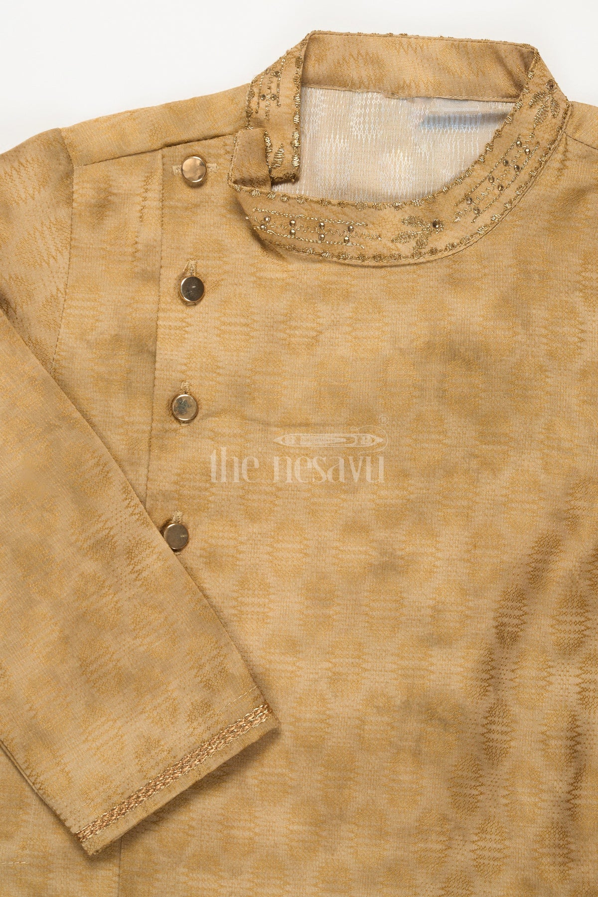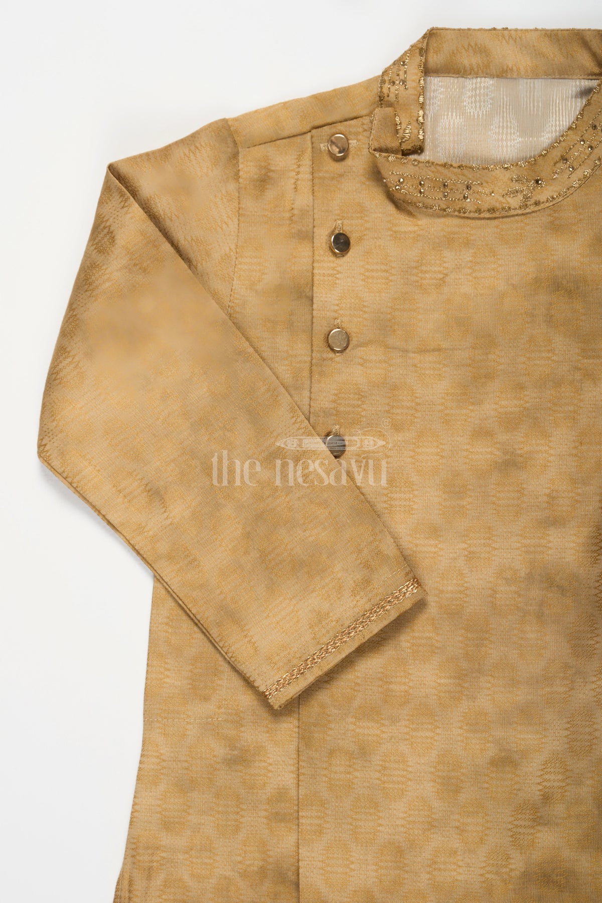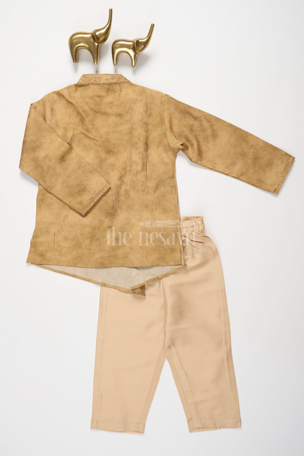 This traditional kurta set in olive green is perfect for special occasions or festive celebrations. The kurta is crafted from soft, hand-dyed fabric with subtle tonal variations, adding depth to the design. The asymmetrical front button placket is highlighted with metallic buttons, while the mandarin collar is adorned with intricate embroidery. Paired with comfortable white pajamas, this set offers a chic, ethnic look with a modern twist. The kurta's soft texture and clean silhouette make it a versatile outfit that ensures both comfort and style for your little one.