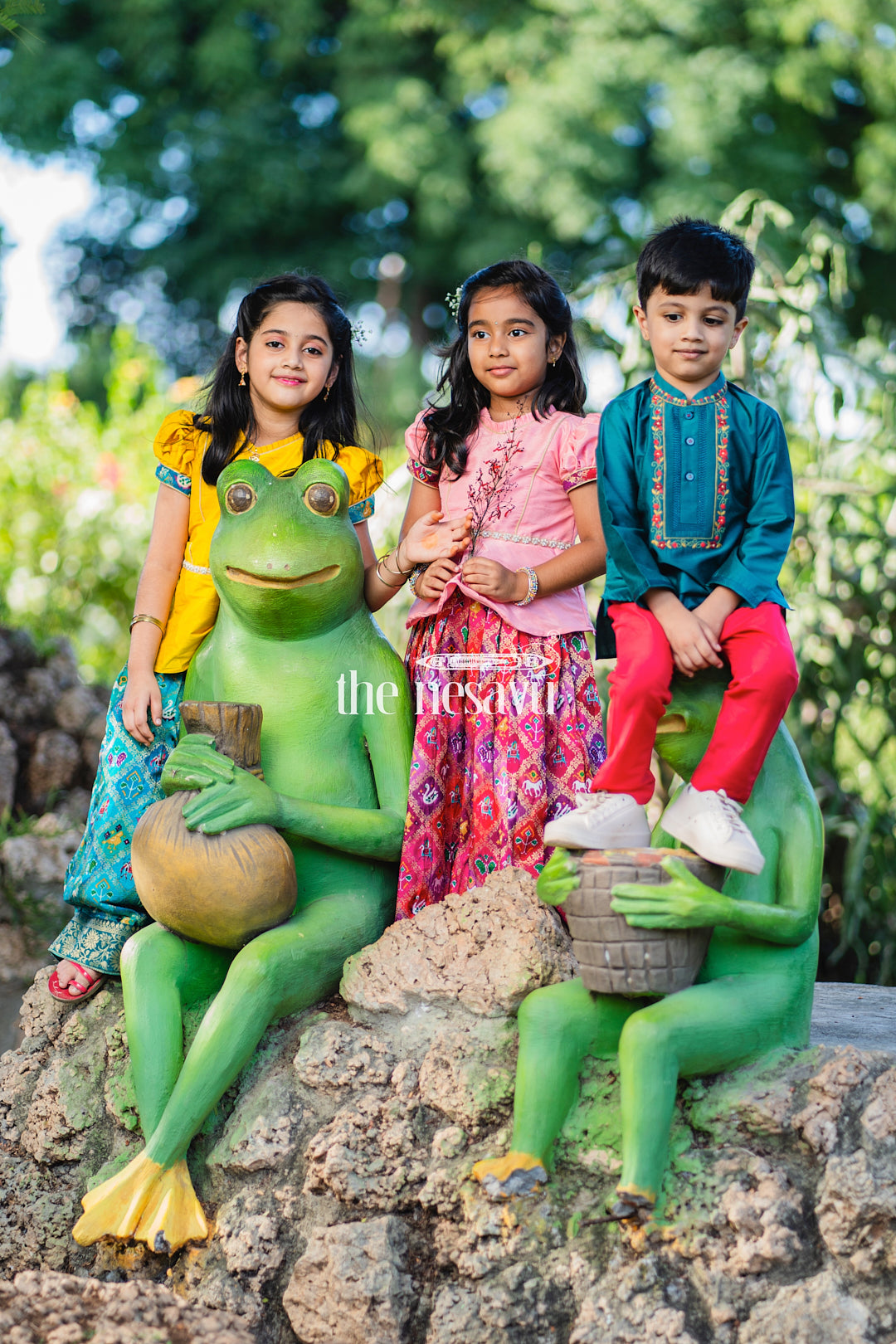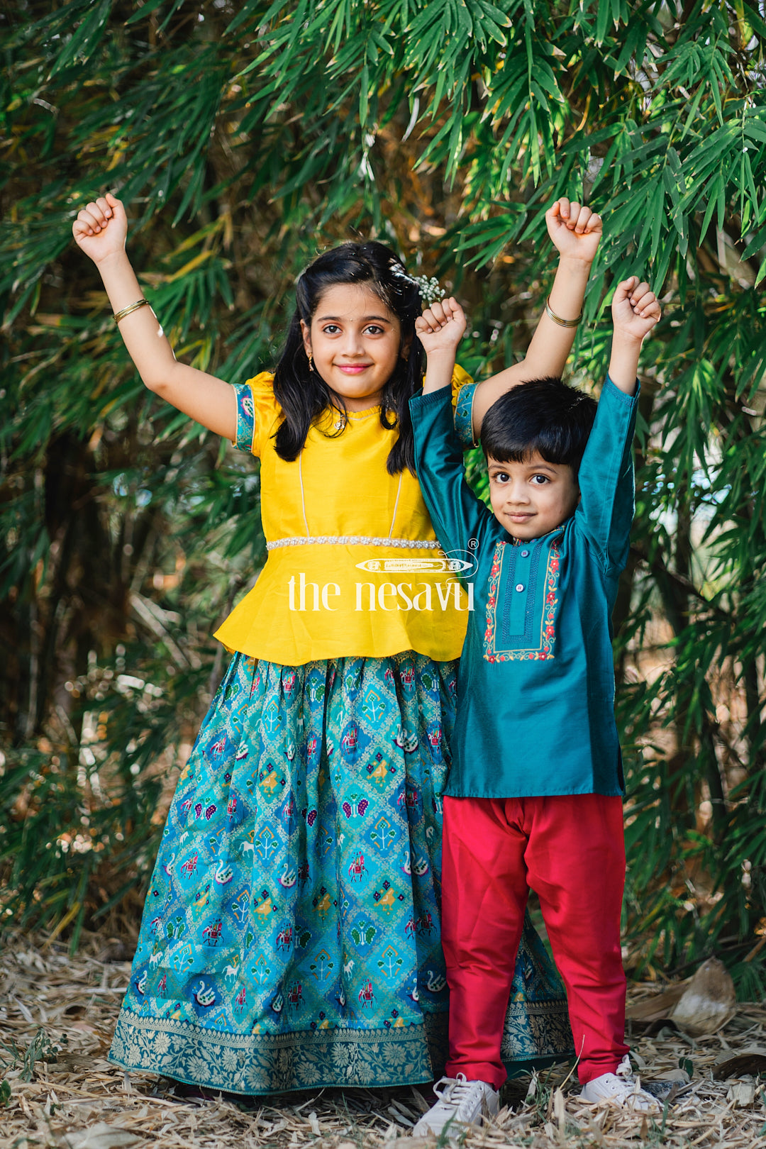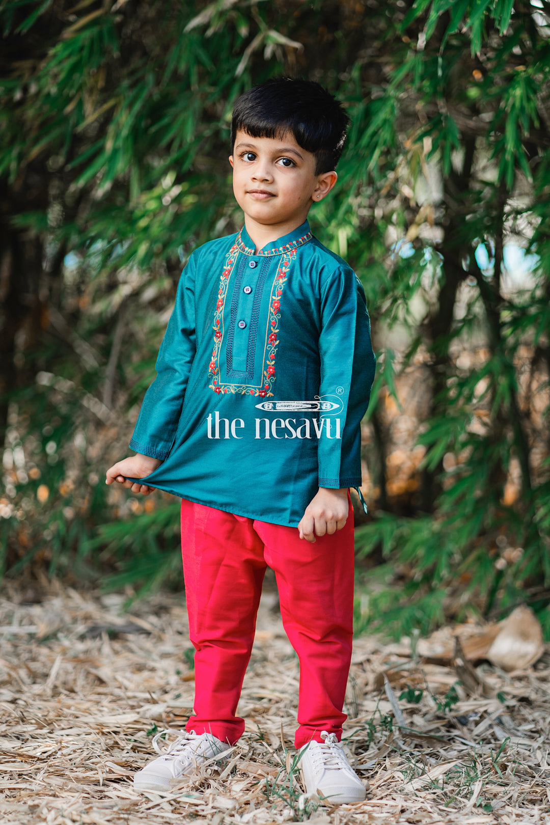 This Boys' Majestic Teal Kurta with Vibrant Pink Pants Set is a true celebration of color and tradition. The teal kurta is beautifully accented with intricate embroidery around the neckline and placket, providing a regal touch to the ensemble. The vibrant pink pants add a playful contrast, making it a striking outfit for any festive occasion. It's a blend of comfort, style, and tradition that will make your boy stand out in the crowd.