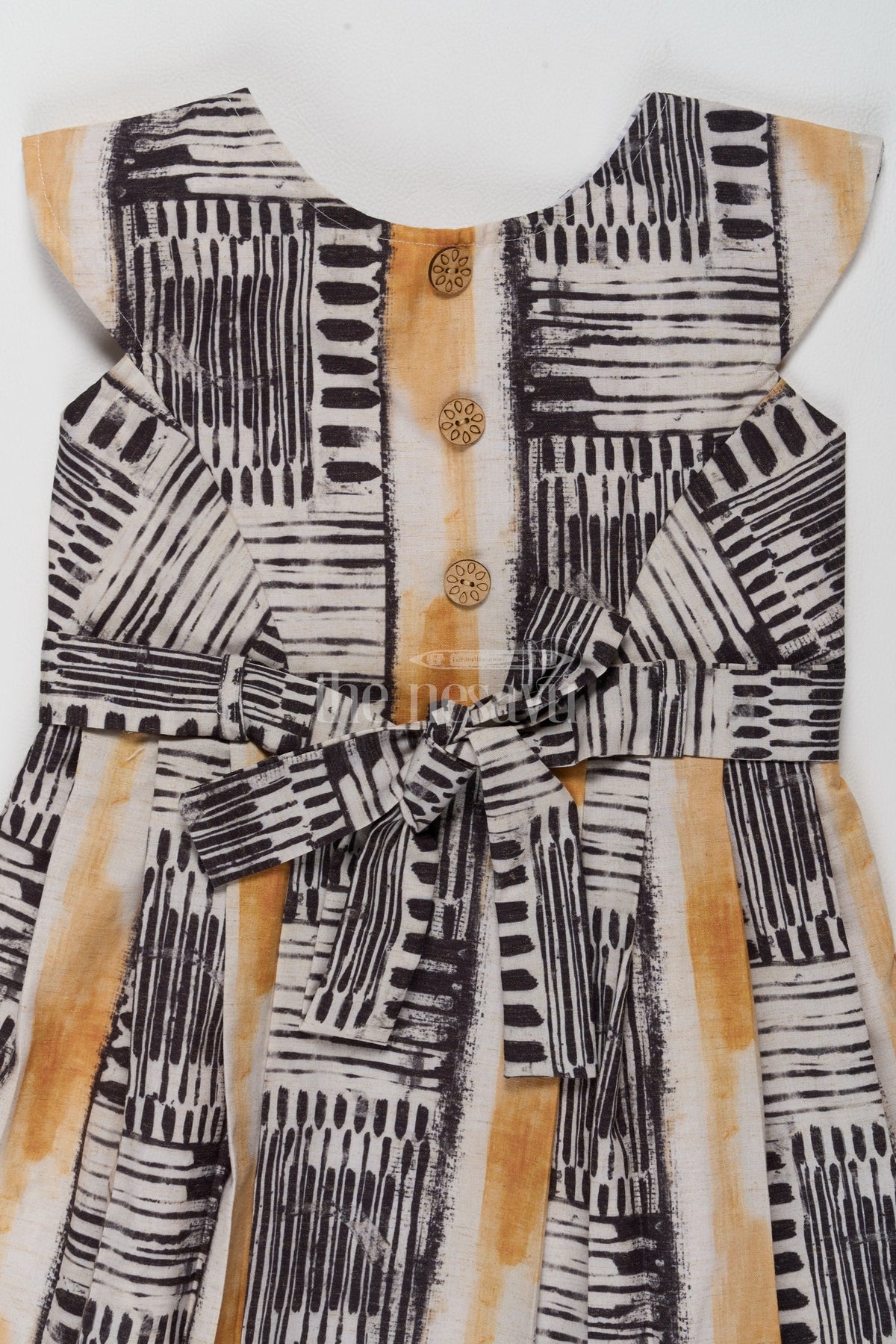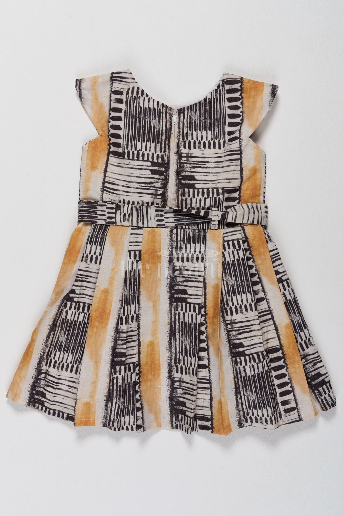 Redefine everyday style with this casual cotton frock for girls, featuring a modern black-and-yellow striped pattern. The frock combines a relaxed fit with chic button detailing and a bow at the waist, making it an effortlessly stylish choice. The cotton fabric provides breathable comfort, ideal for all-day wear during playdates, family outings, or casual events. Its sleeveless cut and neat pleats add a touch of grace to this functional design. Pair it with simple sandals and a hairband to create an easy yet fashionable look for your little girl.