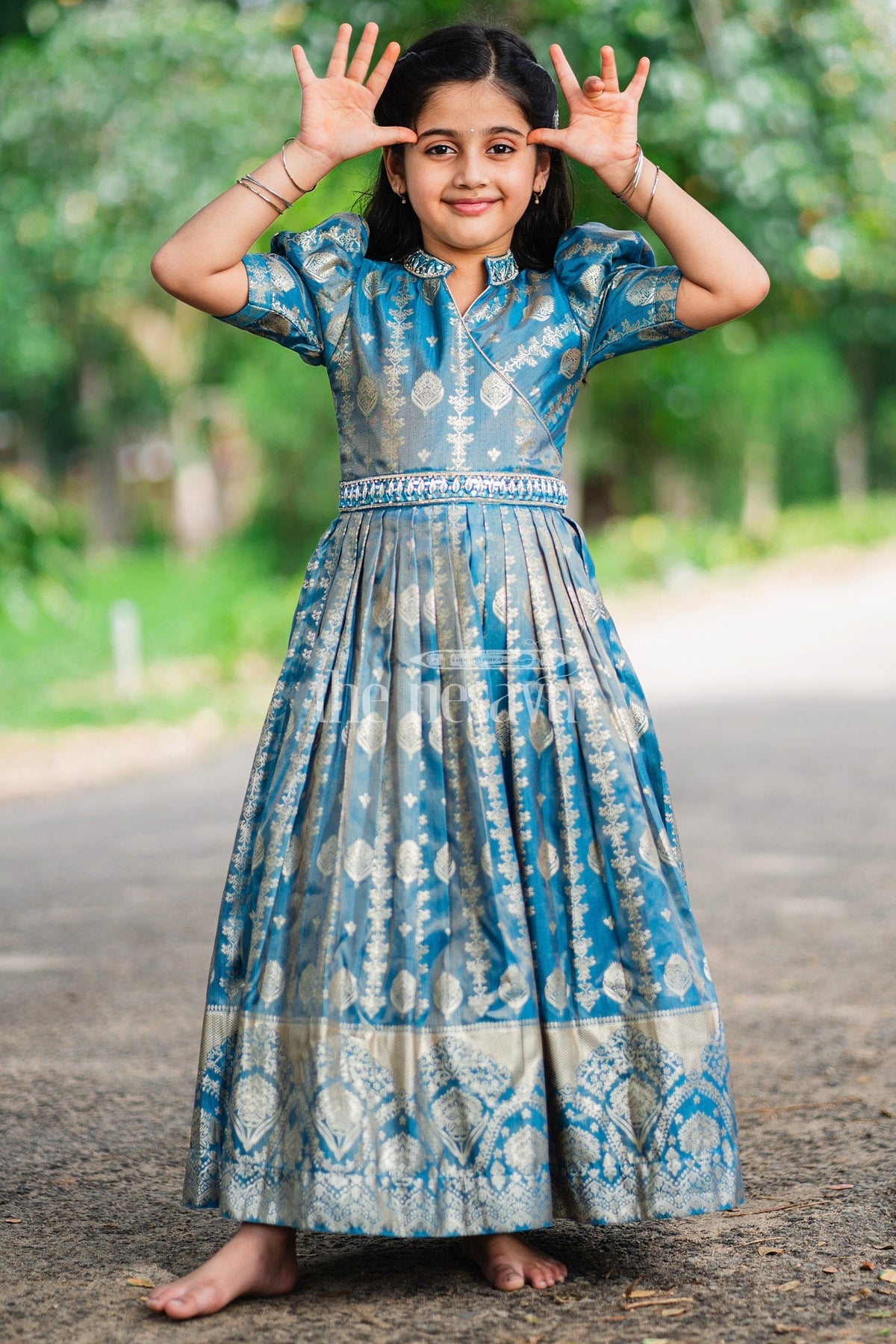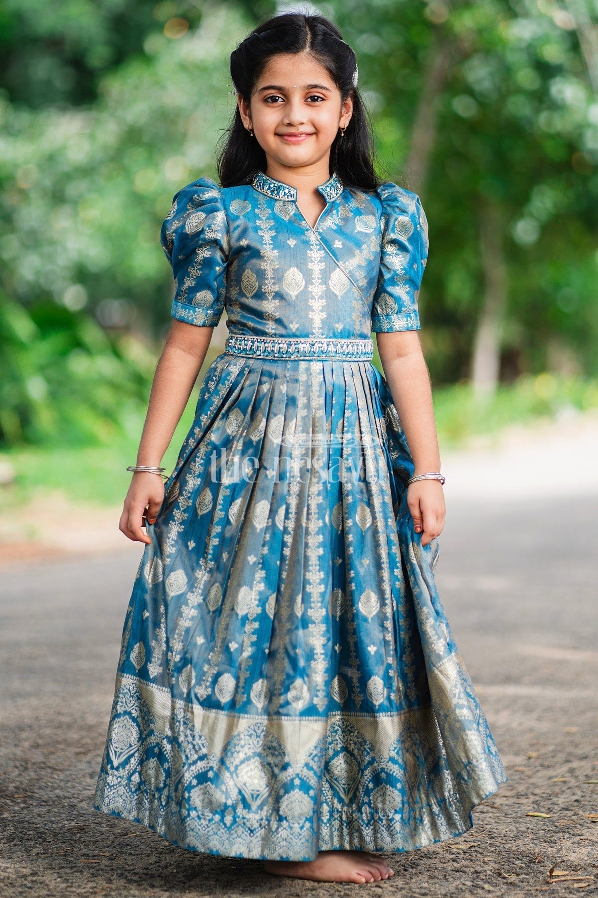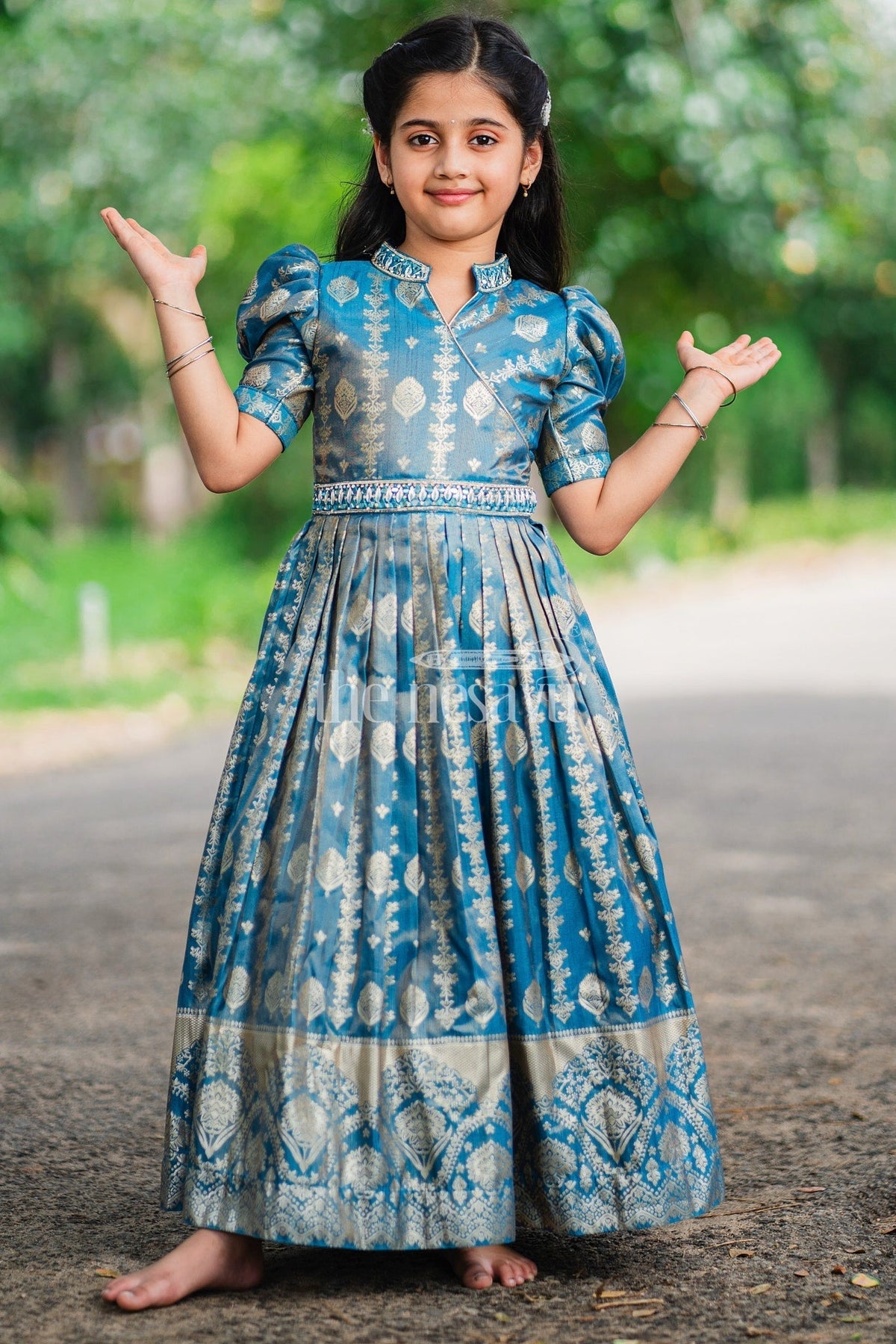 This Girls Silk Gown radiates luxury with its rich blue fabric and intricate golden motifs. The gown's regal appeal is enhanced by its puffed sleeves and a chic high collar neckline. The crossover bodice and detailed embroidery at the waist lend a sophisticated touch to the overall design. The pleated skirt, adorned with traditional golden artwork, creates a beautiful flow, making it perfect for formal occasions. The elegant golden border at the hem adds depth to the gown, creating a statement look. Ideal for weddings, festive events, or cultural celebrations, pair this gown with gold accessories and traditional footwear to complete the ensemble.