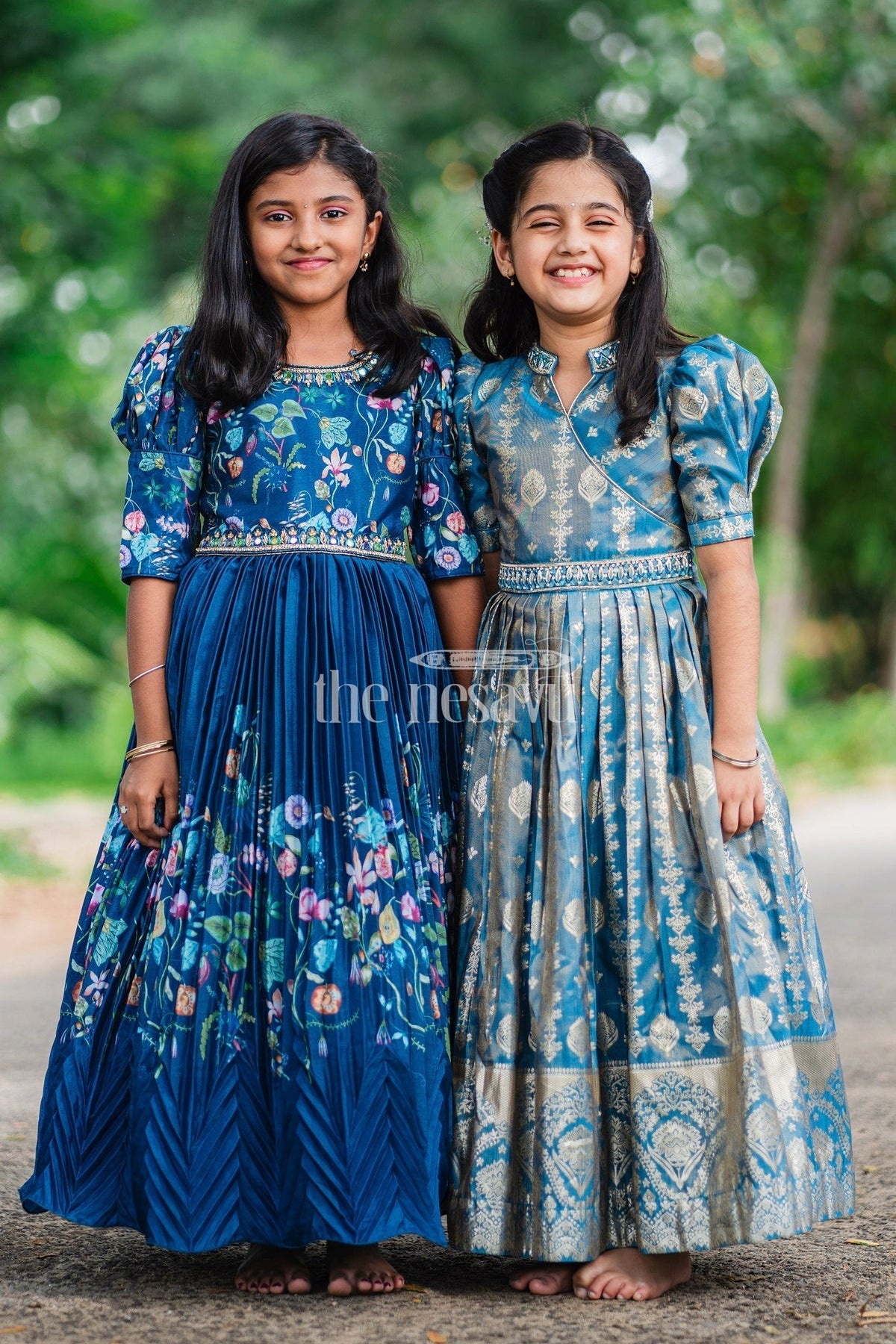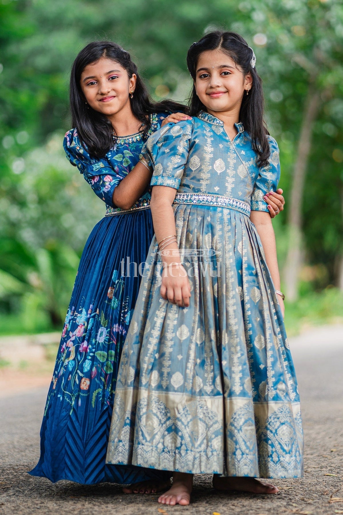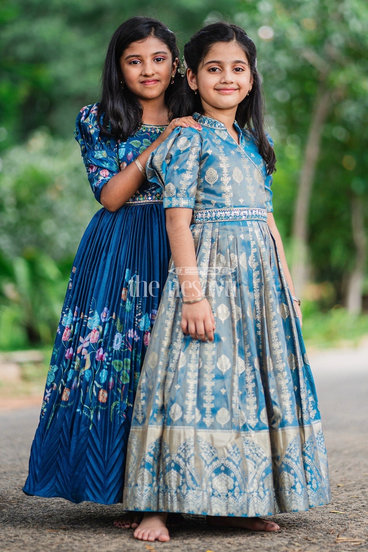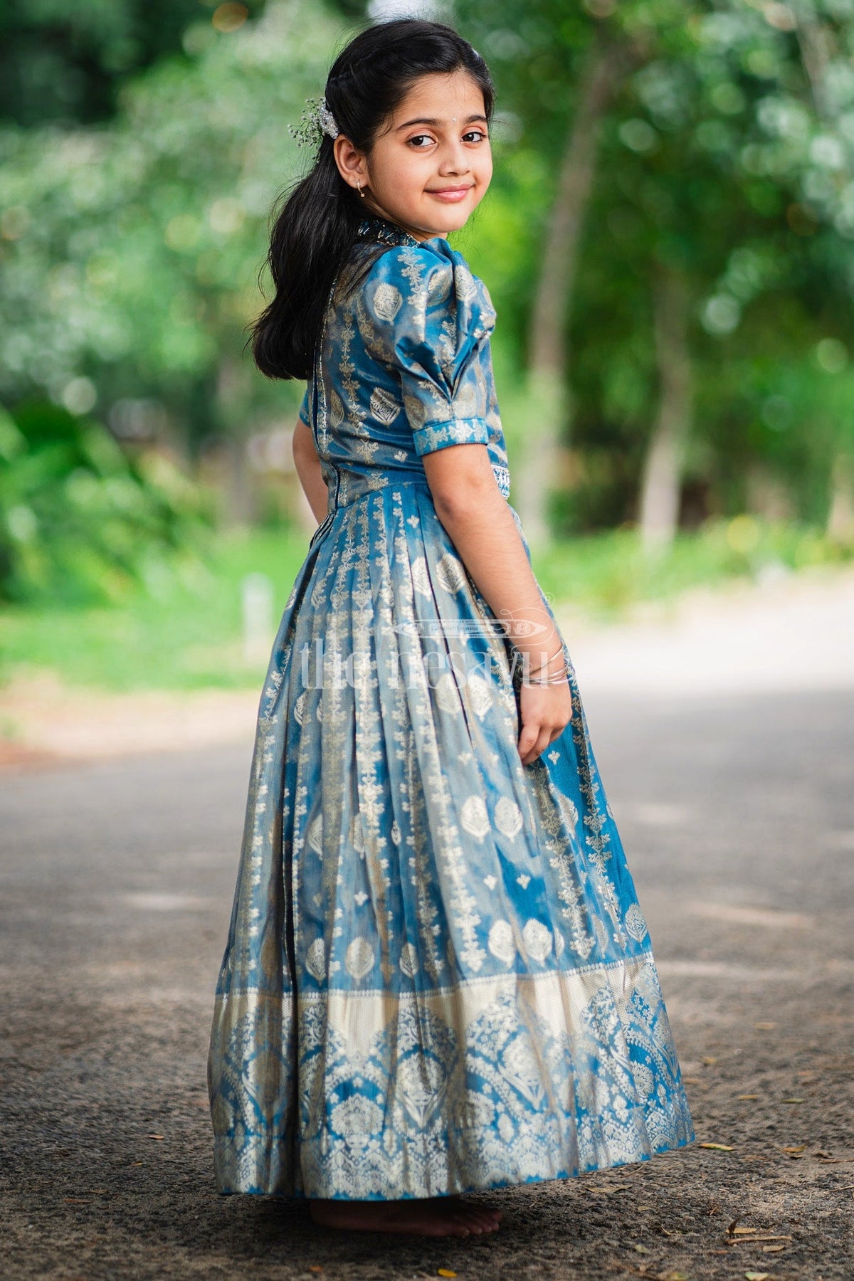 This Girls Silk Gown radiates luxury with its rich blue fabric and intricate golden motifs. The gown's regal appeal is enhanced by its puffed sleeves and a chic high collar neckline. The crossover bodice and detailed embroidery at the waist lend a sophisticated touch to the overall design. The pleated skirt, adorned with traditional golden artwork, creates a beautiful flow, making it perfect for formal occasions. The elegant golden border at the hem adds depth to the gown, creating a statement look. Ideal for weddings, festive events, or cultural celebrations, pair this gown with gold accessories and traditional footwear to complete the ensemble.