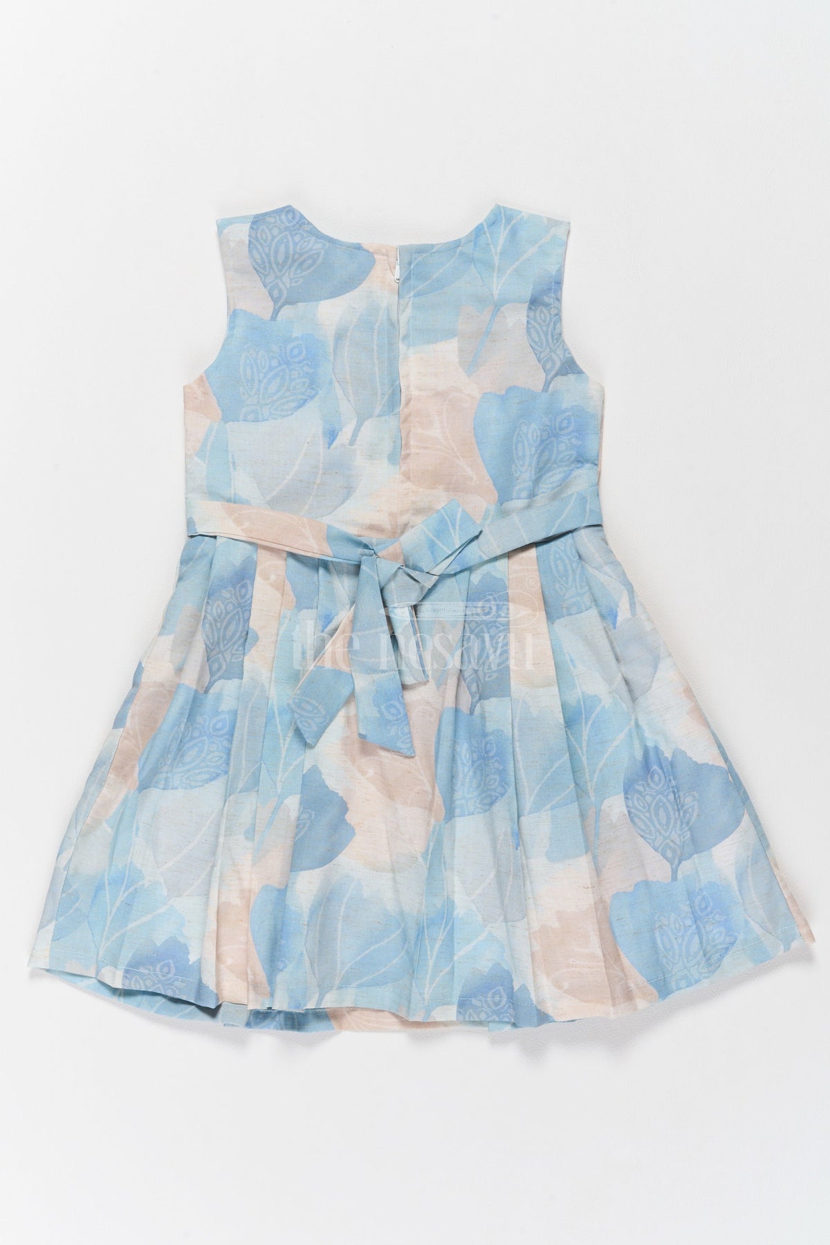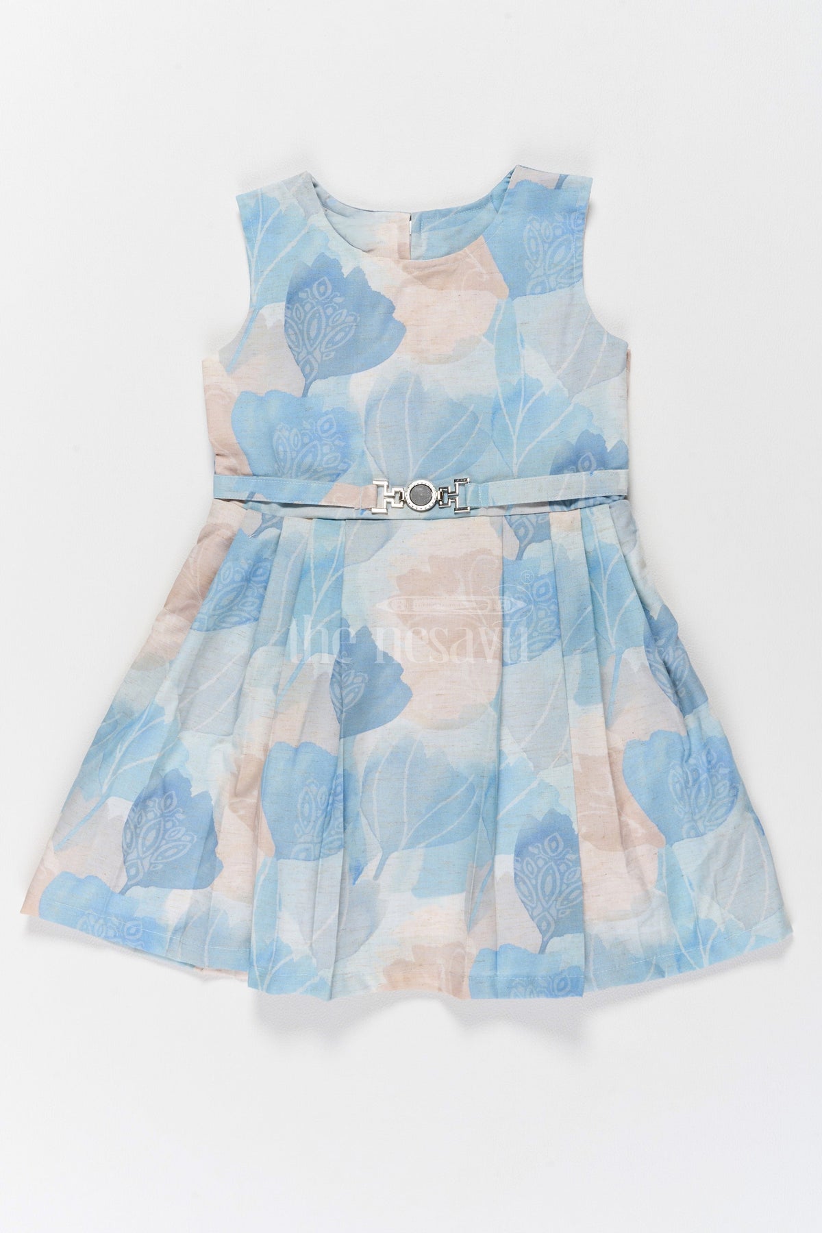 The Nesavu Girls Fancy Frock Girls Cotton Frock with Elegant Blue and Beige Floral Print and Chic Waist Belt Nesavu 22 (4Y) / Blue GFC1521A-22 Nesavu Girls Cotton Frock Elegant Blue Beige Floral Print Chic Waist Belt