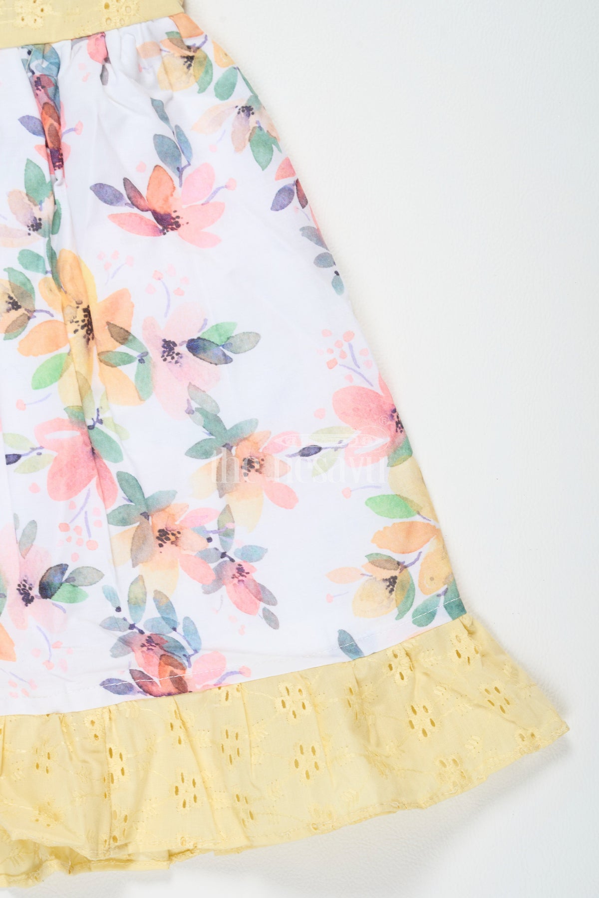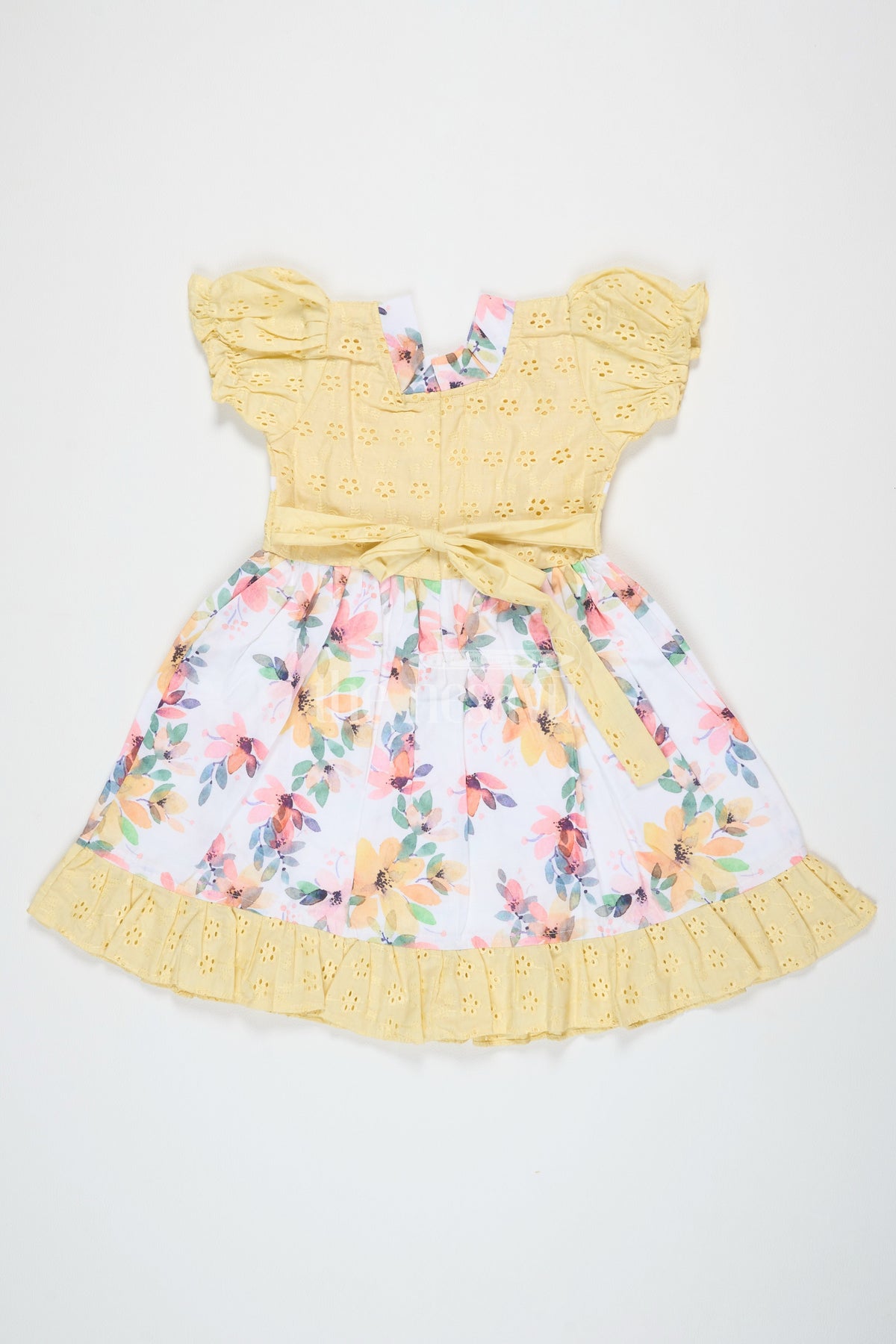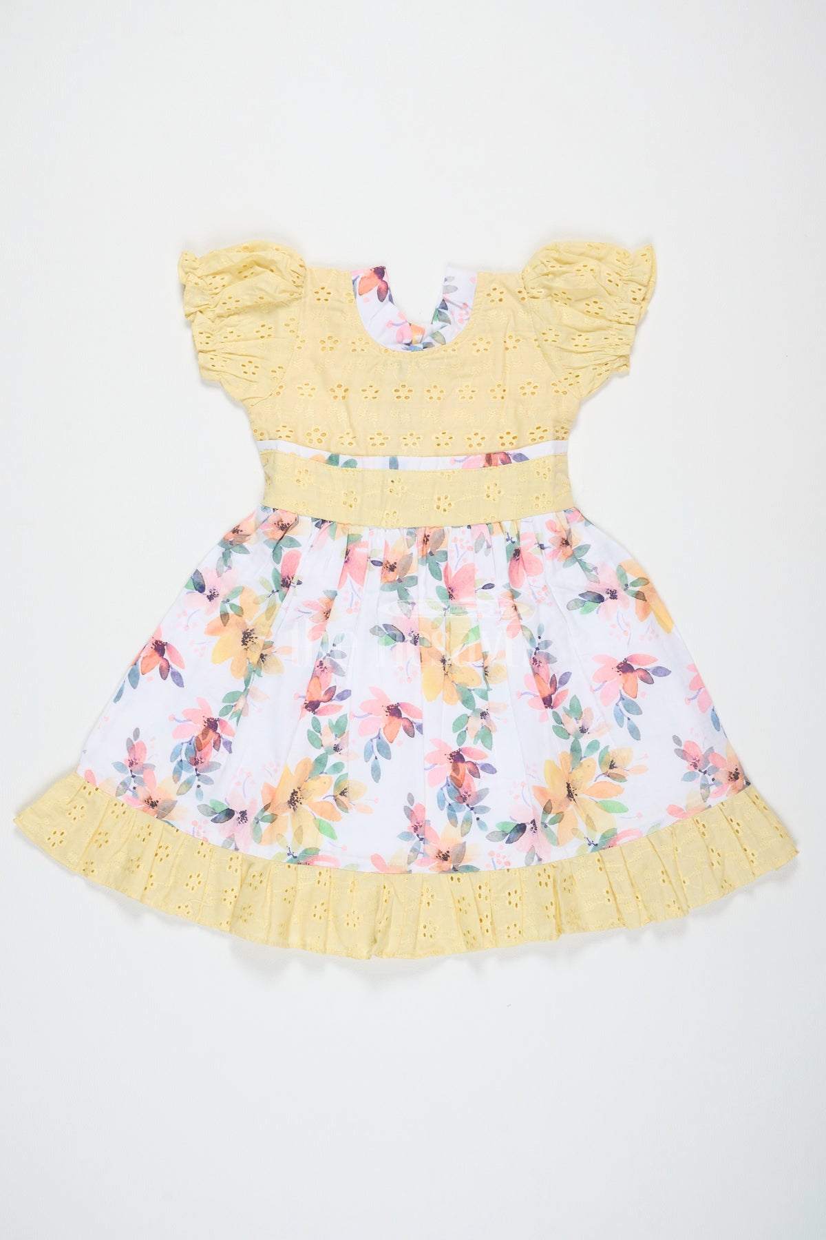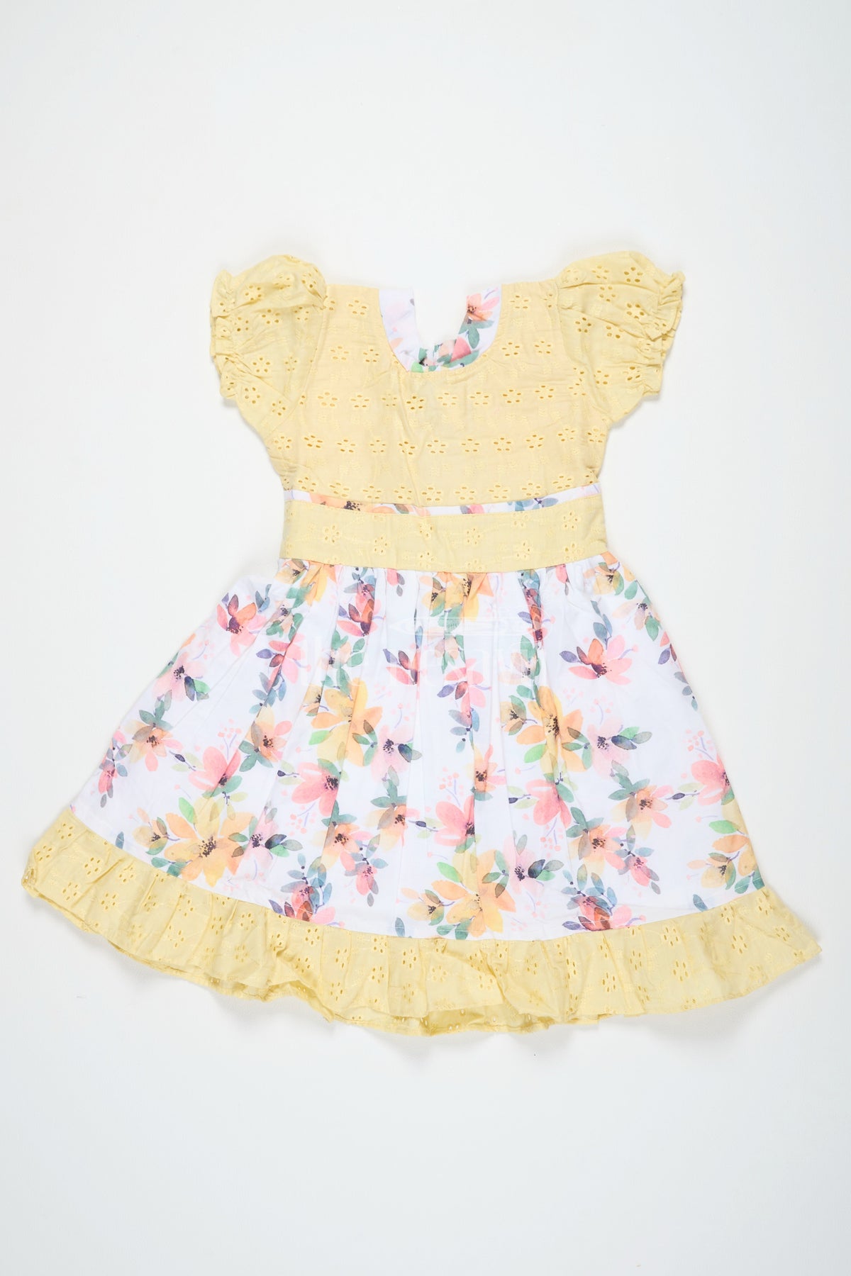 This yellow Diwali festive dress is perfect for bright celebrations. The bodice features delicate eyelet embroidery, adding a tactile appeal, while the floral skirt bursts with vibrant shades of orange, pink, and green. The puffed sleeves and gathered waist create a charming, flared silhouette. With soft ruffles at the hem, this dress is ideal for twirling and movement, making it a favorite for family functions, casual outings, and festivals like Diwali and Pongal. It balances festive charm with comfort, ensuring your little one looks stylish and feels relaxed throughout the day.