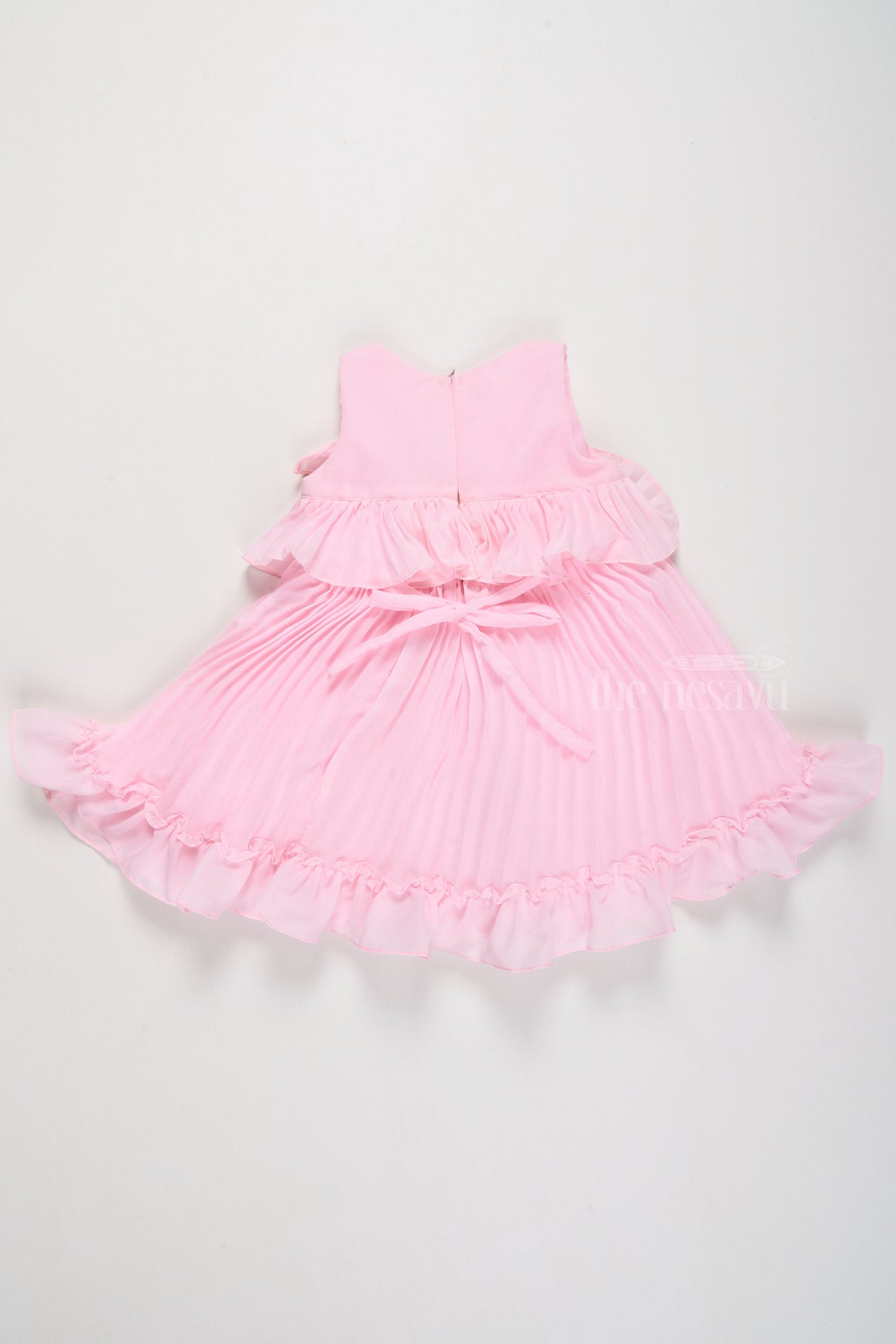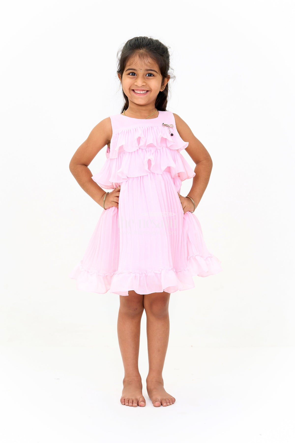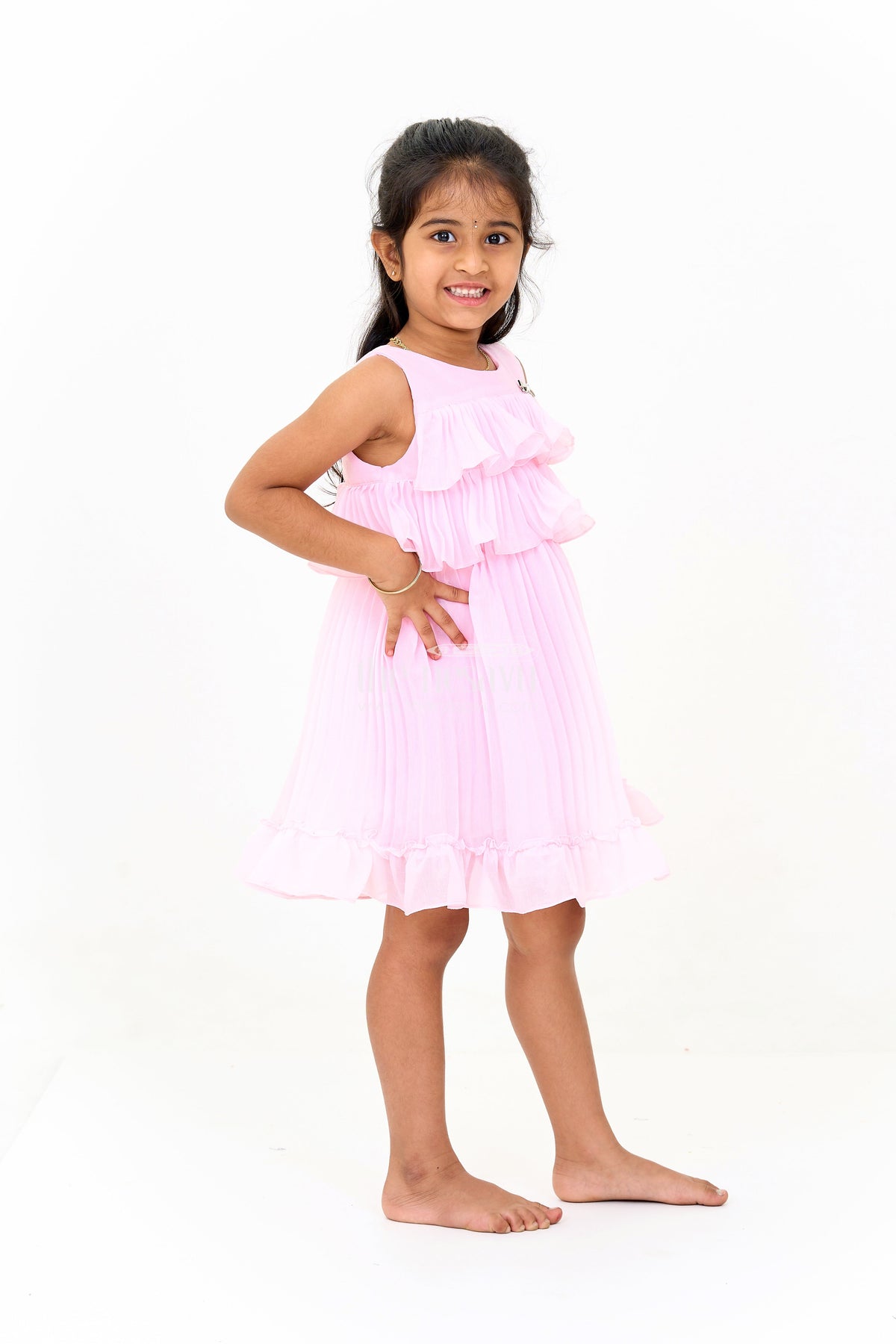 Your little one will love this delightful mini dress, featuring soft pleated layers and adorable ruffle accents. The blush pink georgette fabric is lightweight and breathable, making it perfect for all-day wear during special occasions or casual outings. The sleeveless design and comfortable fit allow unrestricted movement, while the subtle embellishments like the elegant bow detail at the neckline add a touch of glamour. Whether it's for a birthday celebration or a family outing, this dress is a versatile addition to your child’s wardrobe.
