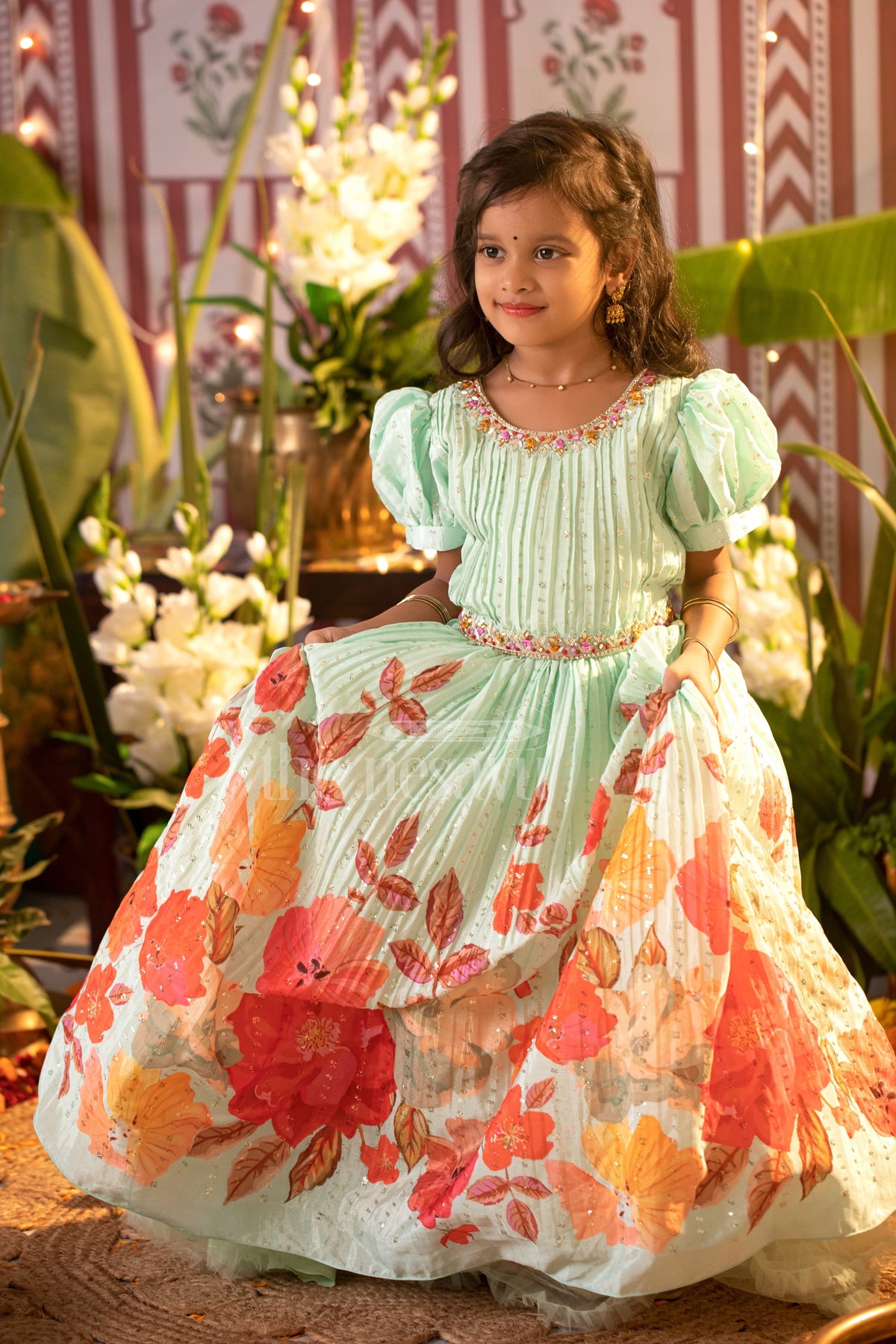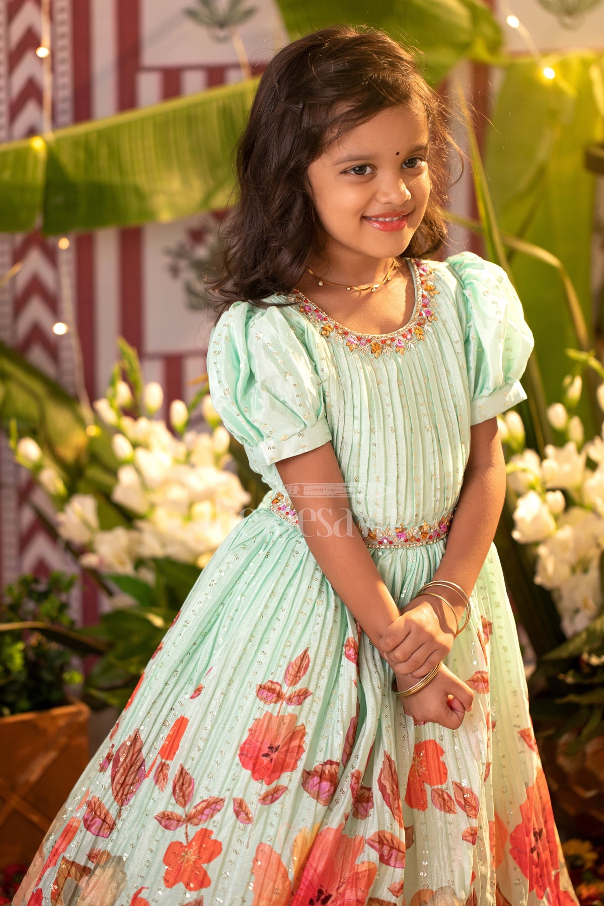 This Pista Green-colored party gown is a beautiful addition to any festive wardrobe. The gown features a pleated fabric with a designer floral print, offering a sophisticated look. It includes puff sleeves and embroidered neckline details, making it perfect for weddings and special events.