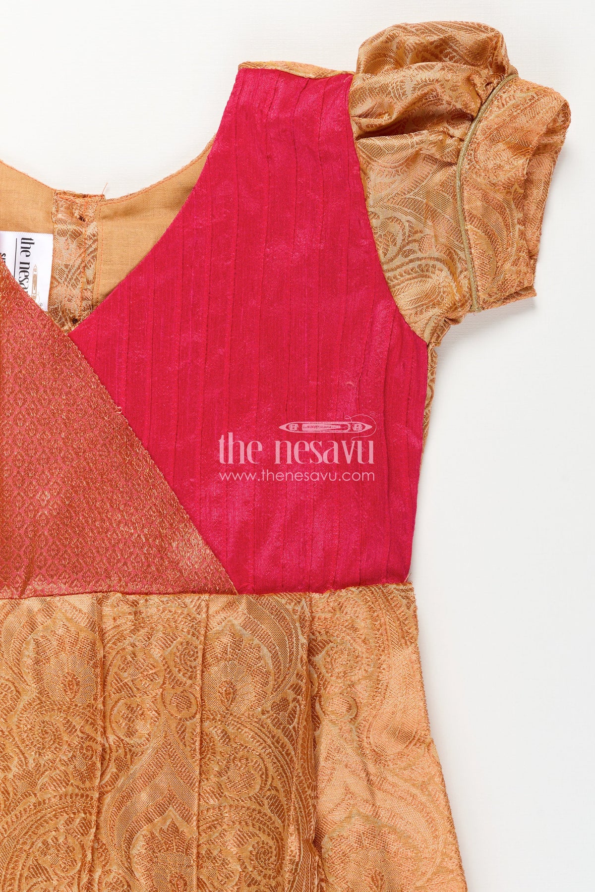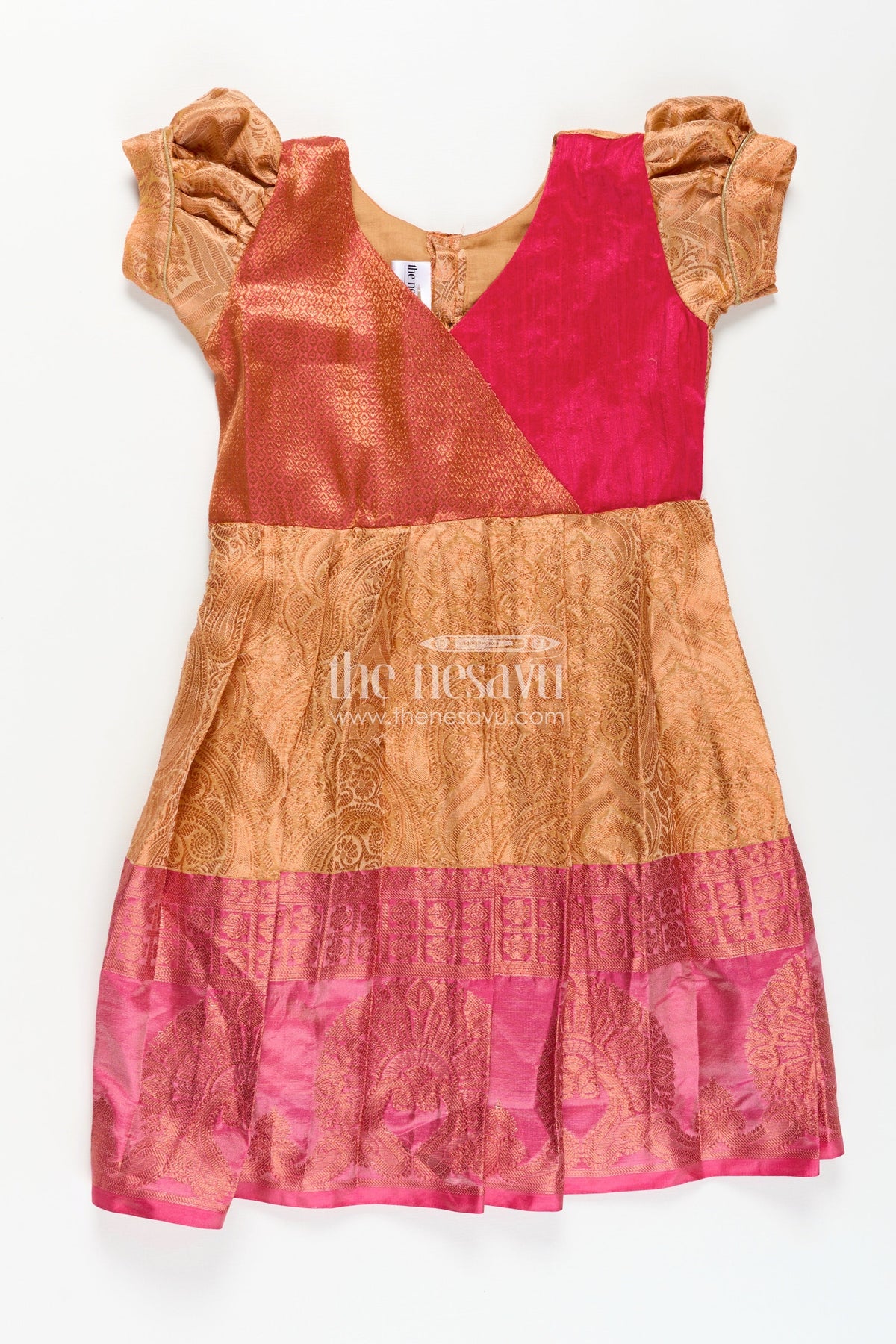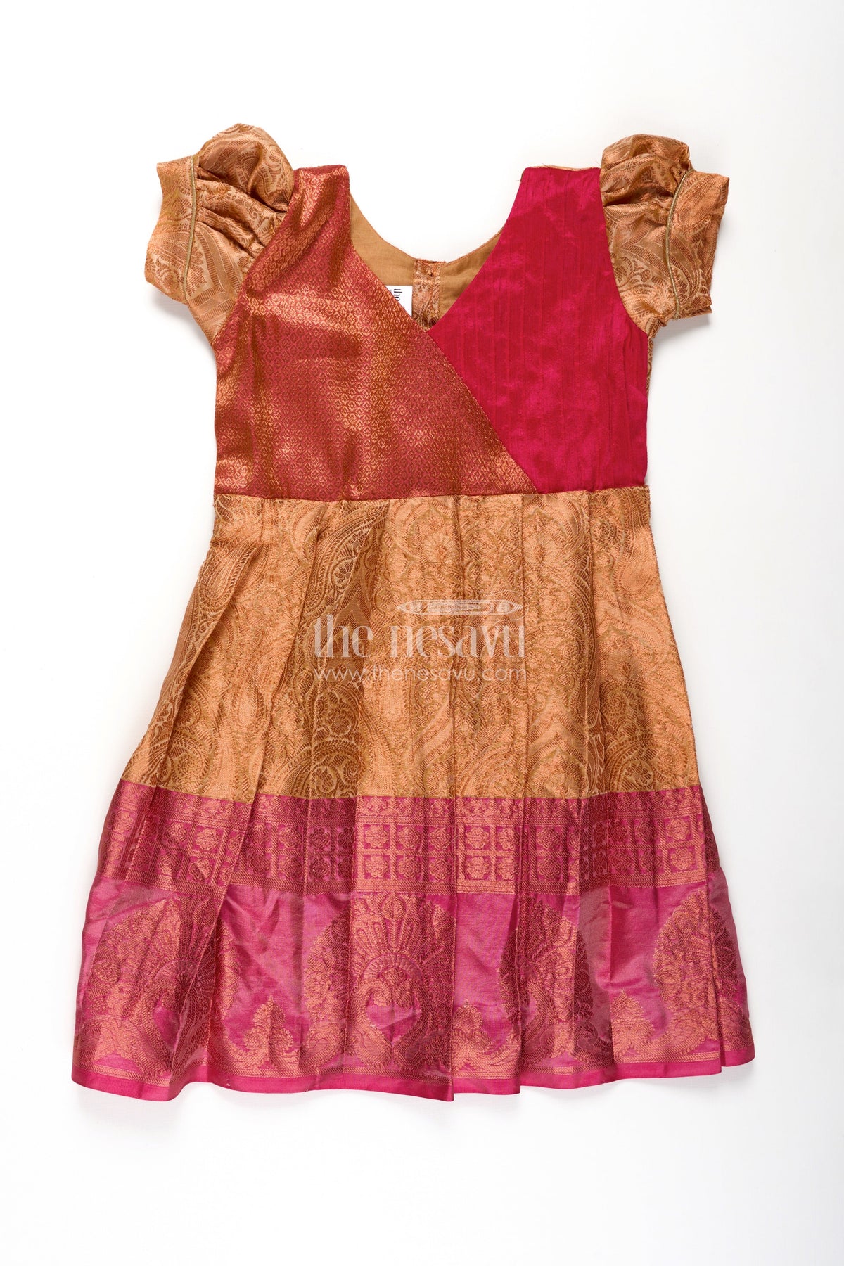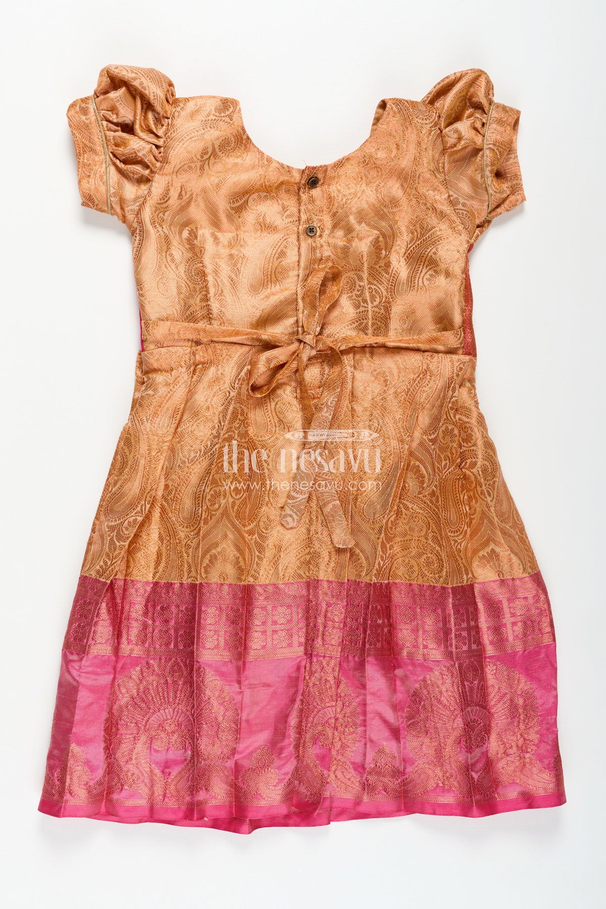 This orange silk frock is the perfect balance of festive glam and comfort for your little one. Made from a semi silk blend, it features a vibrant orange skirt detailed with woven motifs and a bold magenta hemline. The pin-tuck yoke in rich magenta adds texture and contrast, while puffed sleeves complete the traditional look. Ideal for special occasions, this frock ensures your child feels light and comfortable while looking beautifully dressed for any celebration.