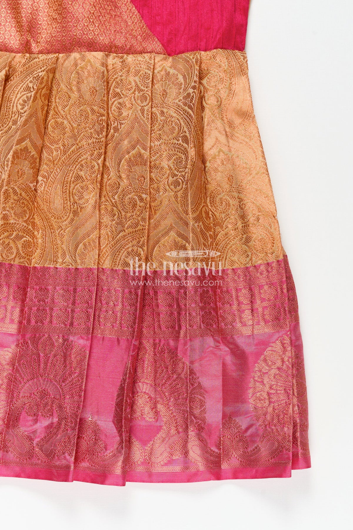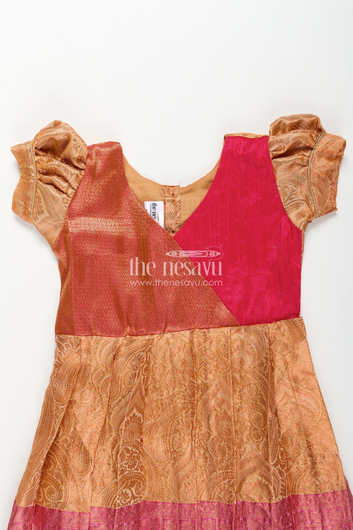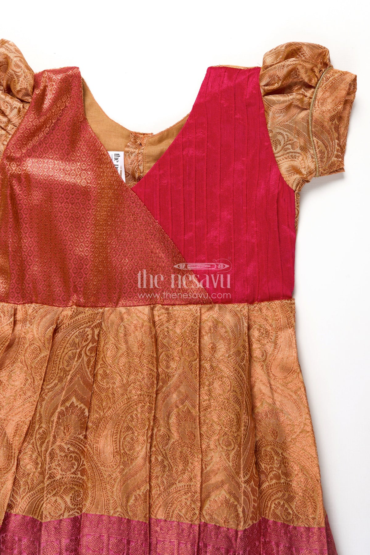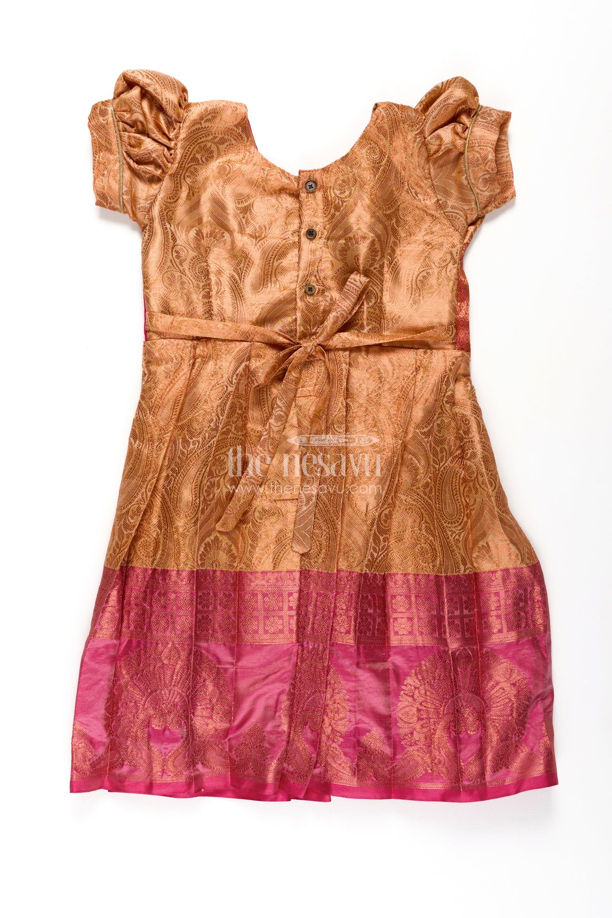 This orange silk frock is the perfect balance of festive glam and comfort for your little one. Made from a semi silk blend, it features a vibrant orange skirt detailed with woven motifs and a bold magenta hemline. The pin-tuck yoke in rich magenta adds texture and contrast, while puffed sleeves complete the traditional look. Ideal for special occasions, this frock ensures your child feels light and comfortable while looking beautifully dressed for any celebration.