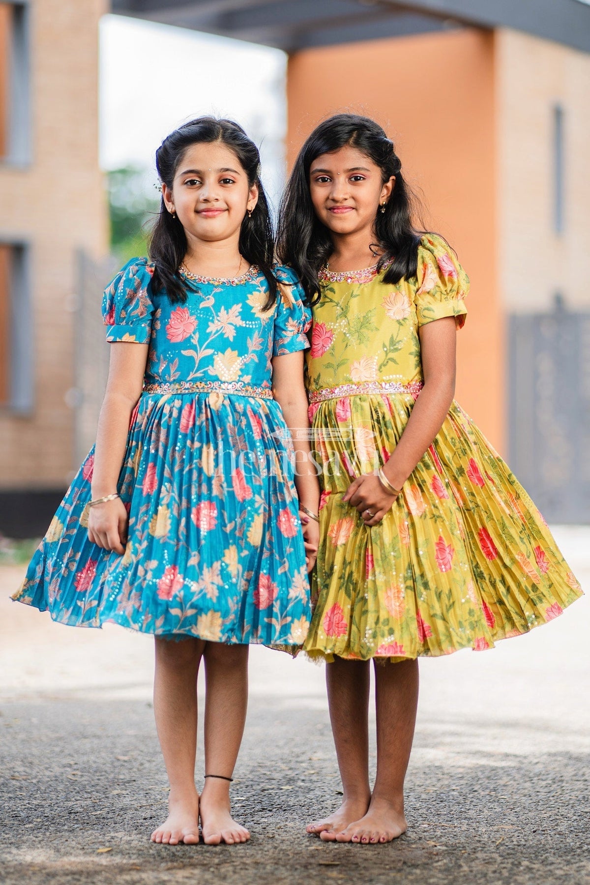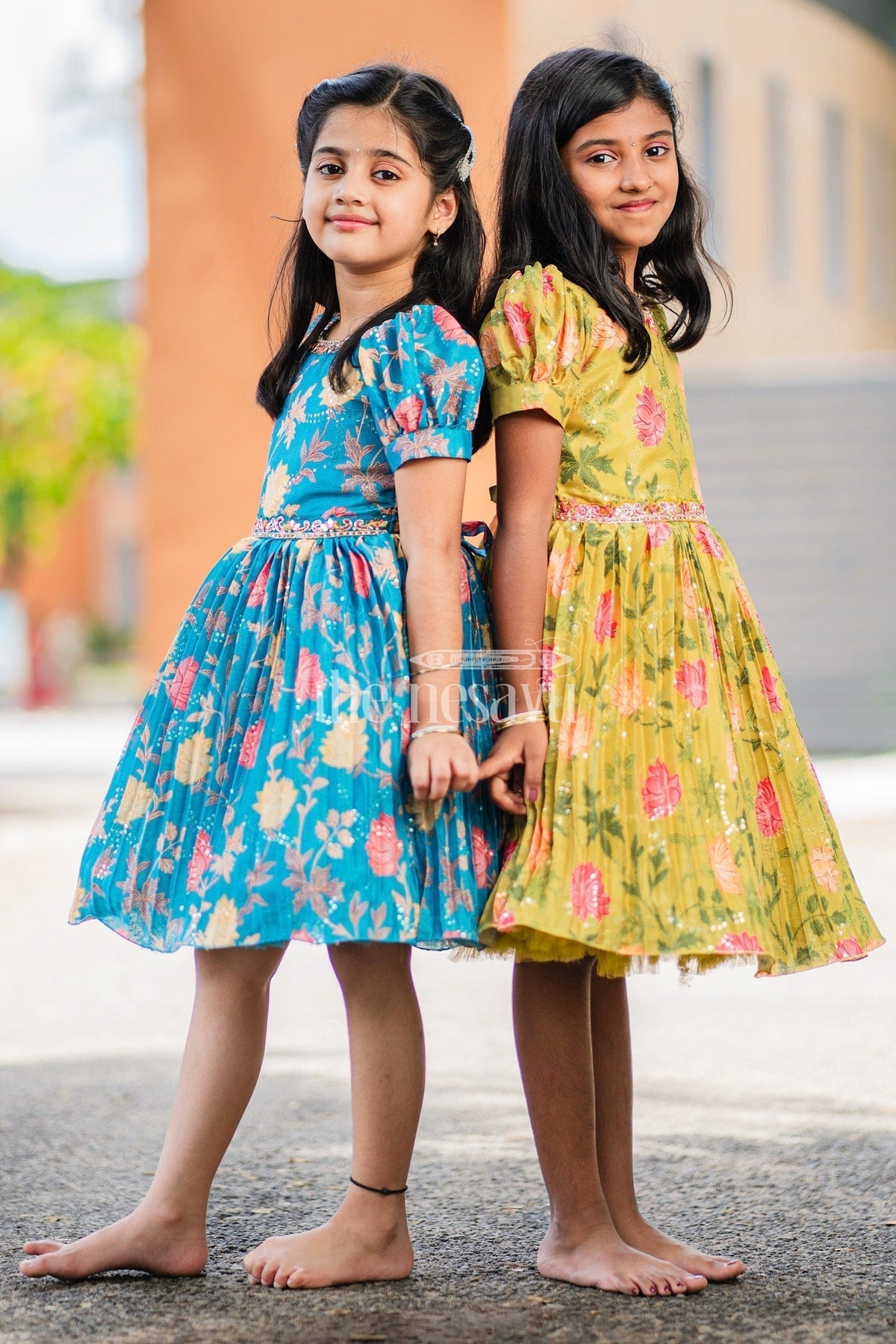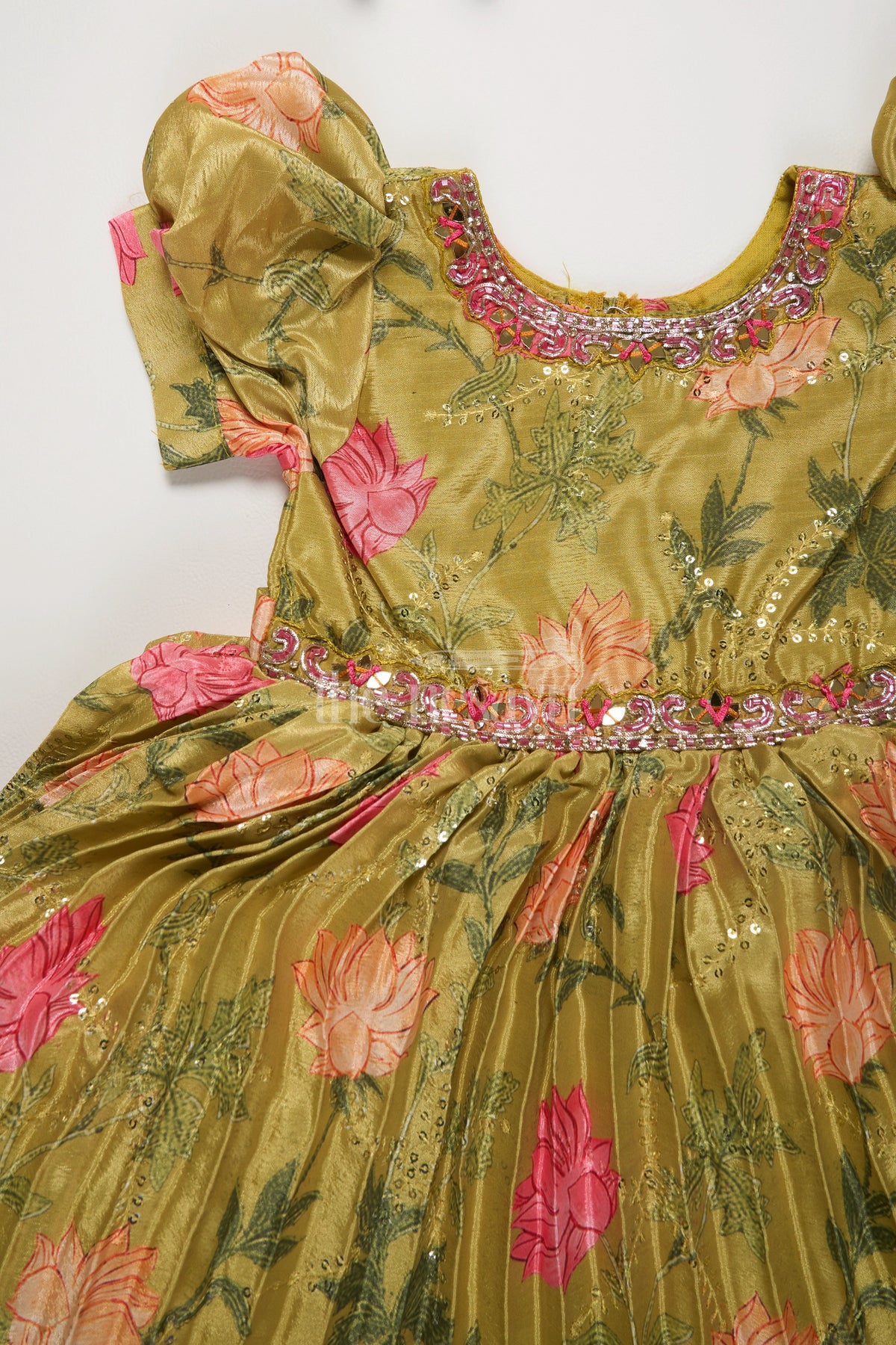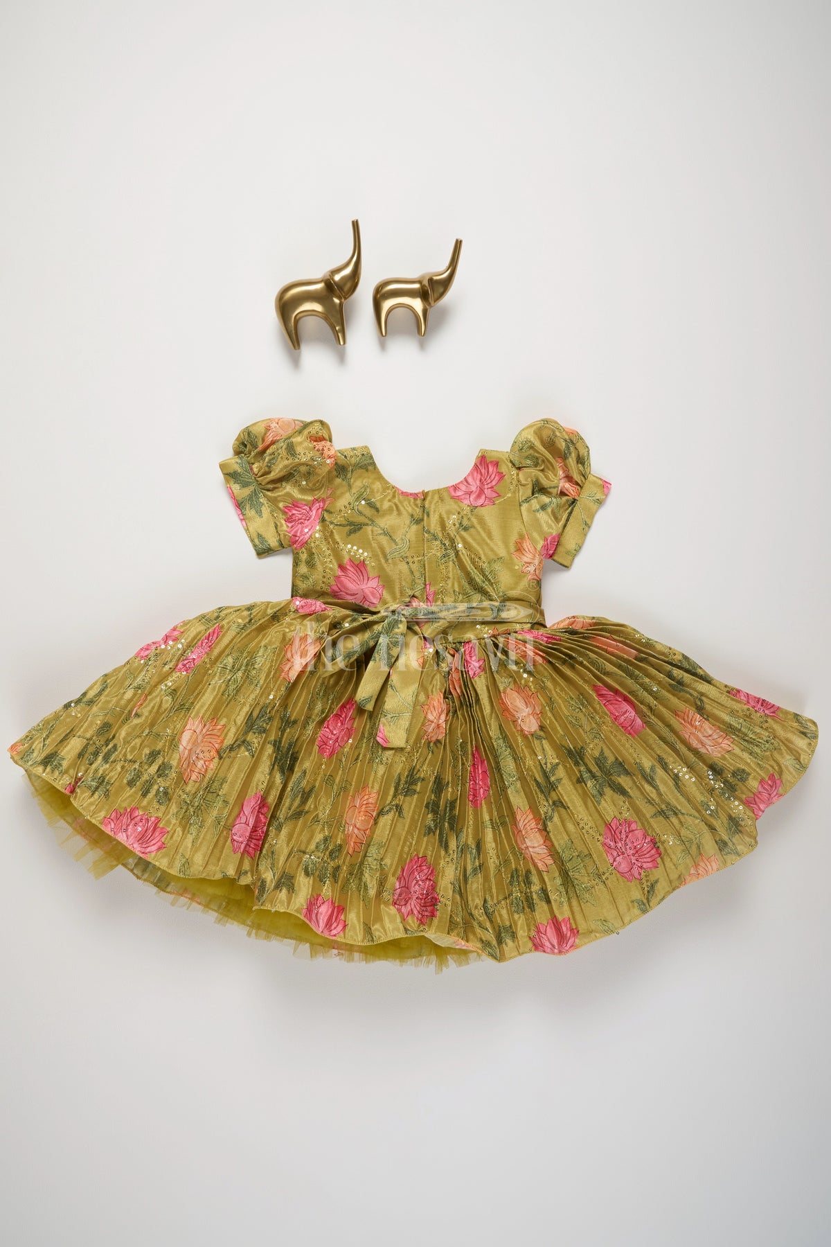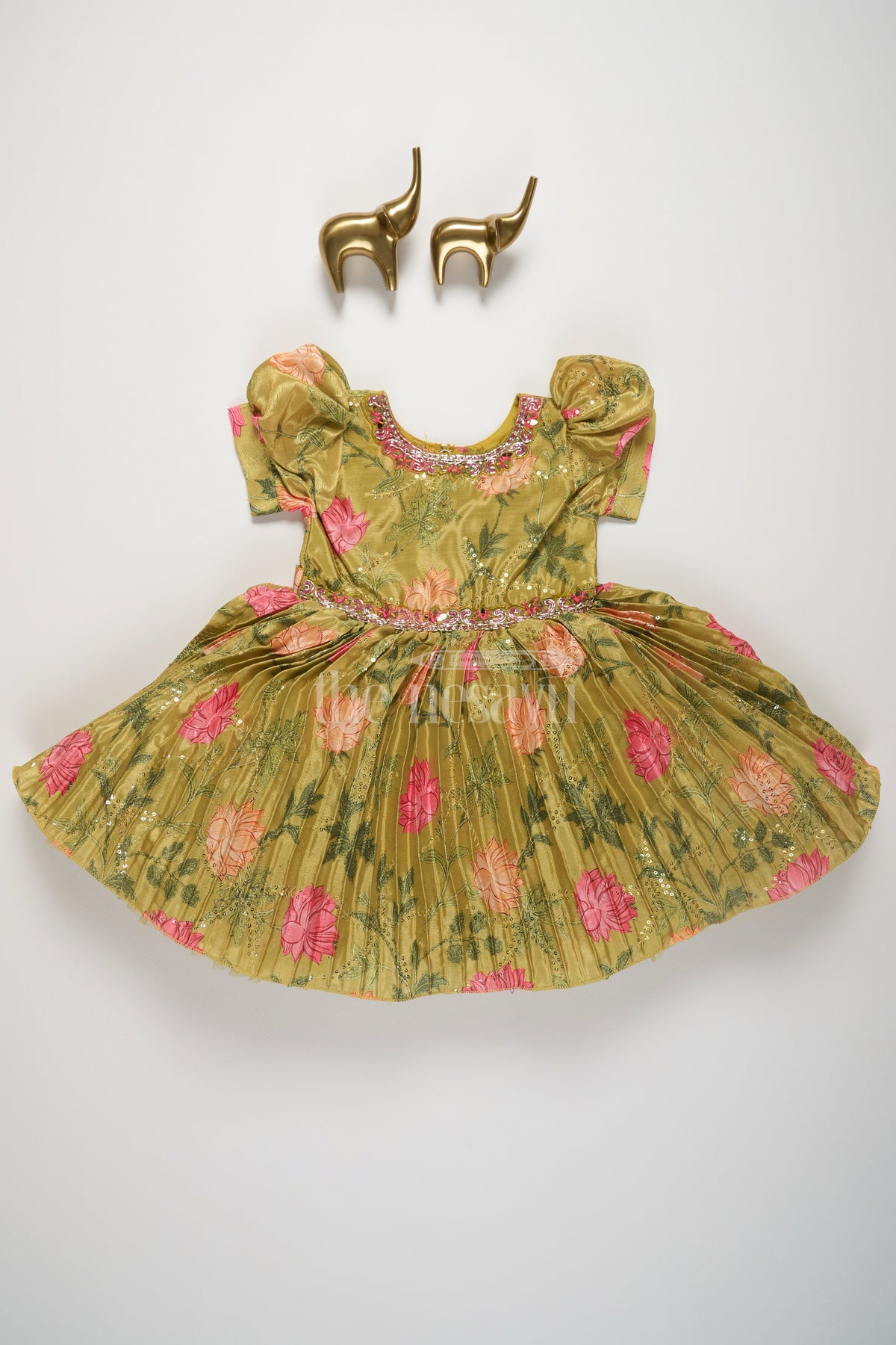This vibrant yellow silk party frock showcases bold floral prints in shades of pink and green, creating a striking nature-inspired design. The pleated skirt adds movement and volume, while the puff sleeves lend a vintage charm. The neckline and waist are adorned with delicate embellishments, adding a touch of sparkle to the festive design. Perfect for formal occasions, this dress blends a lively color palette with timeless floral patterns, making it both elegant and playful.