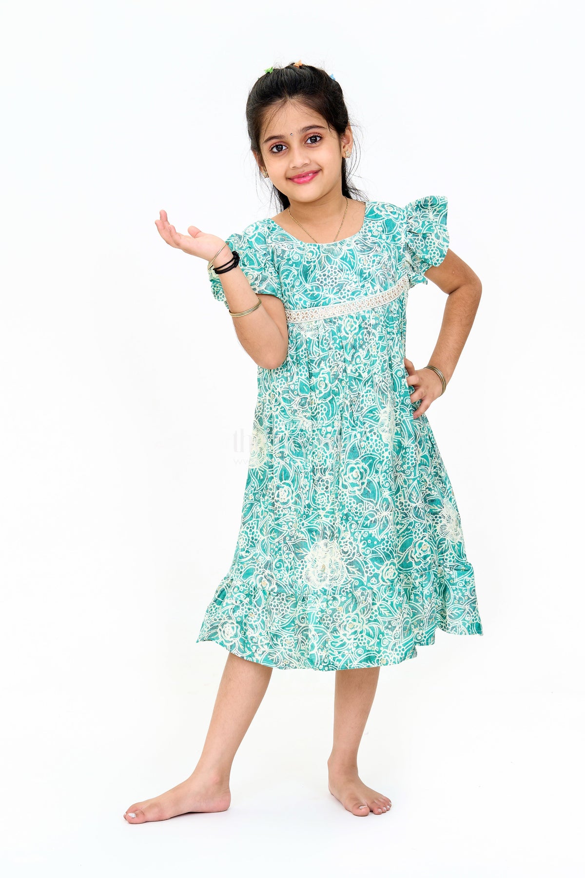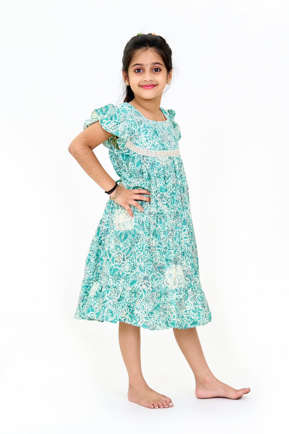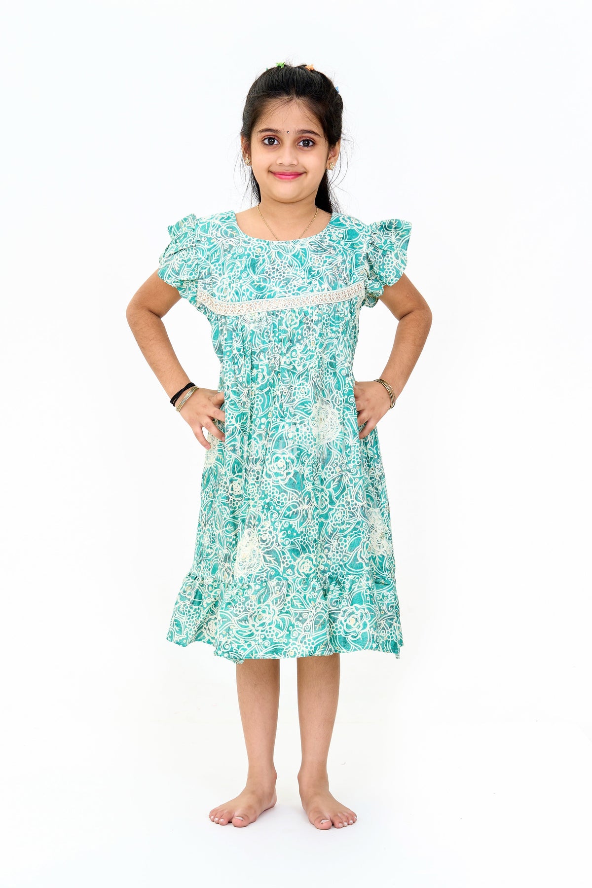 Elevate your little one's style with this charming Cotton One Piece Dress, thoughtfully crafted for comfort and elegance. Made from lightweight Rayon fabric, this dress is adorned with an intricate floral print in soft green tones, evoking a refreshing and natural vibe. The delicate lace detailing at the yoke adds a touch of sophistication, while the ruffled hemline and flutter sleeves create a playful and girly silhouette. Perfect for casual outings or summer gatherings, this dress blends breathable fabric with an airy design, ensuring your child stays cool and comfortable all day long. Whether it's a family outing or a photo shoot, this one-piece cotton frock exudes timeless charm.