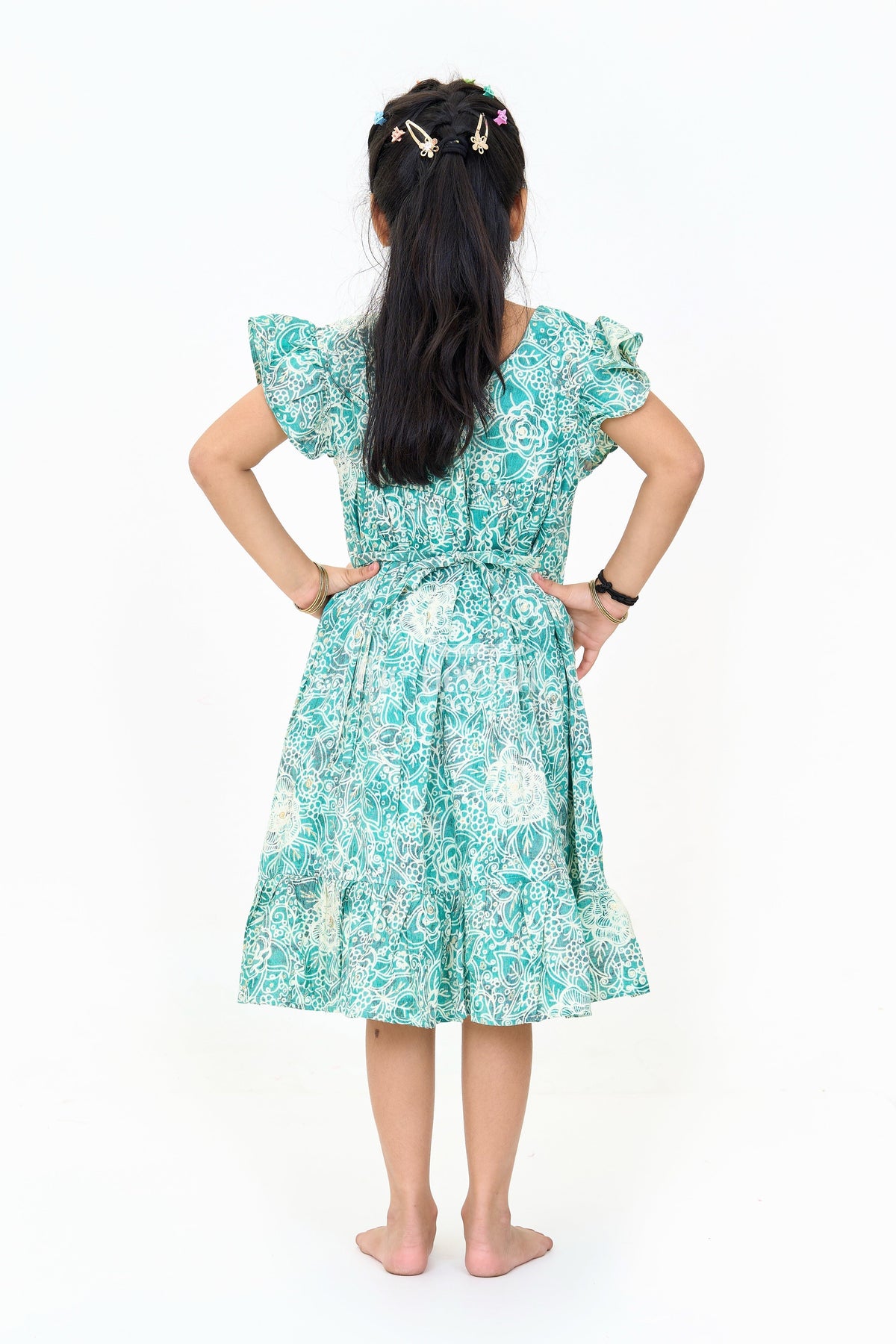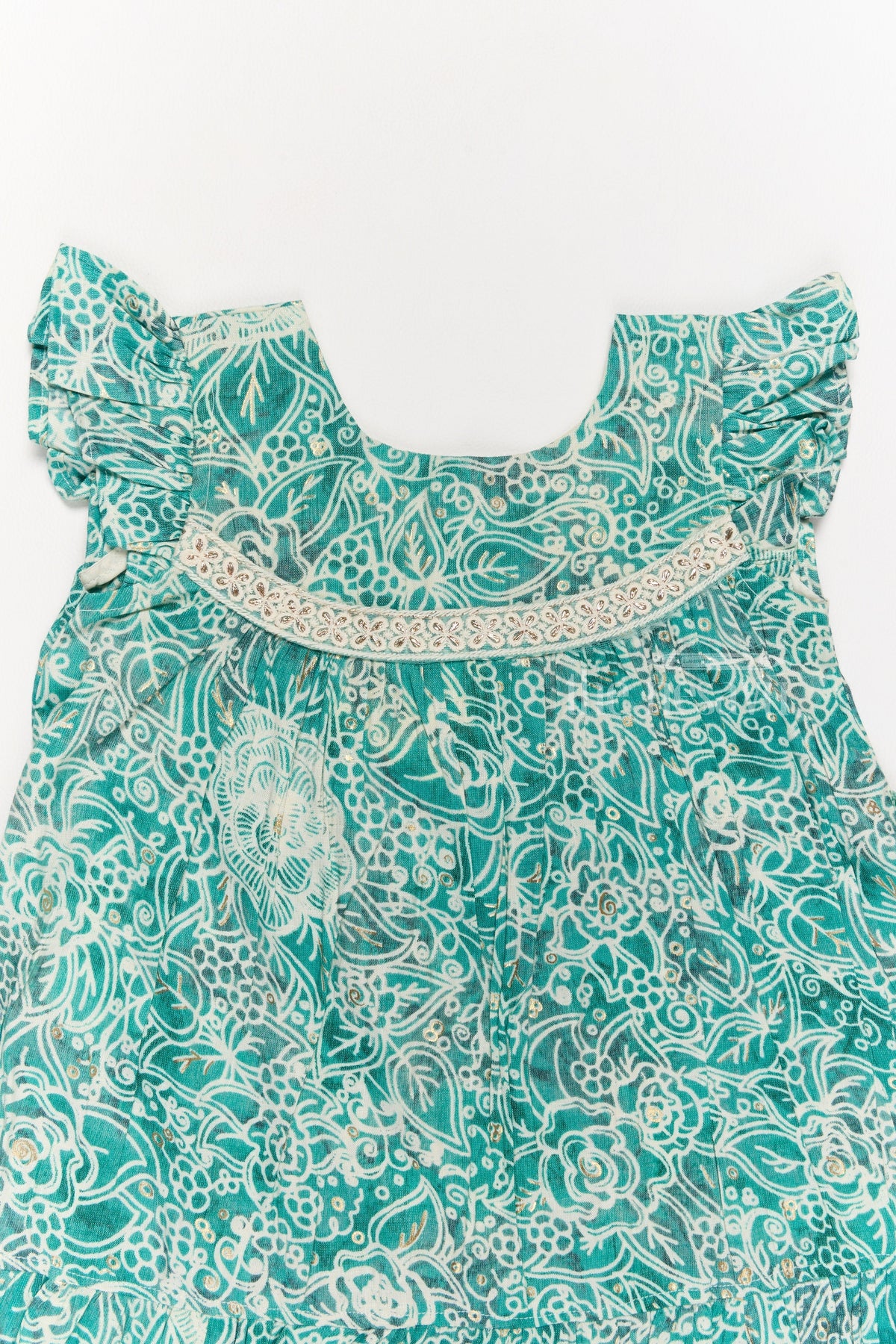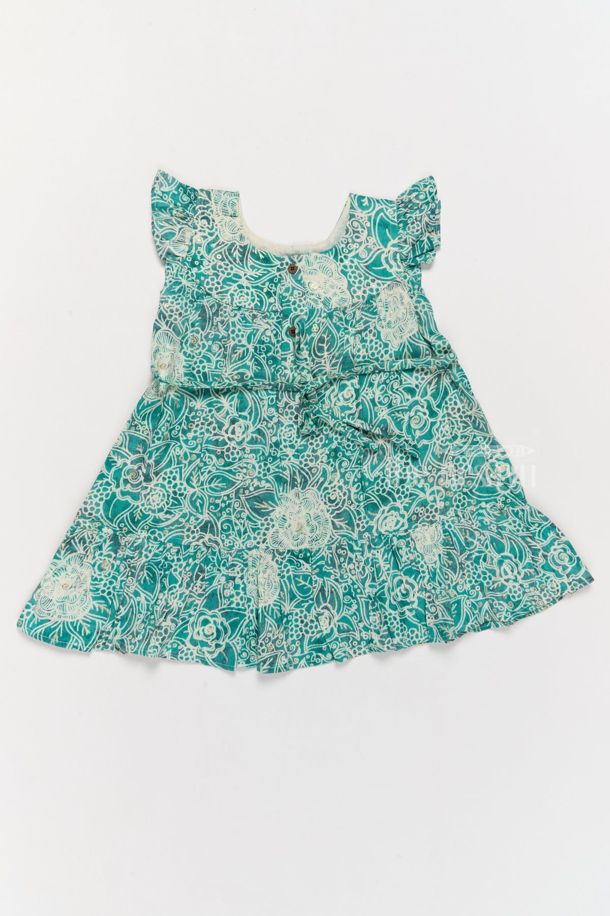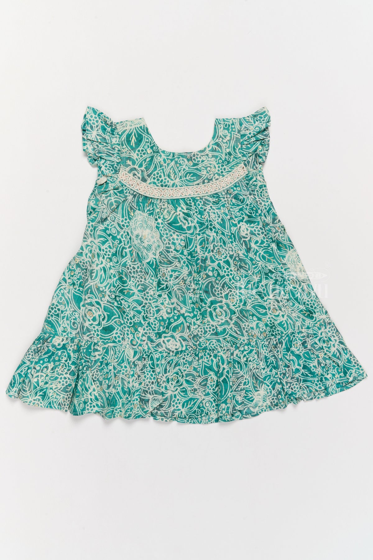 Elevate your little one's style with this charming Cotton One Piece Dress, thoughtfully crafted for comfort and elegance. Made from lightweight Rayon fabric, this dress is adorned with an intricate floral print in soft green tones, evoking a refreshing and natural vibe. The delicate lace detailing at the yoke adds a touch of sophistication, while the ruffled hemline and flutter sleeves create a playful and girly silhouette. Perfect for casual outings or summer gatherings, this dress blends breathable fabric with an airy design, ensuring your child stays cool and comfortable all day long. Whether it's a family outing or a photo shoot, this one-piece cotton frock exudes timeless charm.