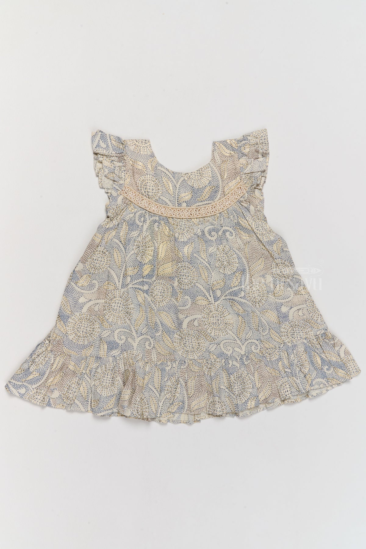 Refresh your little one's wardrobe with this Cotton Fashion Dress, showcasing a sophisticated floral pattern in soft pastel shades. Crafted from breathable Rayon fabric, this dress is as comfortable as it is stylish. The lace detailing on the yoke adds a delicate touch of elegance, while the flutter sleeves and ruffle hemline create a charming and playful look. Perfect for family gatherings or holiday outings, this dress ensures your child stays comfortable throughout the day. Its airy design and timeless aesthetic make it an ideal choice for both casual and special occasions.
