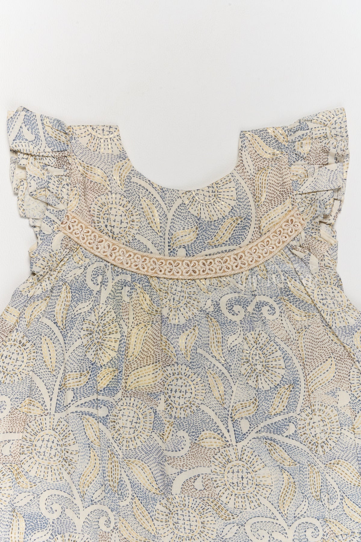 • Design: Floral print, lace yoke, ruffled hemline