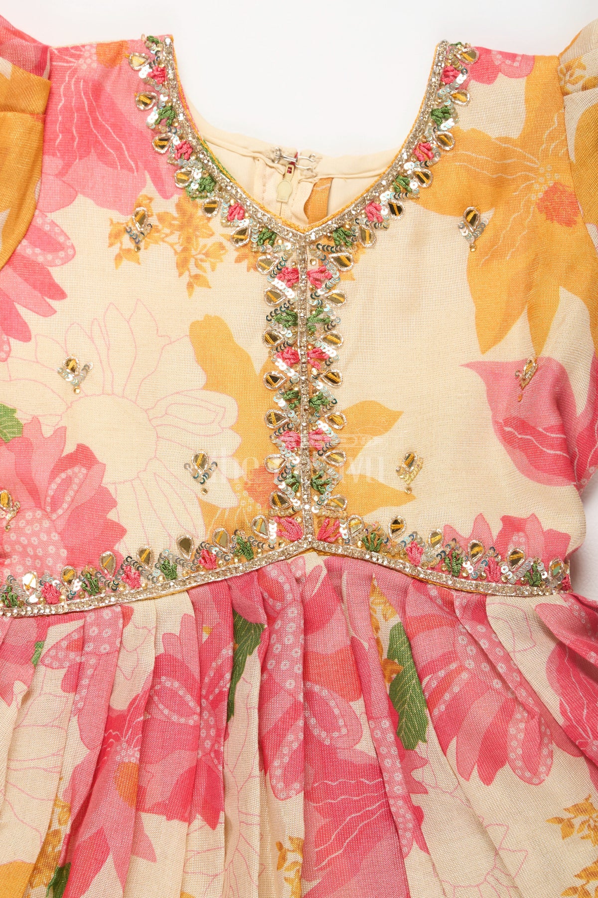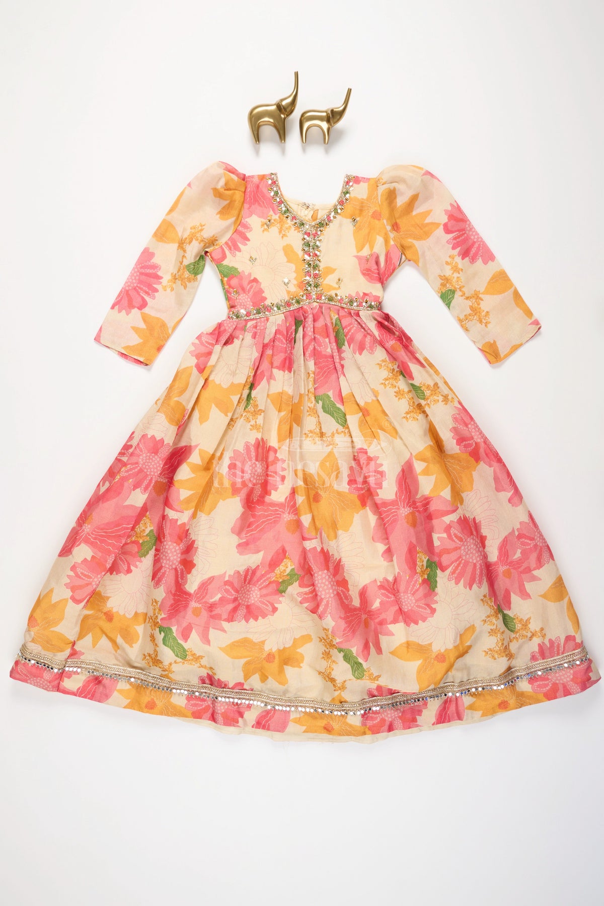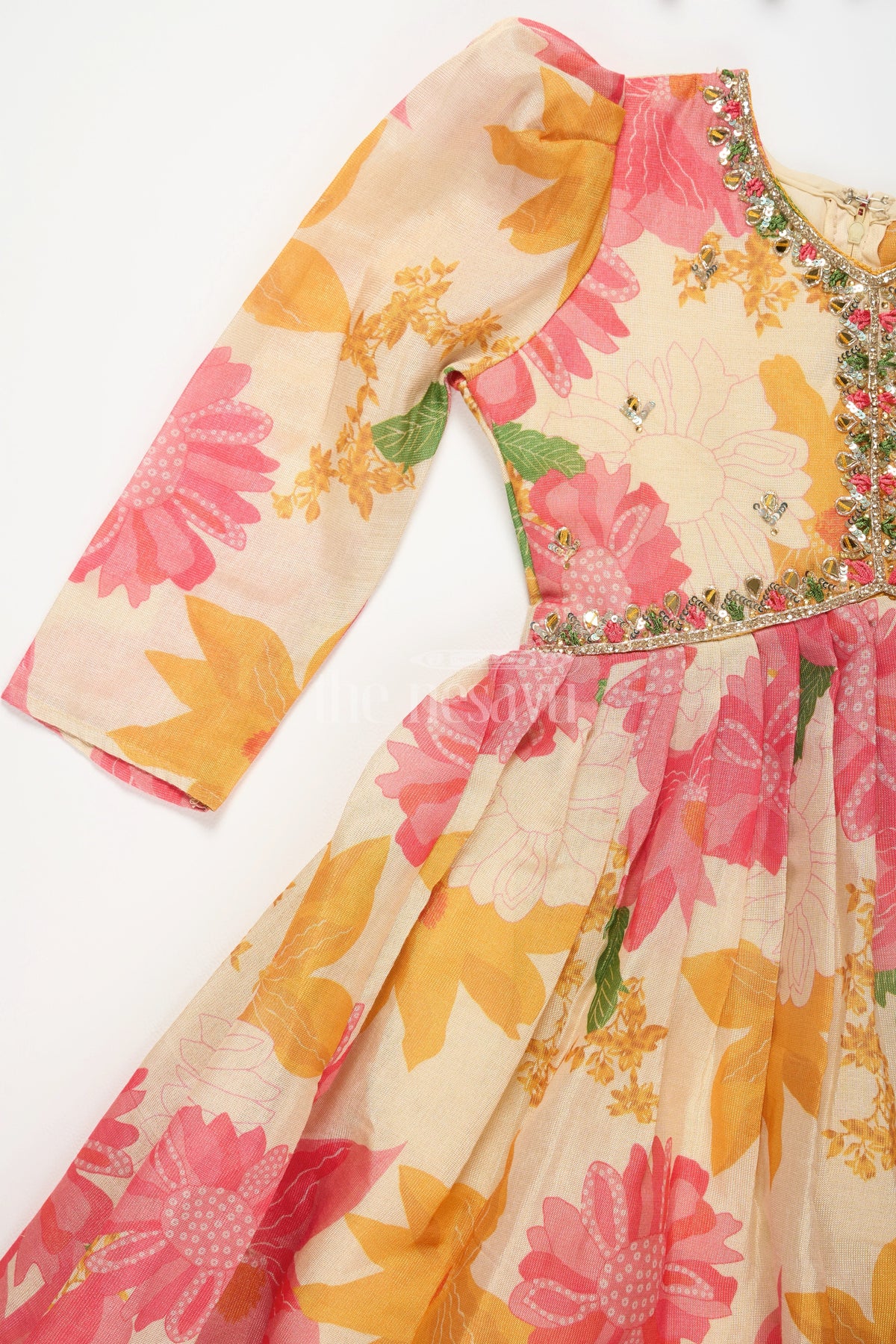 This delightful floral printed gown features vibrant pink and yellow flowers, creating a bright and cheerful look. The fitted bodice is enhanced with a V-neckline adorned with shimmering mirror work, adding charm to the design. The long, flared skirt is perfect for twirling, making this dress a playful yet elegant choice for casual or festive occasions. Crafted from breathable fabric, it ensures comfort and style, while the long sleeves add a layer of sophistication. The gown’s intricate floral embroidery and mirror detailing make it a standout piece for any event.