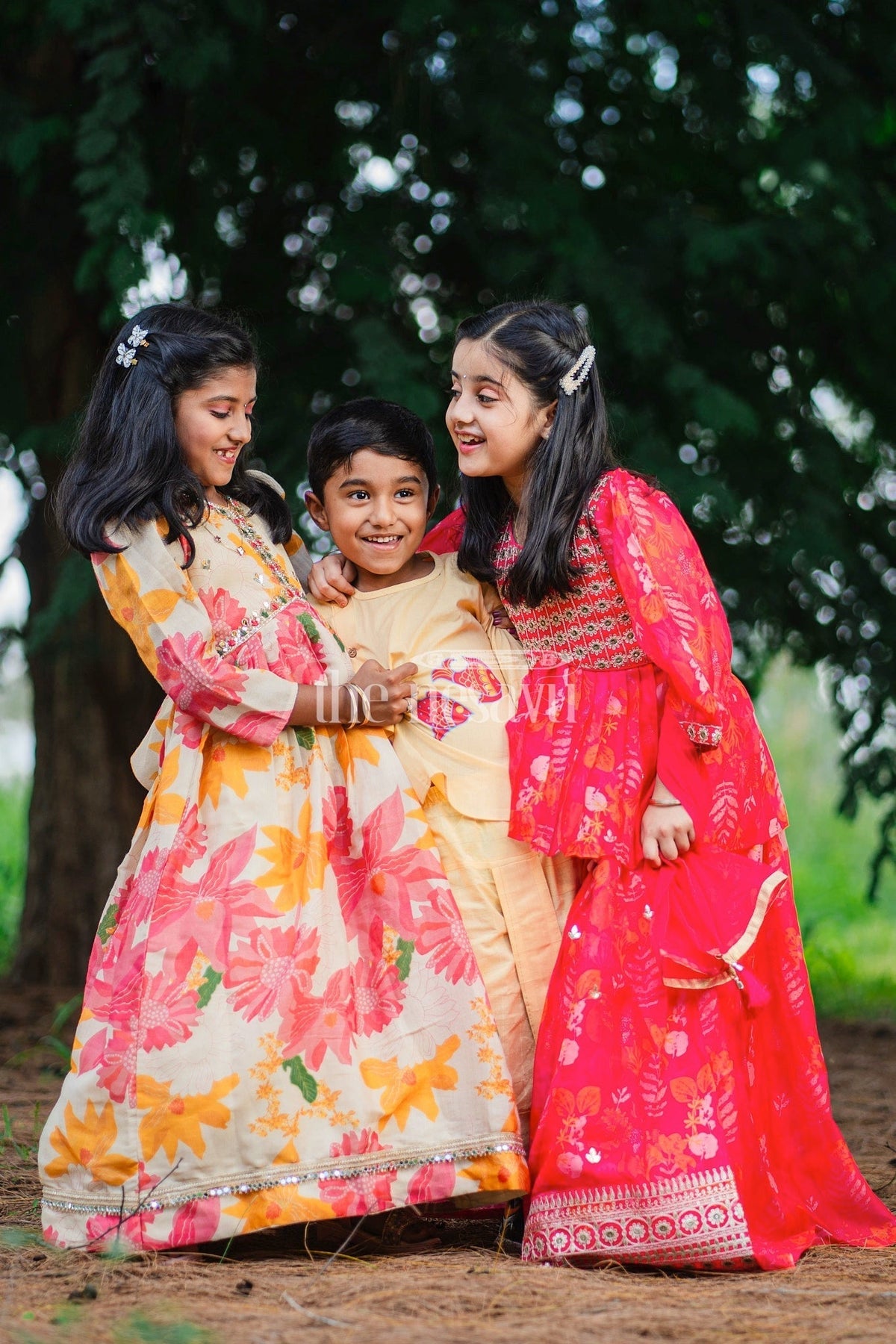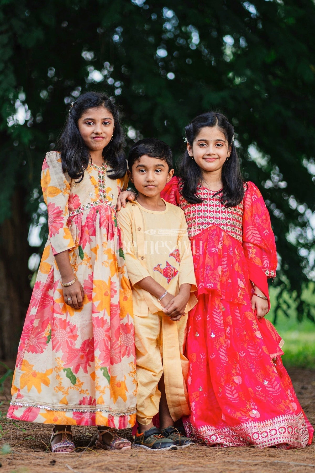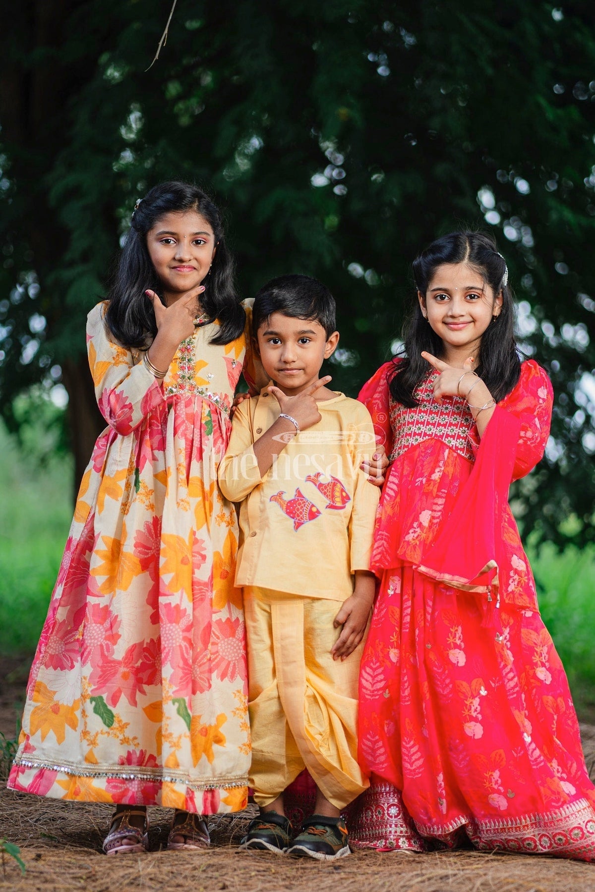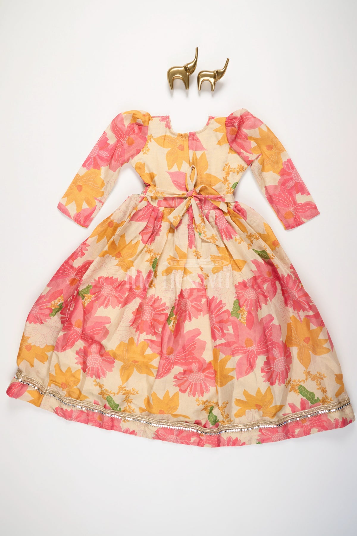 This delightful floral printed gown features vibrant pink and yellow flowers, creating a bright and cheerful look. The fitted bodice is enhanced with a V-neckline adorned with shimmering mirror work, adding charm to the design. The long, flared skirt is perfect for twirling, making this dress a playful yet elegant choice for casual or festive occasions. Crafted from breathable fabric, it ensures comfort and style, while the long sleeves add a layer of sophistication. The gown’s intricate floral embroidery and mirror detailing make it a standout piece for any event.