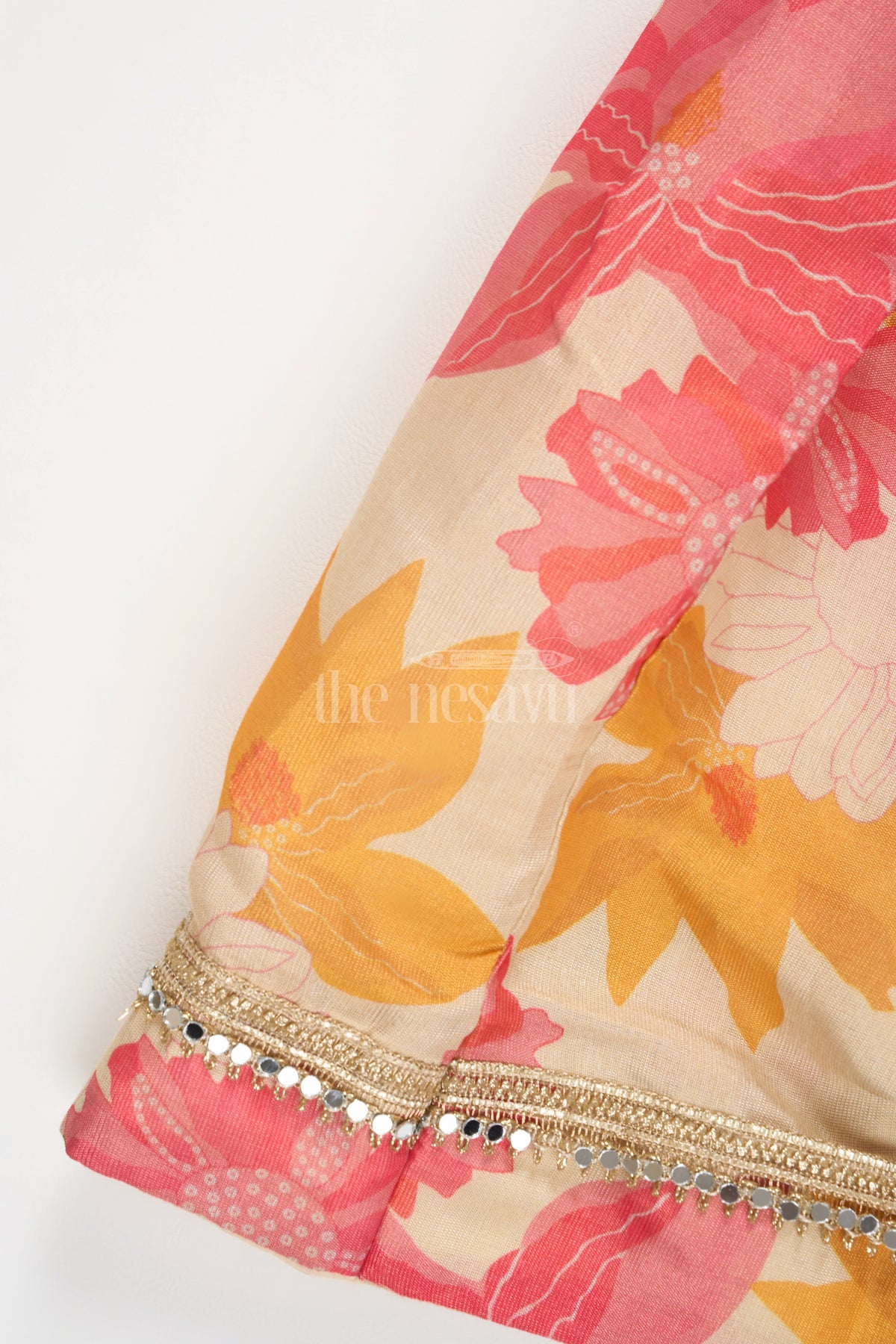 The Nesavu Girls Party Gown White and Pink Floral Girls Party Gown with Sequin and Mirror Embellishments for Festive Events Nesavu 24 (5Y) / multicolor GA268A-24 Nesavu White Pink Floral Girls Gown Mirror Embellishments Flared Skirt Festive Events