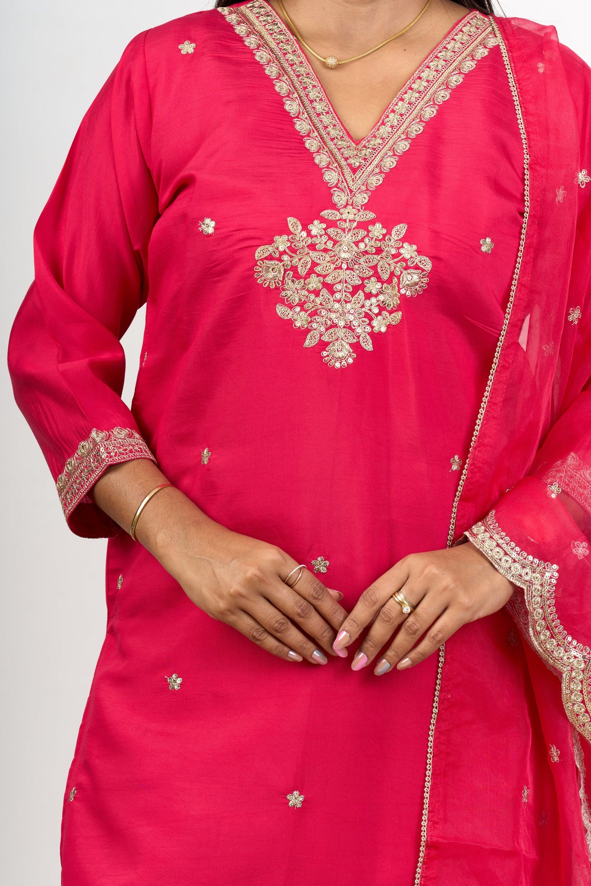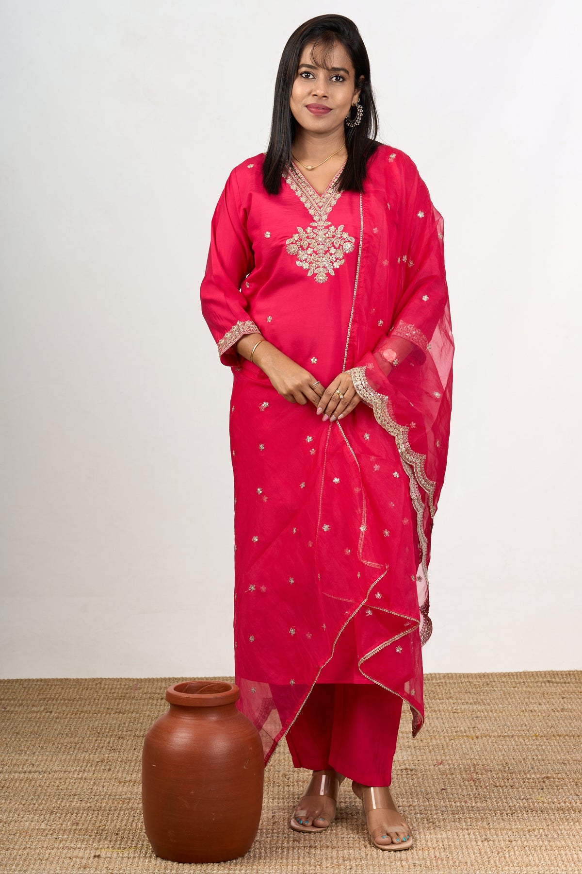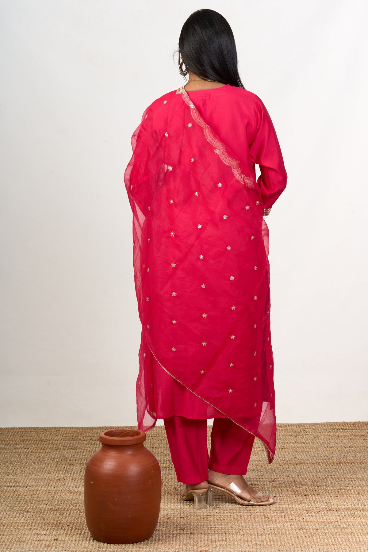 Make a bold statement at Lohri celebrations with this stunning red suit set. Designed with luxurious blend silk fabric, the kurta features detailed gold zari embroidery along the neckline, hem, and sleeves. The sheer red dupatta is adorned with elegant gold scalloped borders that exude grandeur. Paired with comfortable straight-cut pants, this ensemble blends traditional craftsmanship with modern comfort. Perfect for festive gatherings, family functions, and cultural celebrations, this outfit radiates elegance and class.
