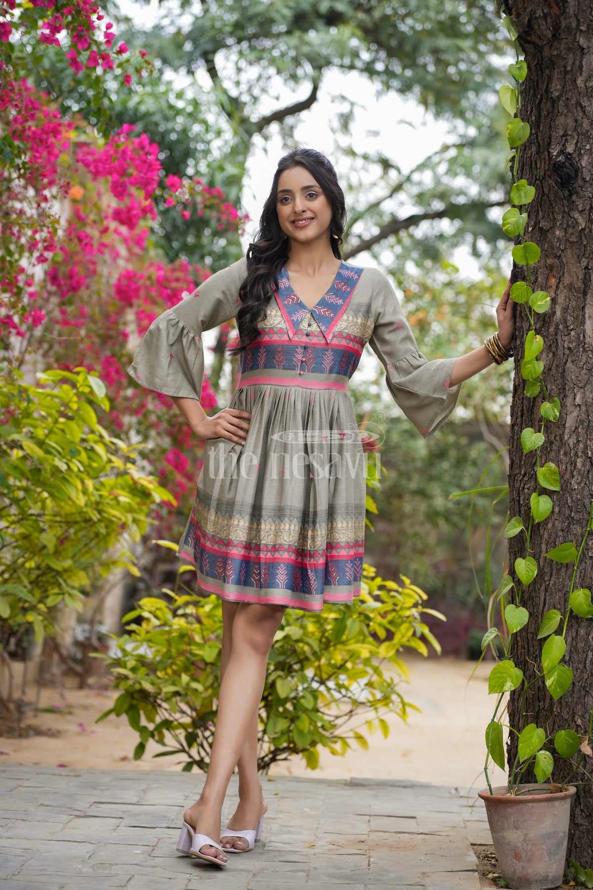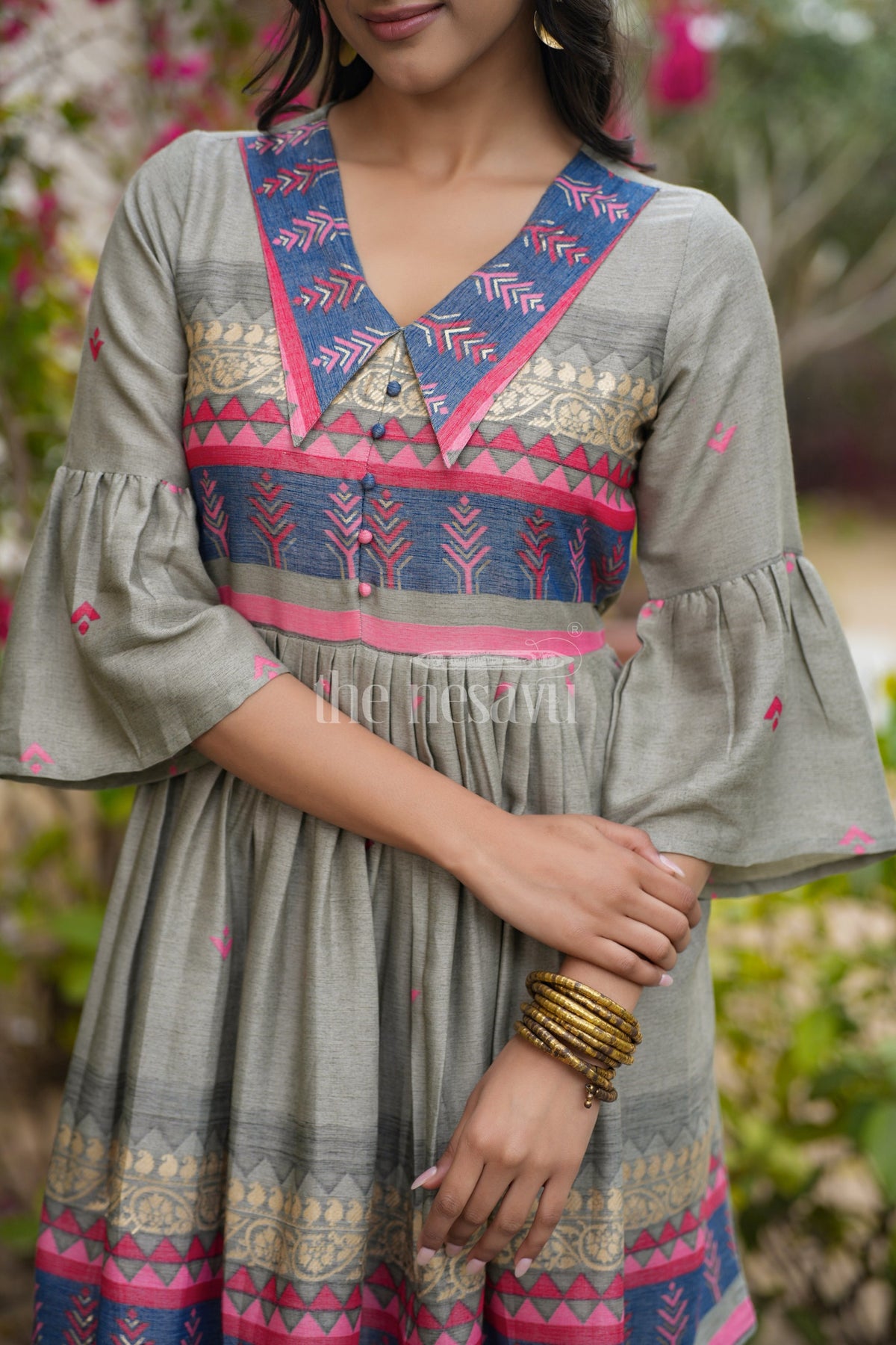 Celebrate the festive season in style with Nesavu charming grey Christmas outfits for ladies, crafted from lightweight georgette for a flowing and elegant silhouette. This dress features subtle pink accents and embroidered details, creating a festive yet sophisticated look. The V-neckline and flared design are complemented by three-quarter bell sleeves, adding a touch of grace and femininity. Perfect for Christmas celebrations, holiday dinners, or family gatherings, this dress blends comfort and style effortlessly. Its breathable fabric and intricate design make it a must-have for the winter festive season.