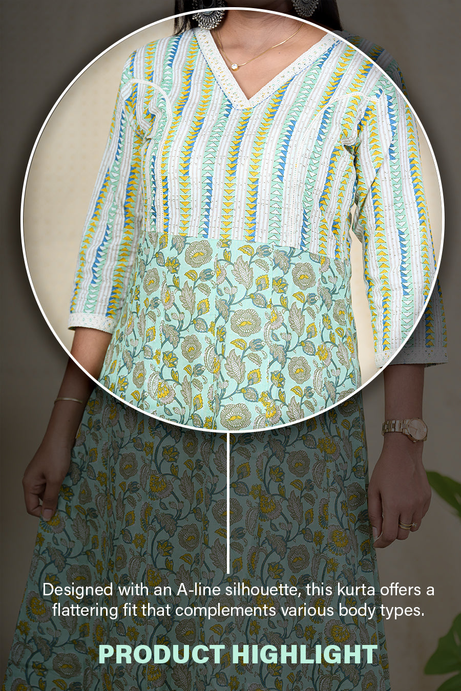 Elevate your daily wear wardrobe with this designer cotton kurta for women, crafted from pure cotton. The kurta features an exquisite hand block print that beautifully combines traditional craftsmanship with modern aesthetics. Adorned with embroidered lace detailing, this kurta is perfect for casual outings and daily wear, offering both comfort and style.