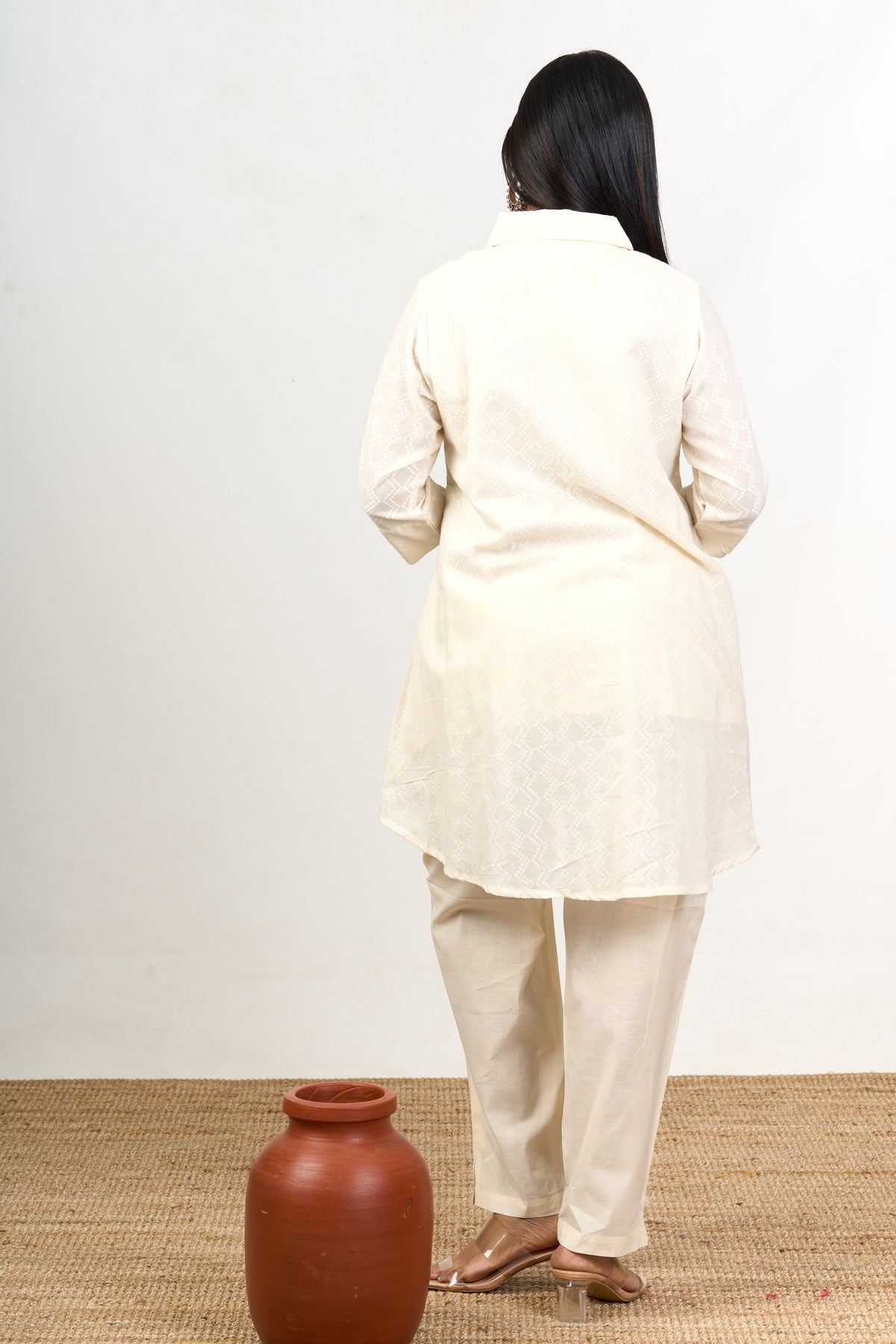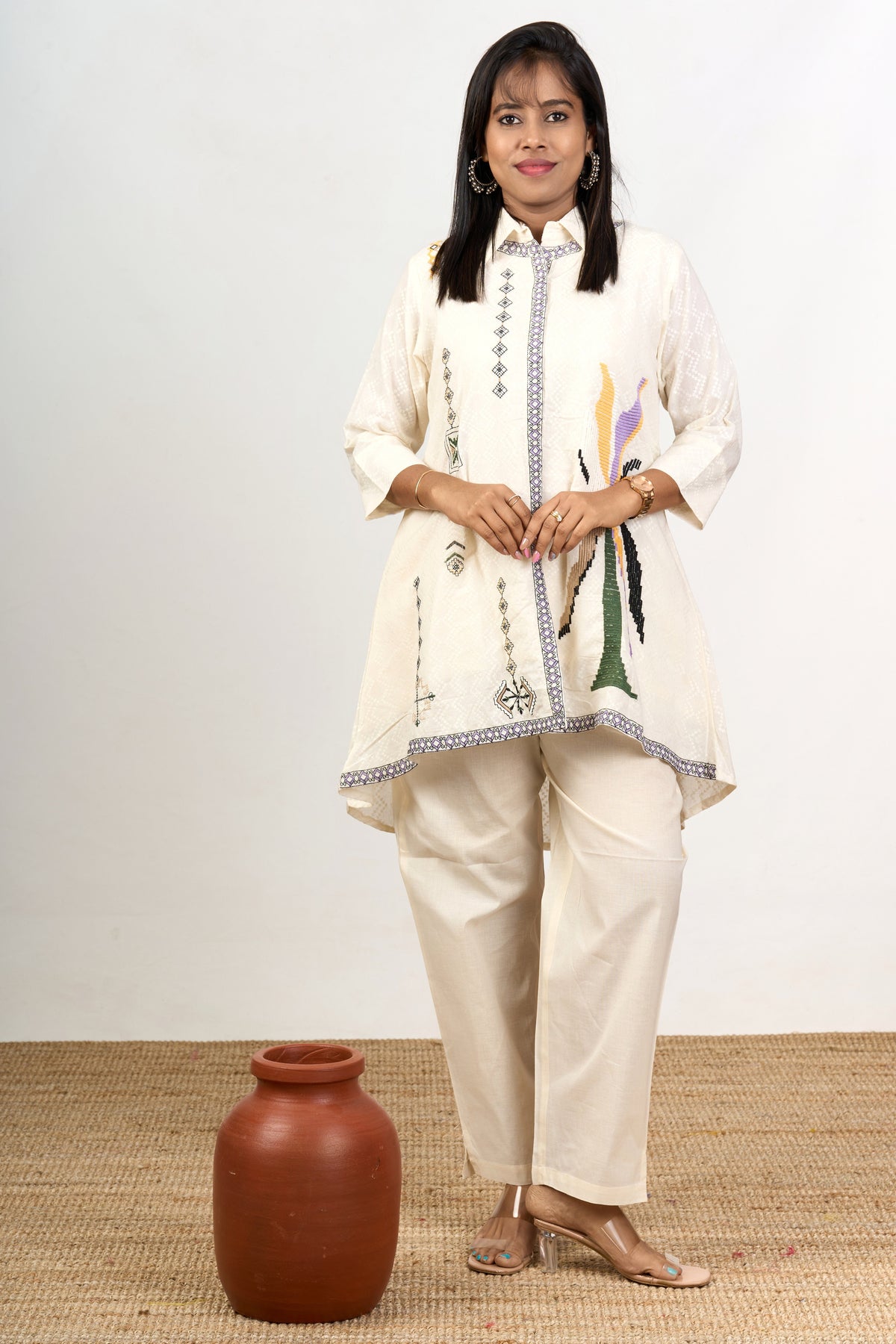 Redefine elegance with this knitted co-ord trouser set for women, crafted from soft, breathable cotton fabric. The ensemble showcases a modern design with straight trousers and an asymmetrical shirt top adorned with delicate geometric patterns and embroidered details. This outfit offers an impeccable fit, making it a versatile addition to your collection. The neutral tones combined with intricate embroidery create a timeless look that suits any formal gathering, office setting, or casual outing. Experience all-day comfort while exuding grace and sophistication.