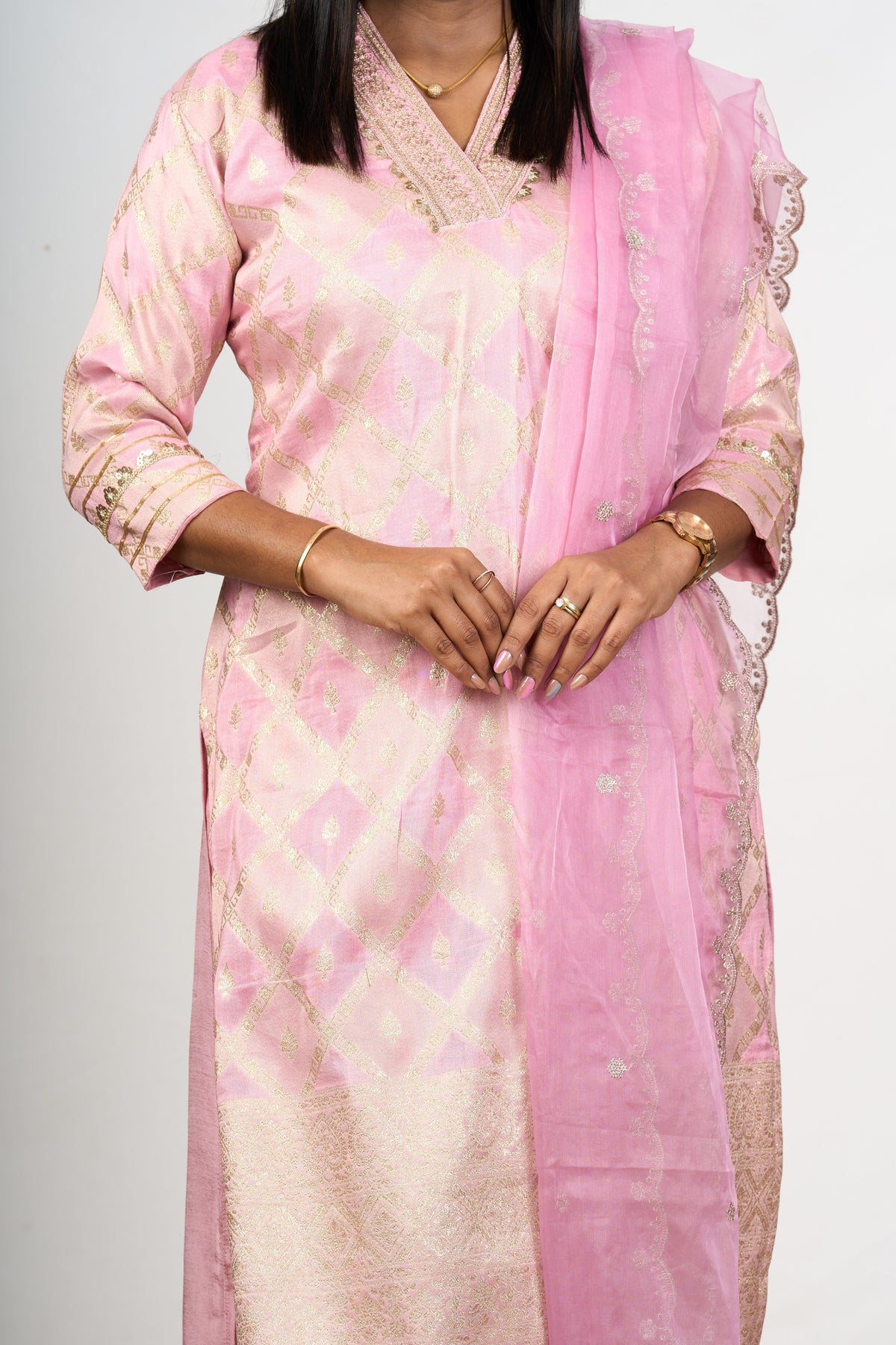 Make a statement at your next special occasion with this ethnic kurta set for wedding, designed in luxurious pink art silk. The kurta features intricate gold motifs throughout, highlighted by a delicately embroidered neckline and sleeves. The tailored pants and a sheer dupatta with matching embroidery and tassel detailing complete this opulent ensemble. Perfect for wedding celebrations or elegant events like formal gatherings, this outfit ensures a timeless and sophisticated look. The art silk material adds a regal touch while maintaining lightweight comfort for long hours of wear.